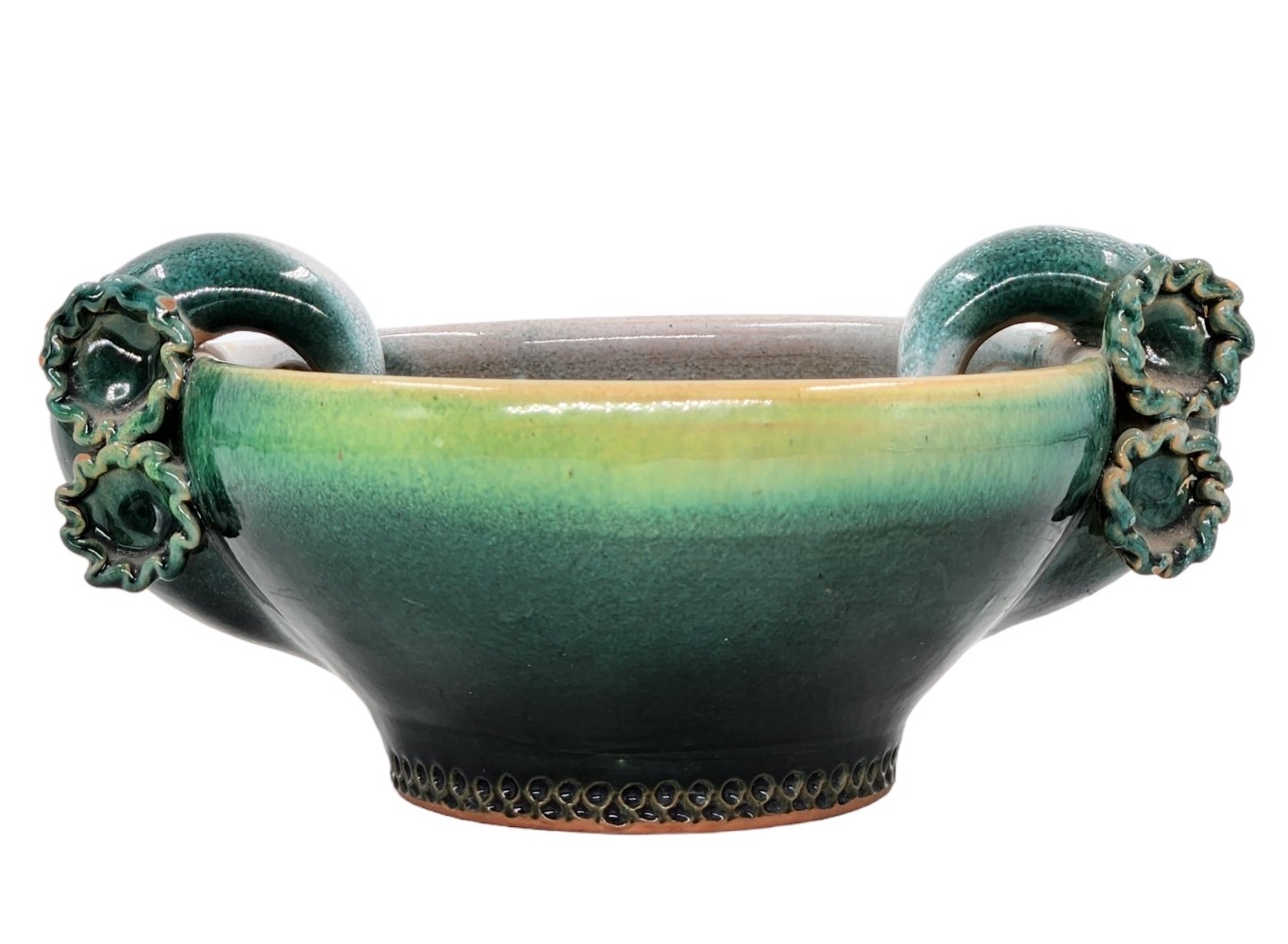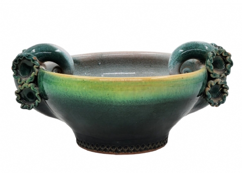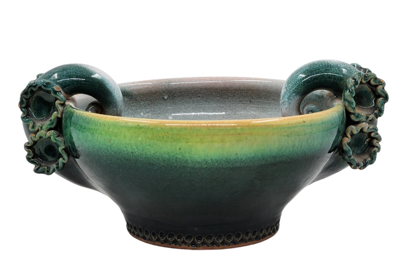 כלי קרמיקה בסגנון אר דקו, מעוטר בזיגוג בגווני ירוק וכחול, לא חתום, גובה: 10 ס"מ, רוחב כולל ידיות: 20 ס"מ.