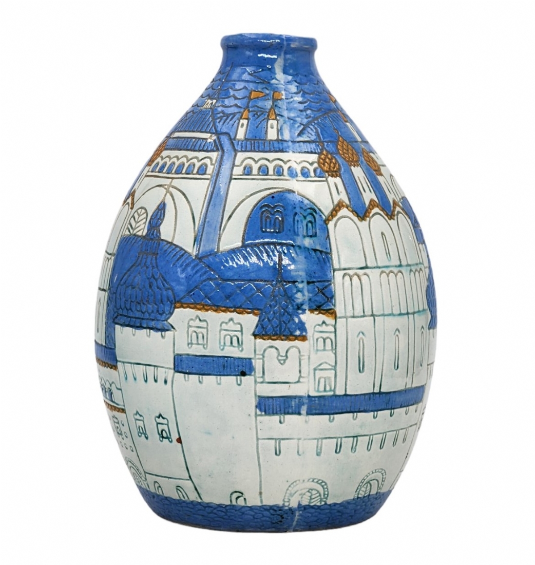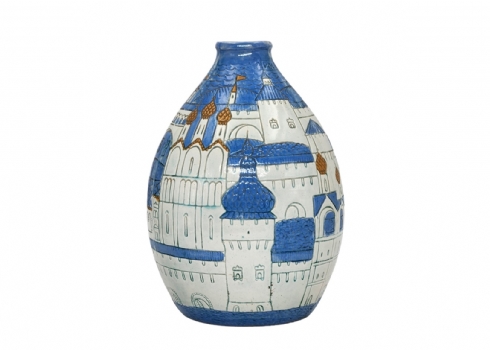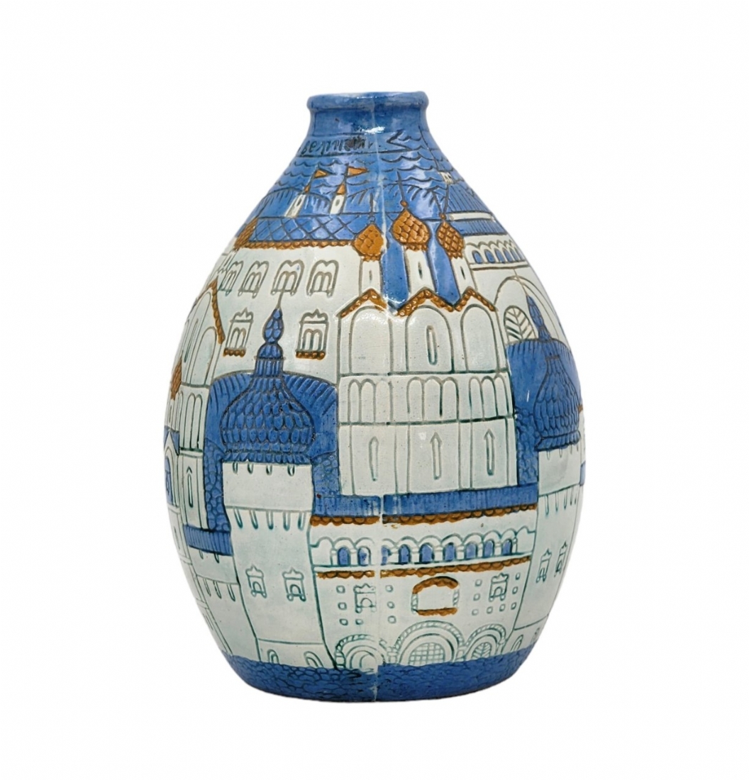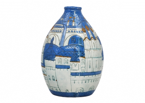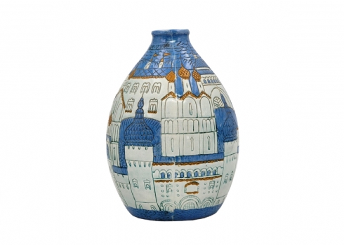 כד קרמיקה דקורטיבי כפי הנראה רוסי מעוטר עיטורי בלט של כנסיות רוסיות אורתודוקסיות