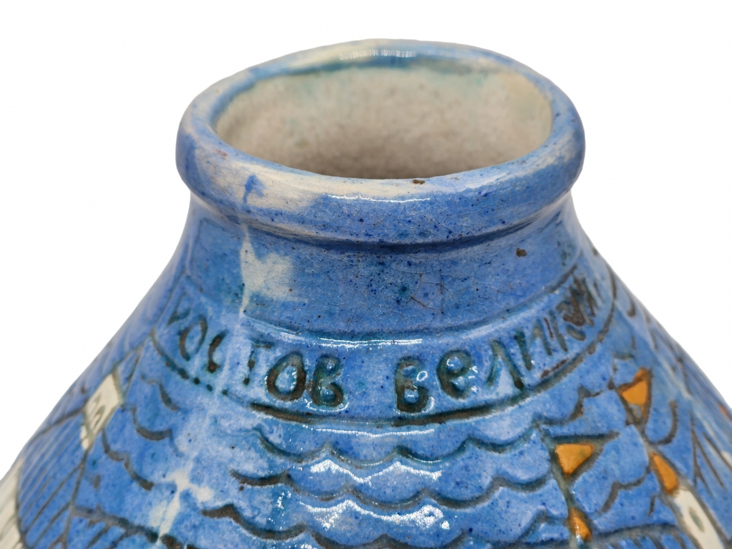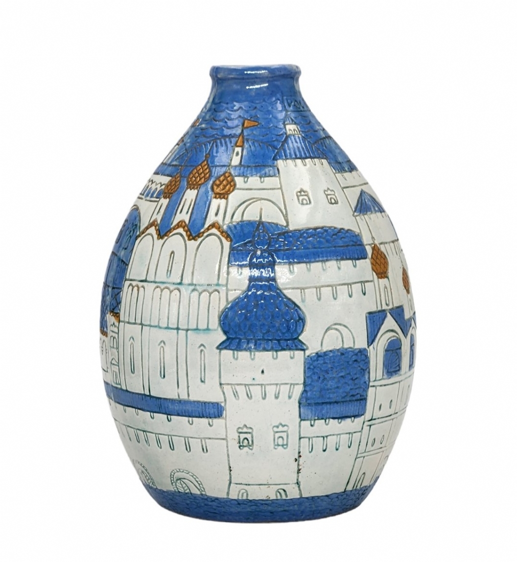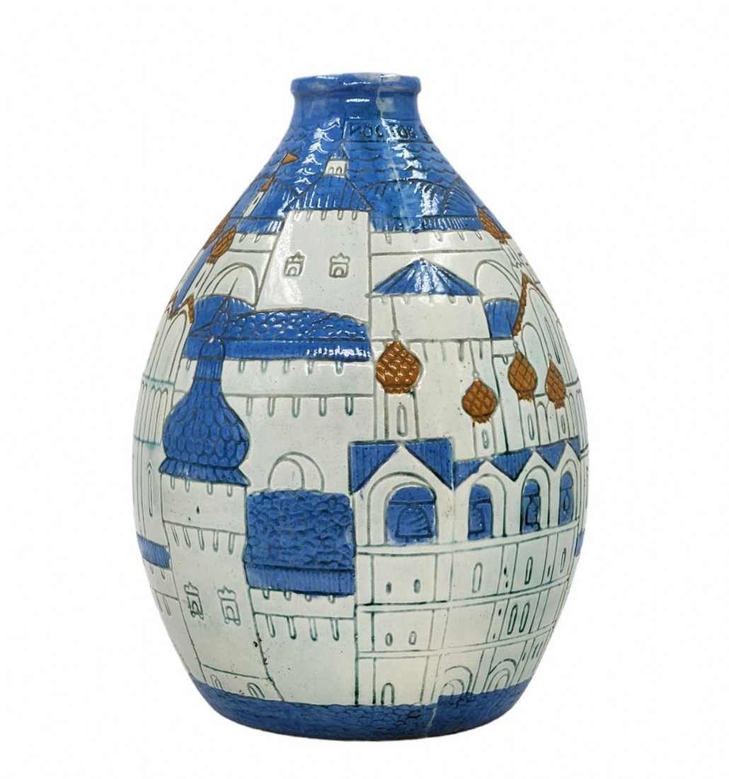 כד קרמיקה דקורטיבי כפי הנראה רוסי מעוטר עיטורי בלט של כנסיות רוסיות אורתודוקסיות