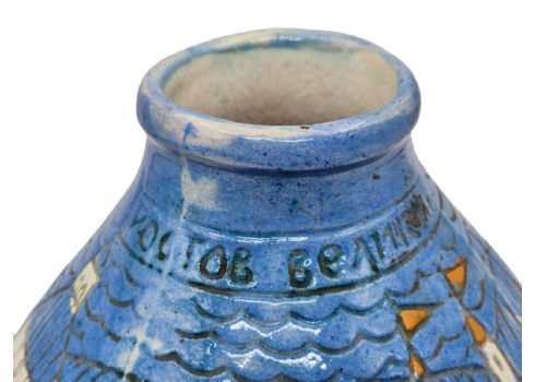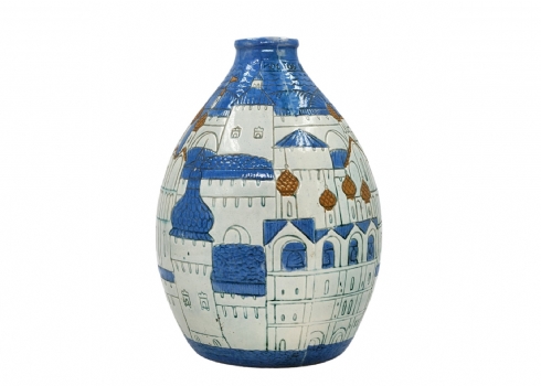 כד קרמיקה דקורטיבי, כפי הנראה רוסי, מעוטר עיטורי בלט של כנסיות רוסיות אורתודוקסיות, צביעת יד באמייל, חתום, רוחב: 18 ס"מ, גובה: 27 ס"מ.