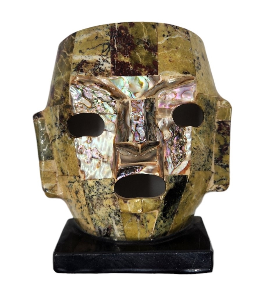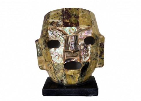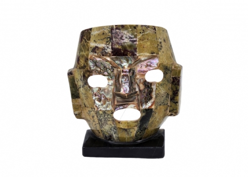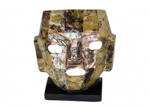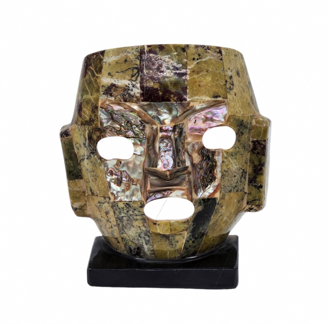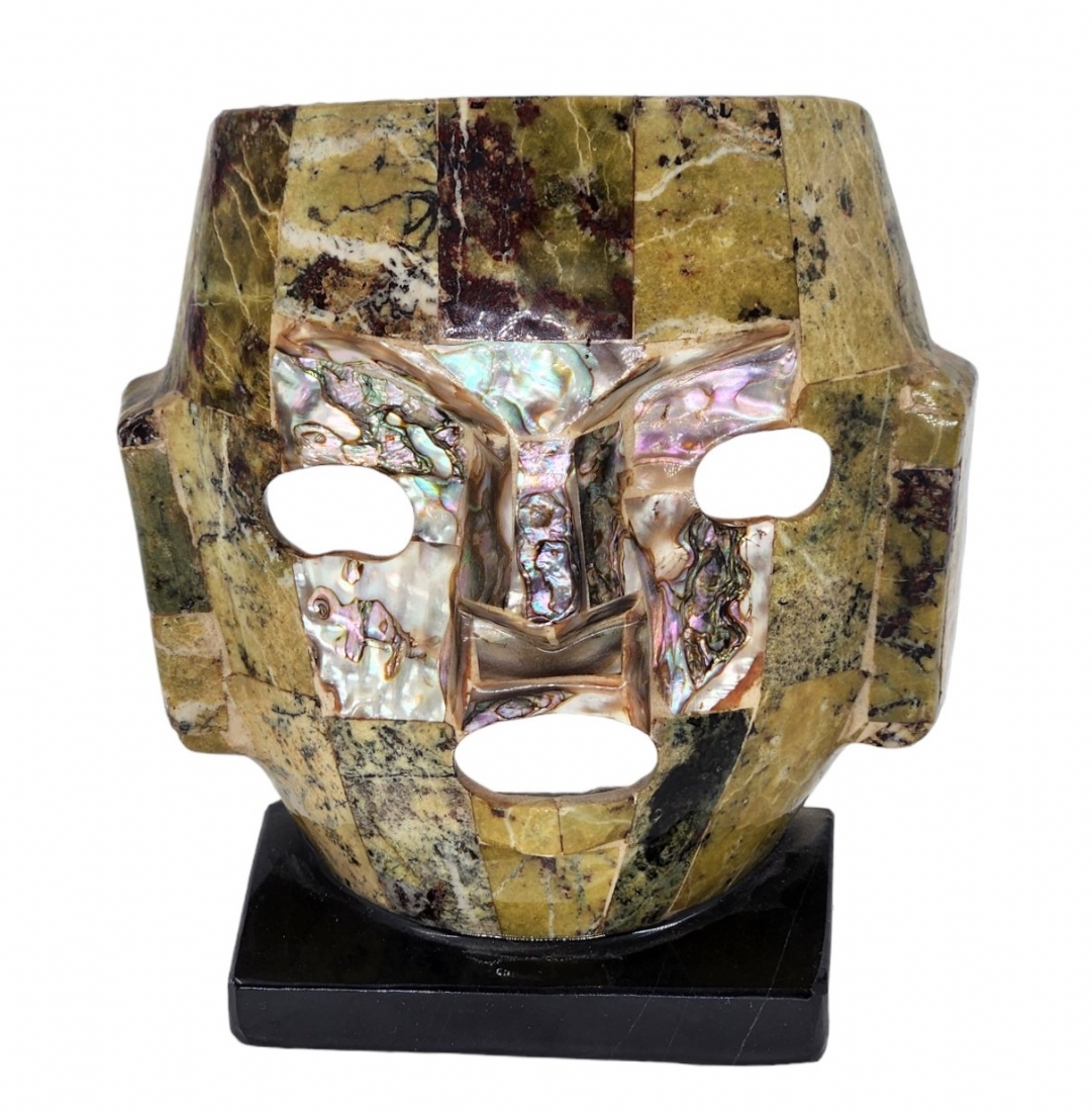 קישוט שולחני מדרום אמריקה בצורת מסכת קבורה (של אנשי האינקה / מאיה / אצטקים), עשויה בעבודת מוזאיקה מאבנים טבעיות ופיסות של אם הפנינה, בסיס אבן שחורה, גובה כולל הבסיס: 14.5 ס"מ, רוחב: 13.5 ס"מ.