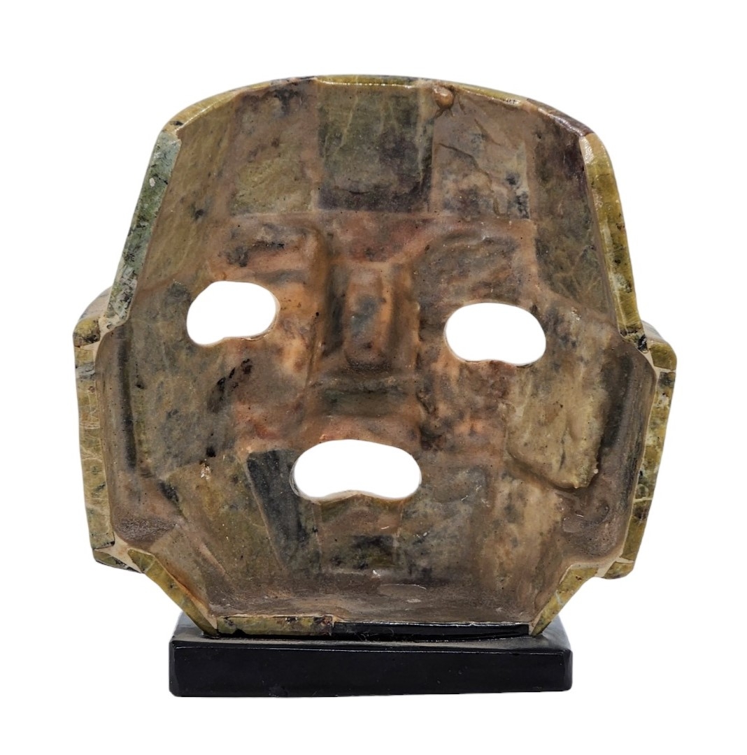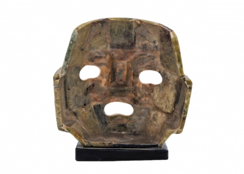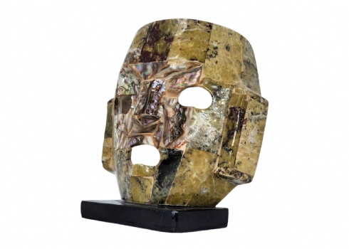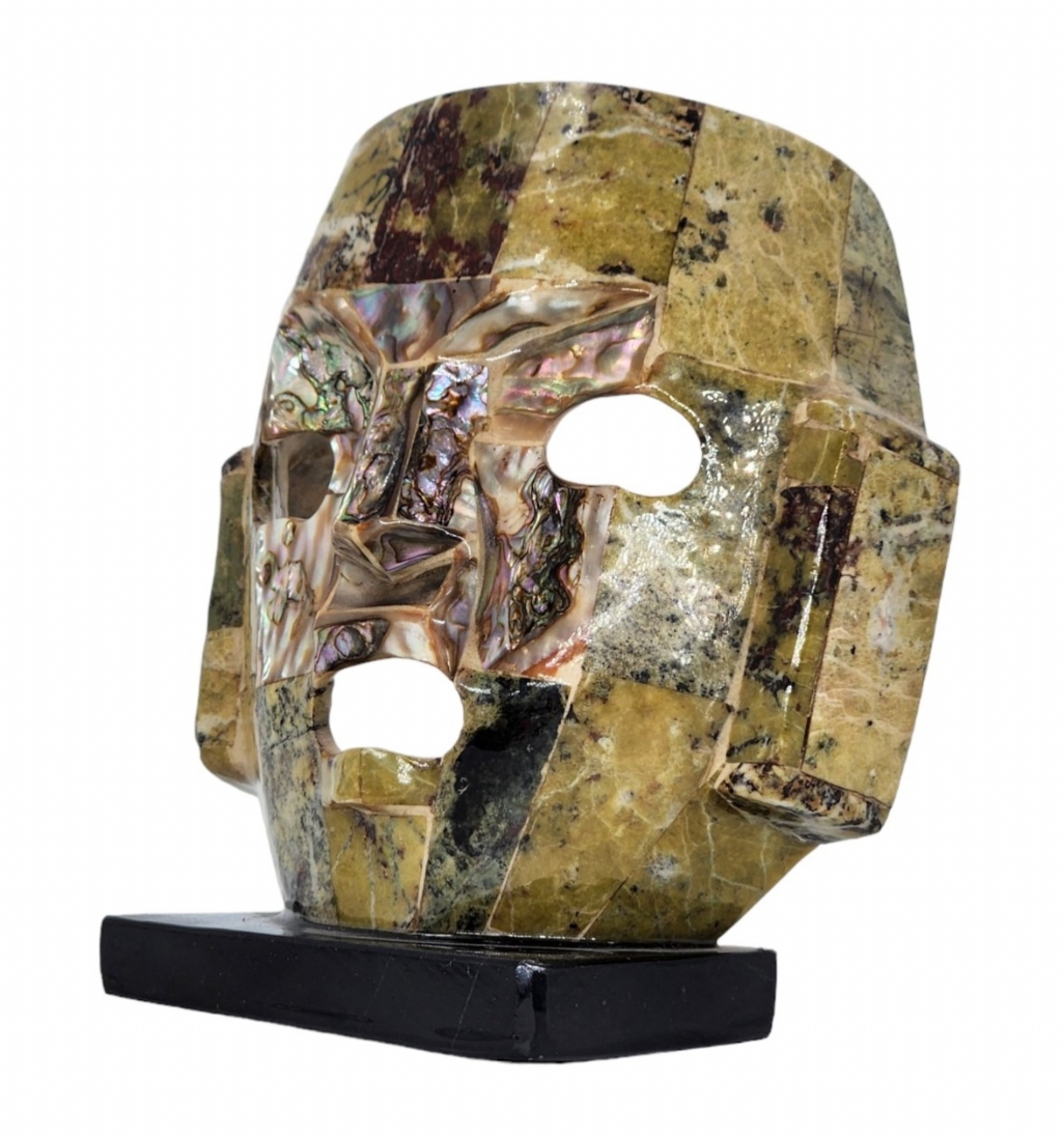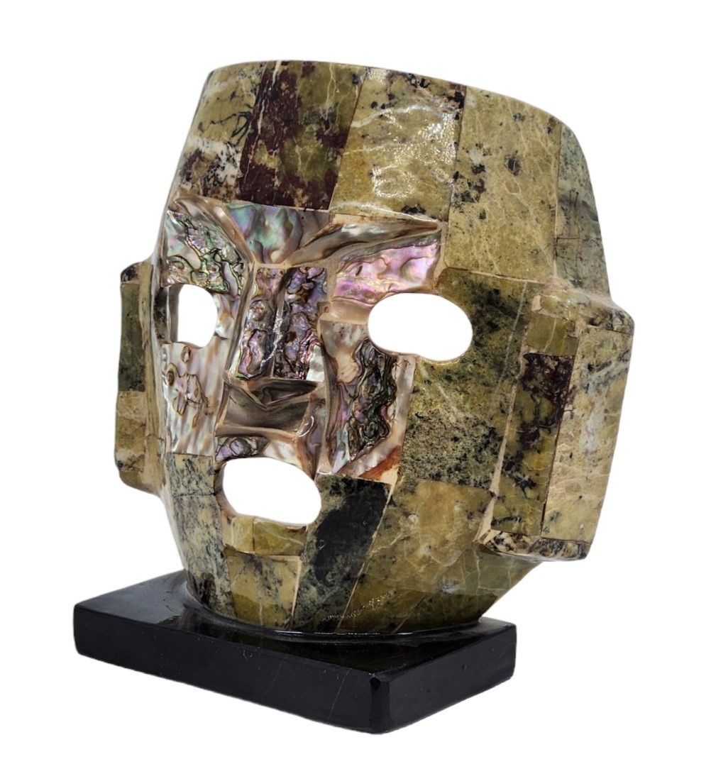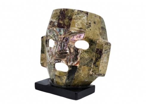קישוט שולחני מדרום אמריקה בצורת מסכת קבורה (של אנשי האינקה / מאיה / אצטקים), עשויה בעבודת מוזאיקה מאבנים טבעיות ופיסות של אם הפנינה, בסיס אבן שחורה, גובה כולל הבסיס: 14.5 ס"מ, רוחב: 13.5 ס"מ.