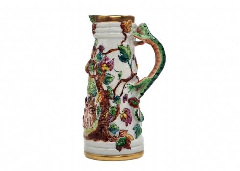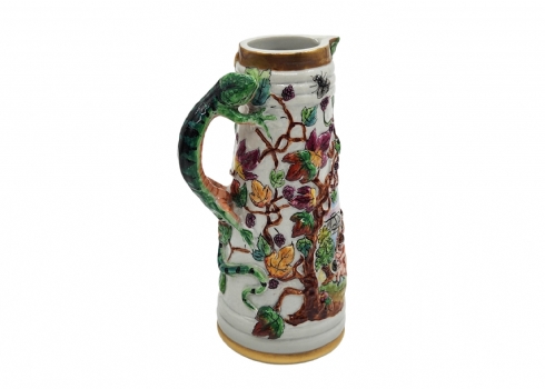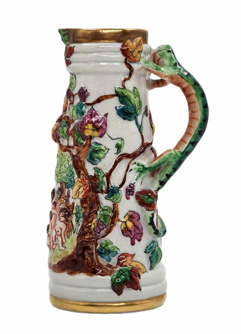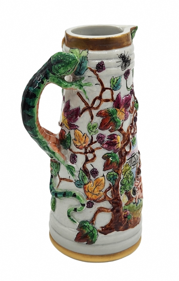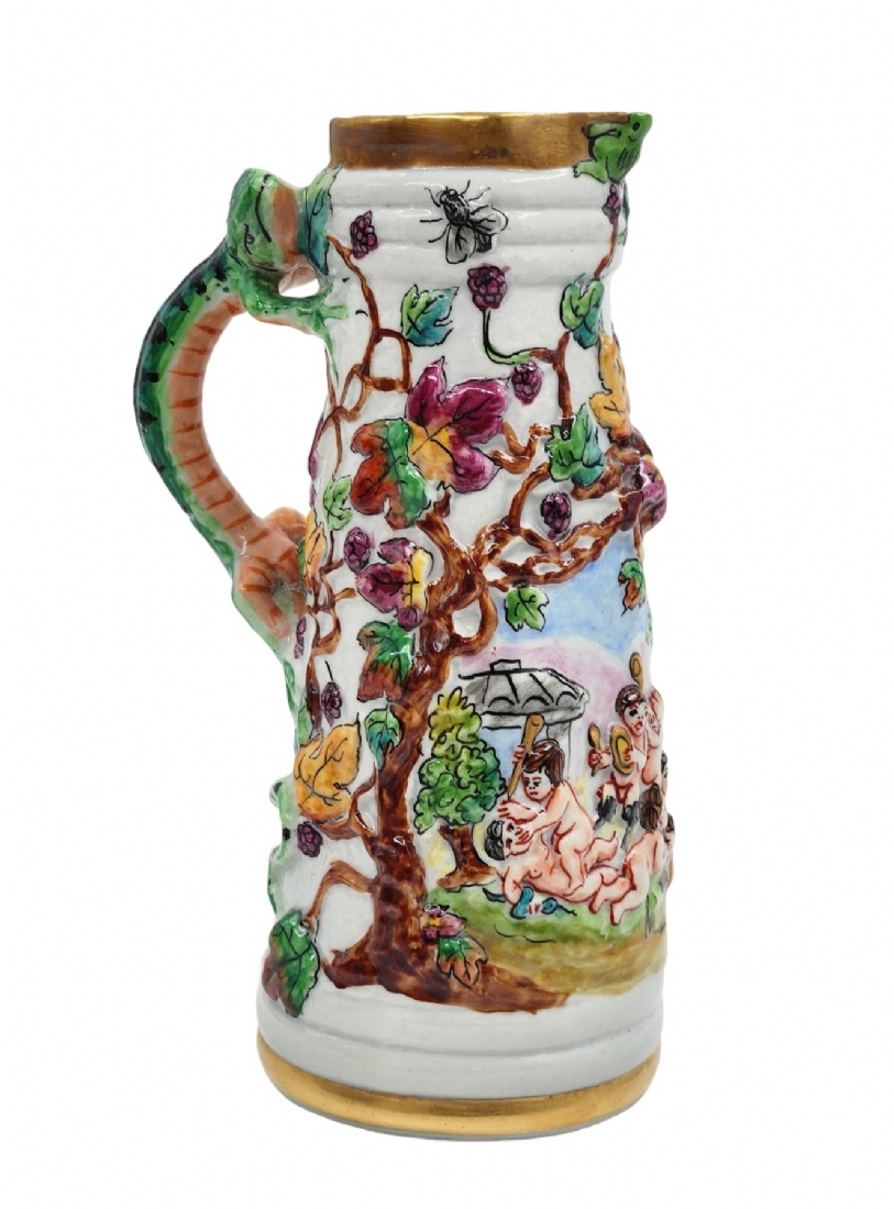 קנקן חרסינה דקורטיבי מעוטר עיטורי בלט של ילדים בחגיגת הבציר, ידית מפוסלת בדמות לטאה ירוקה, צביעת יד באמייל ובזהב, חתום, רוחב כולל ידית: 10 ס"מ, גובה: 17 ס"מ.