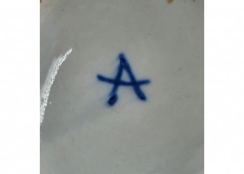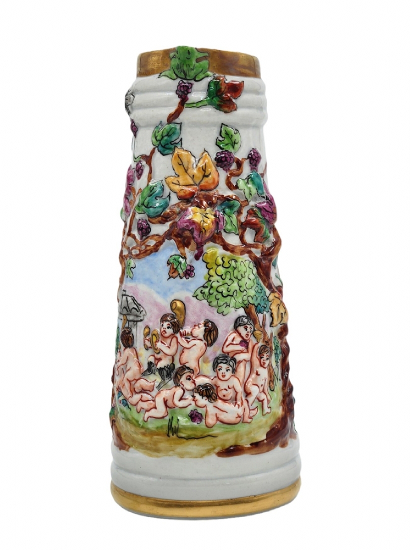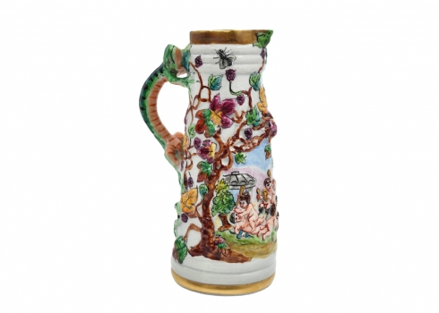קנקן חרסינה דקורטיבי מעוטר עיטורי בלט של ילדים בחגיגת הבציר, ידית מפוסלת בדמות
