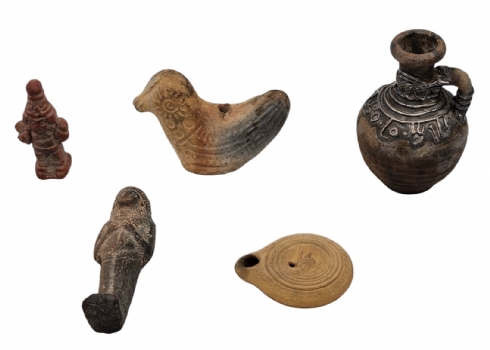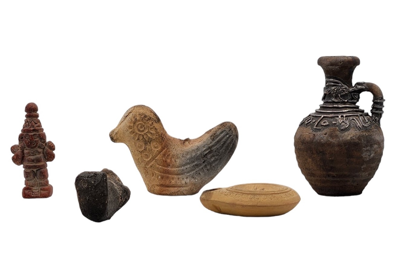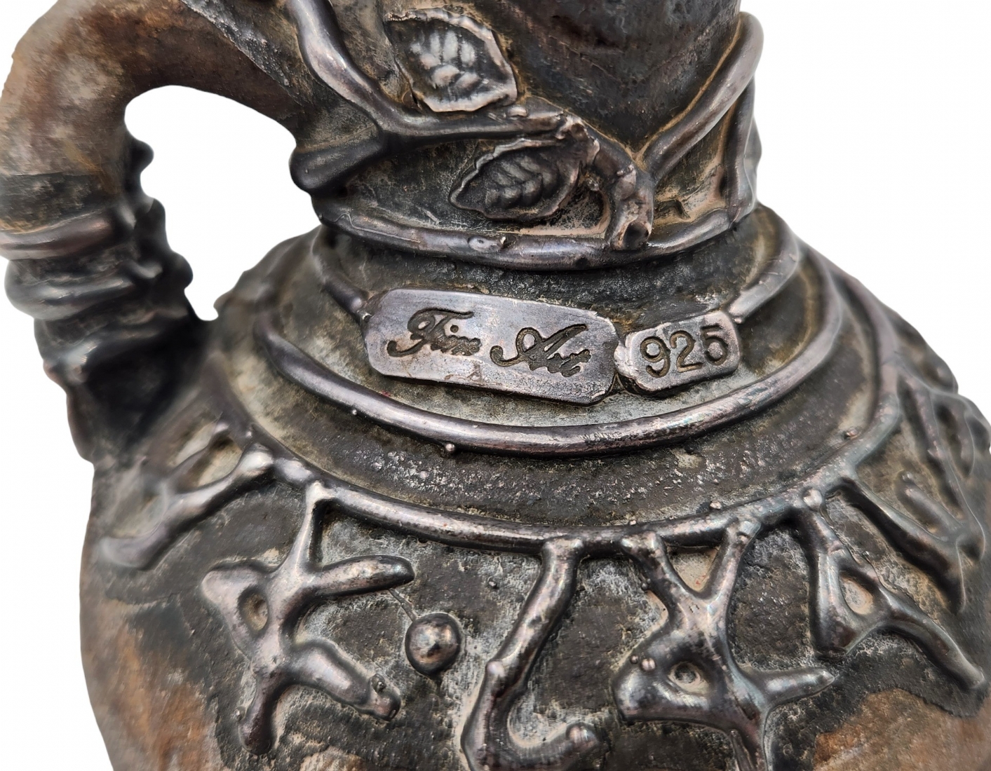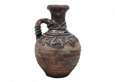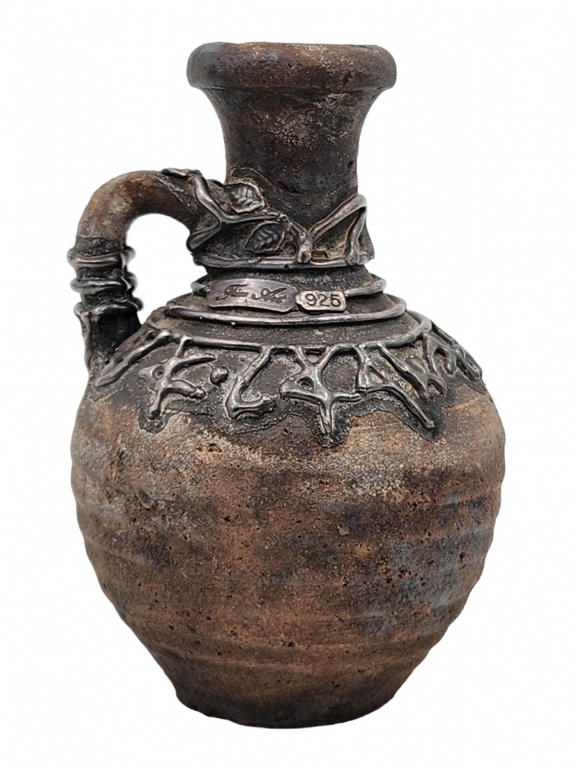 לוט של 5 חפצי נוי עשויים חרס, יצרנים ודגמים שונים, הכד מעוטר עיטורי כסף סטרלינג