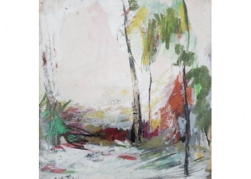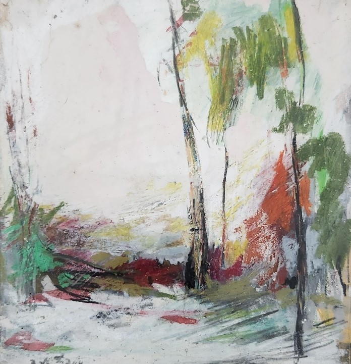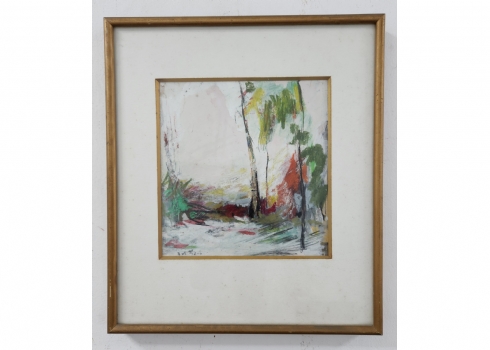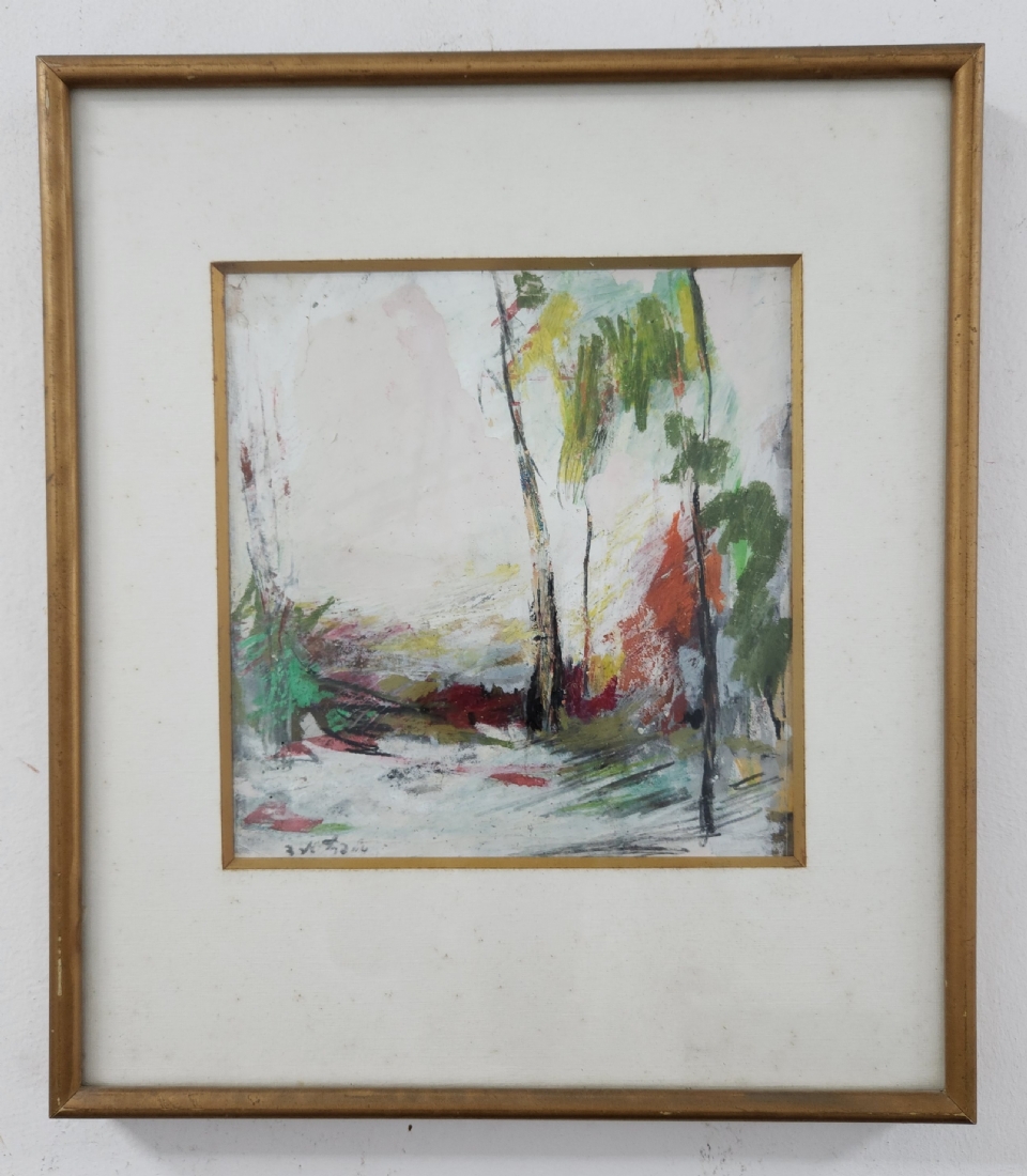 אסתר פרץ- ארד (Esther Peretz Arad) - 'שלושה עצים בנוף', שמן וגואש על נייר, חתום, מידות: 23X22 ס"מ, מידות המסגרת: 40X35 ס"מ.