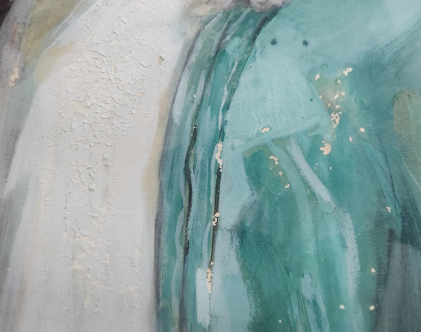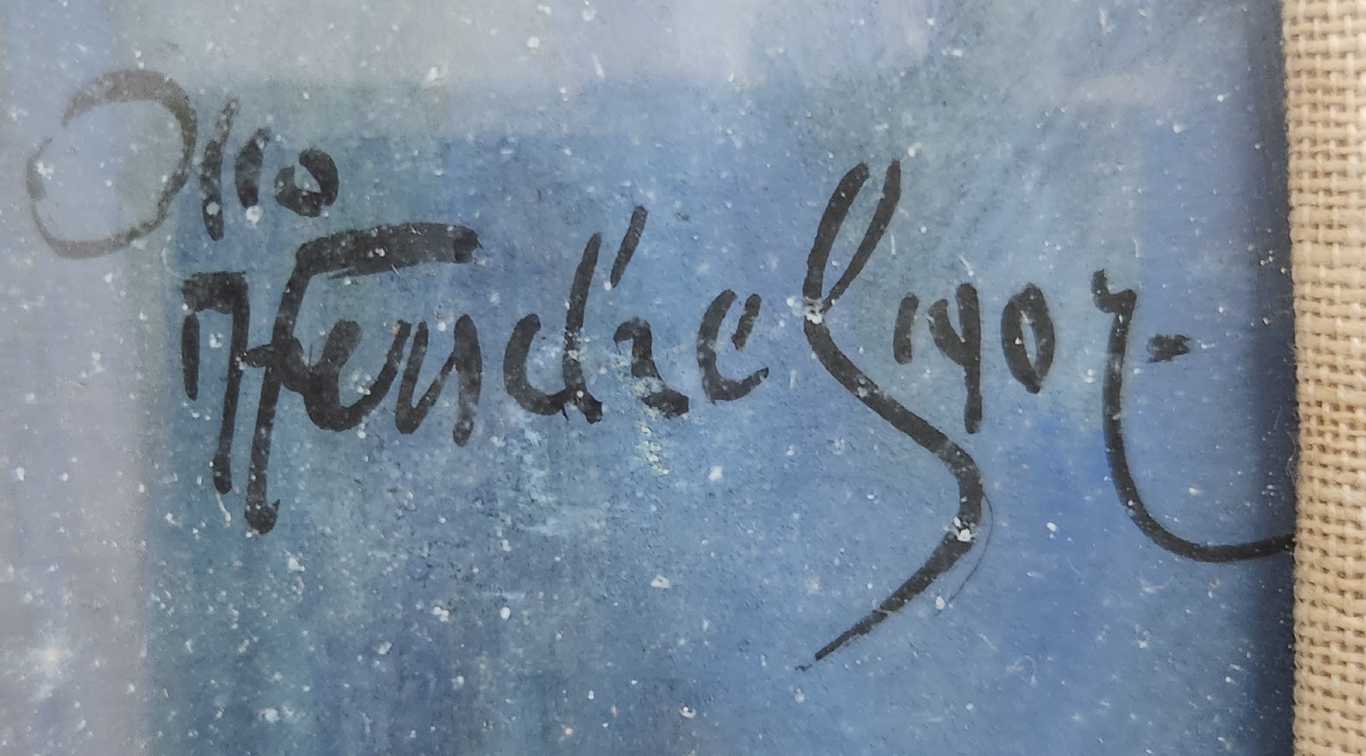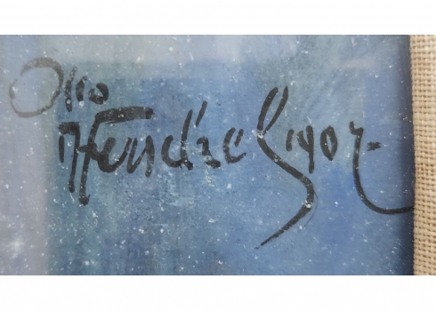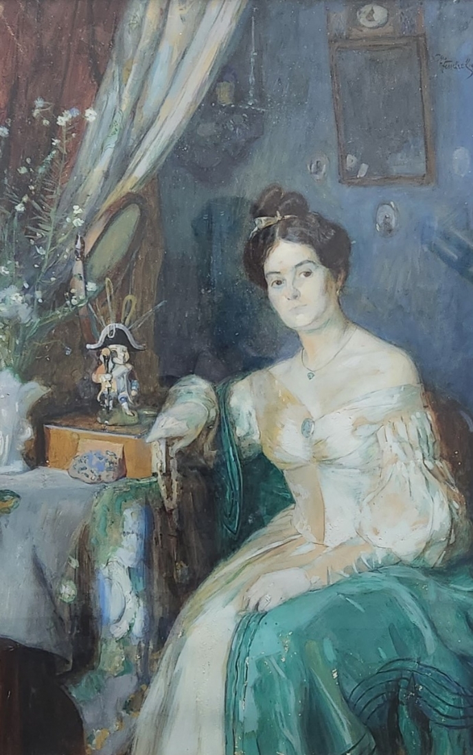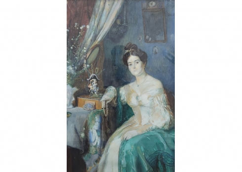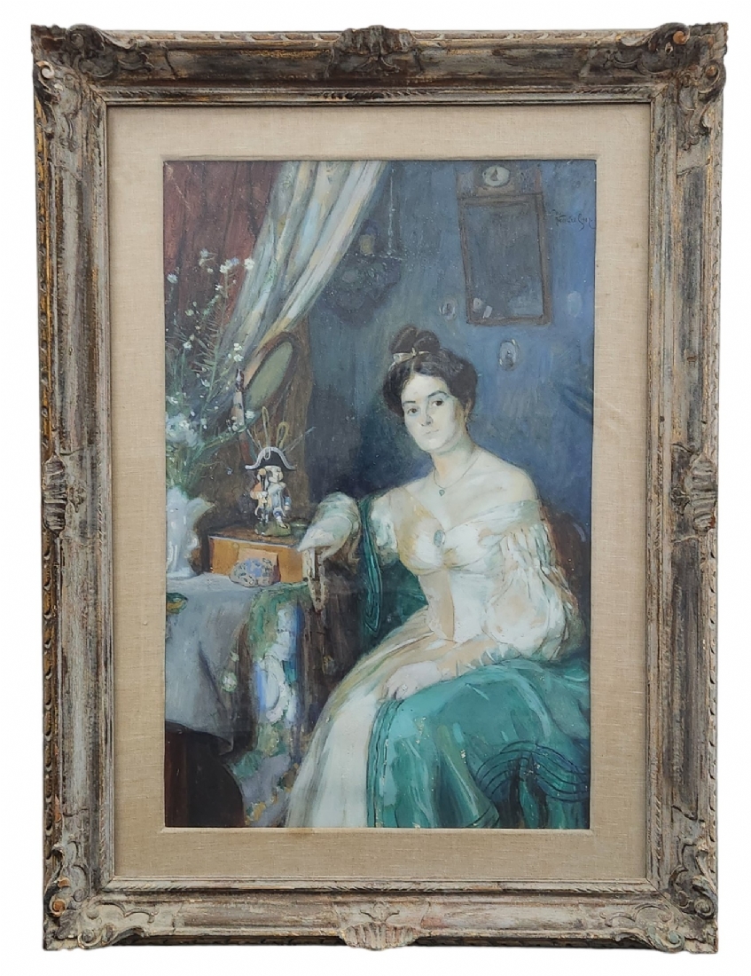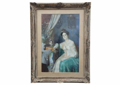 'אצילה ליד שולחן' - גואש ואקוורל על נייר (קילופי צבע רבים), חתום ומתוארך 1907, מידות: 86X55 ס"מ, מידות המסגרת: 118X87 ס"מ.
