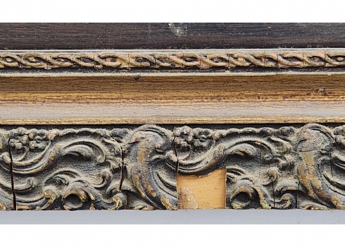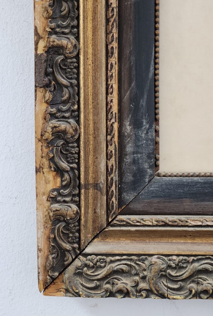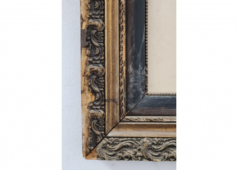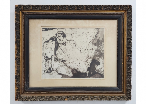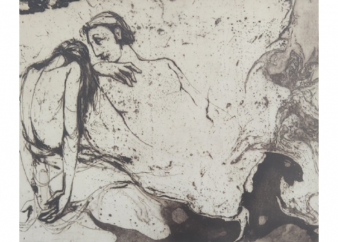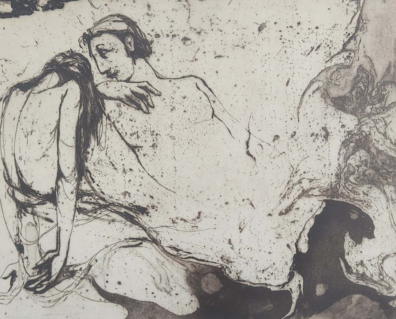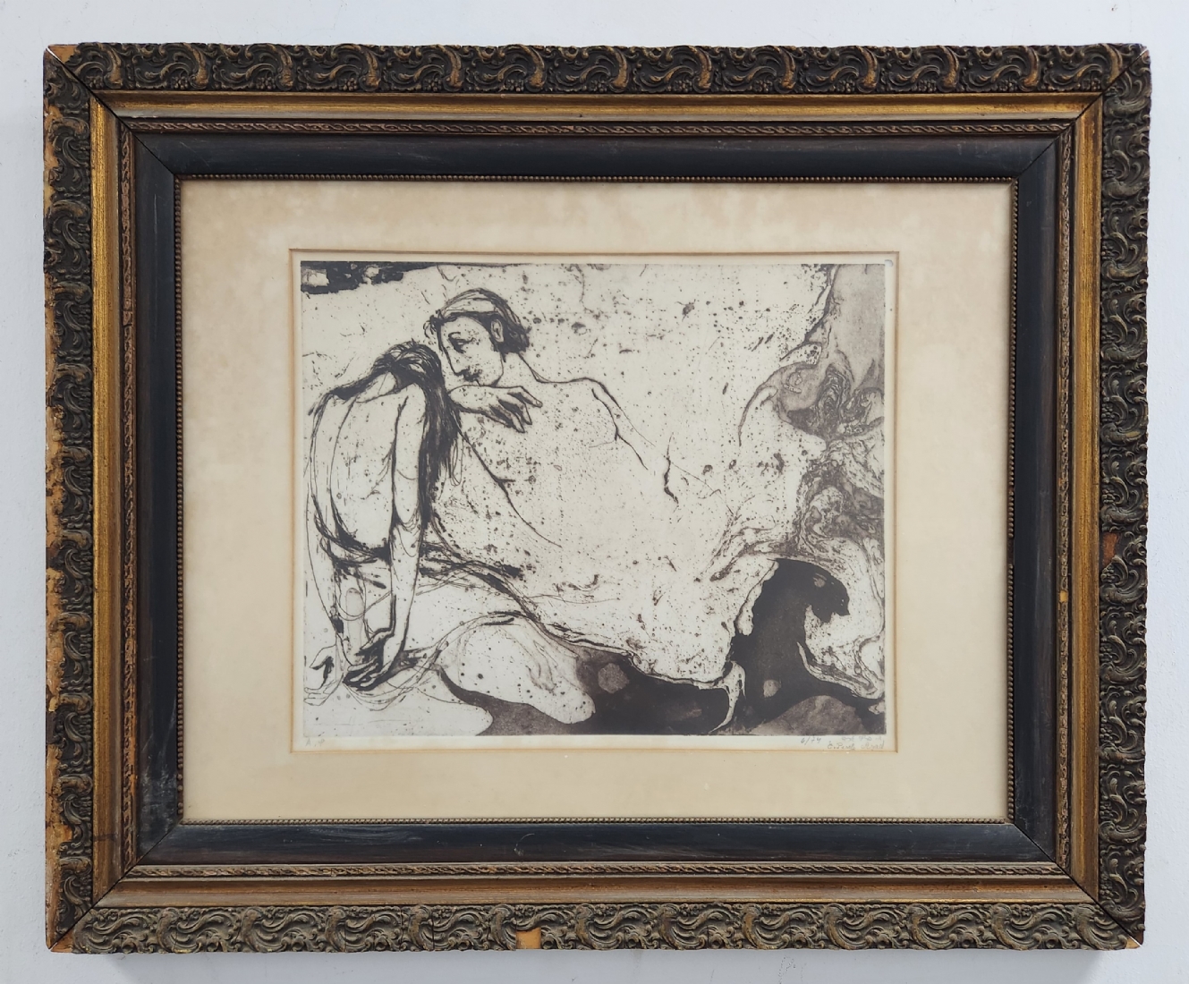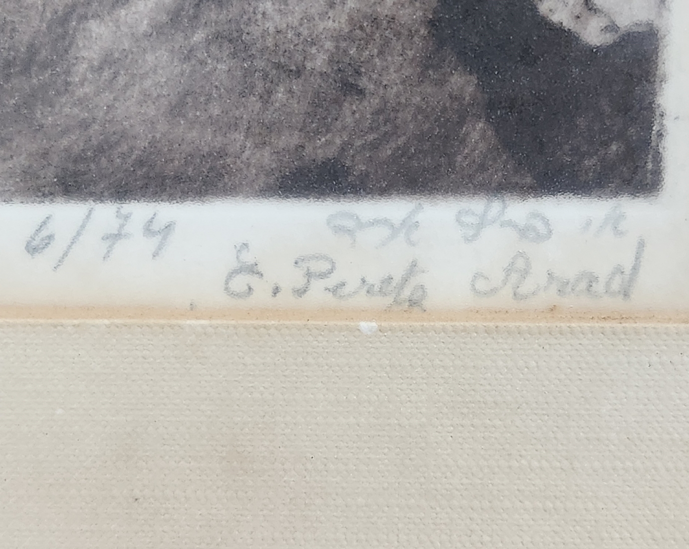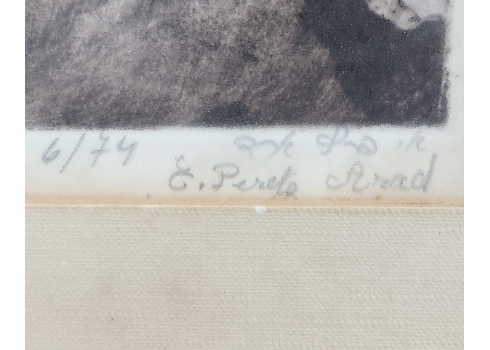 אסתר פרץ- ארד (Esther Peretz Arad) - 'זוג ולביאה שחורה', ליטוגרפיה ישנה ויפה (חור בפינה הימינית העליונה) חתומה בעיפרון וממוספרת 6/74 ס"מ, מידות: 41X50 ס"מ, מידות המסגרת: 72X87 ס"מ (פגמים למסגרת וכתמים לפספרטו).