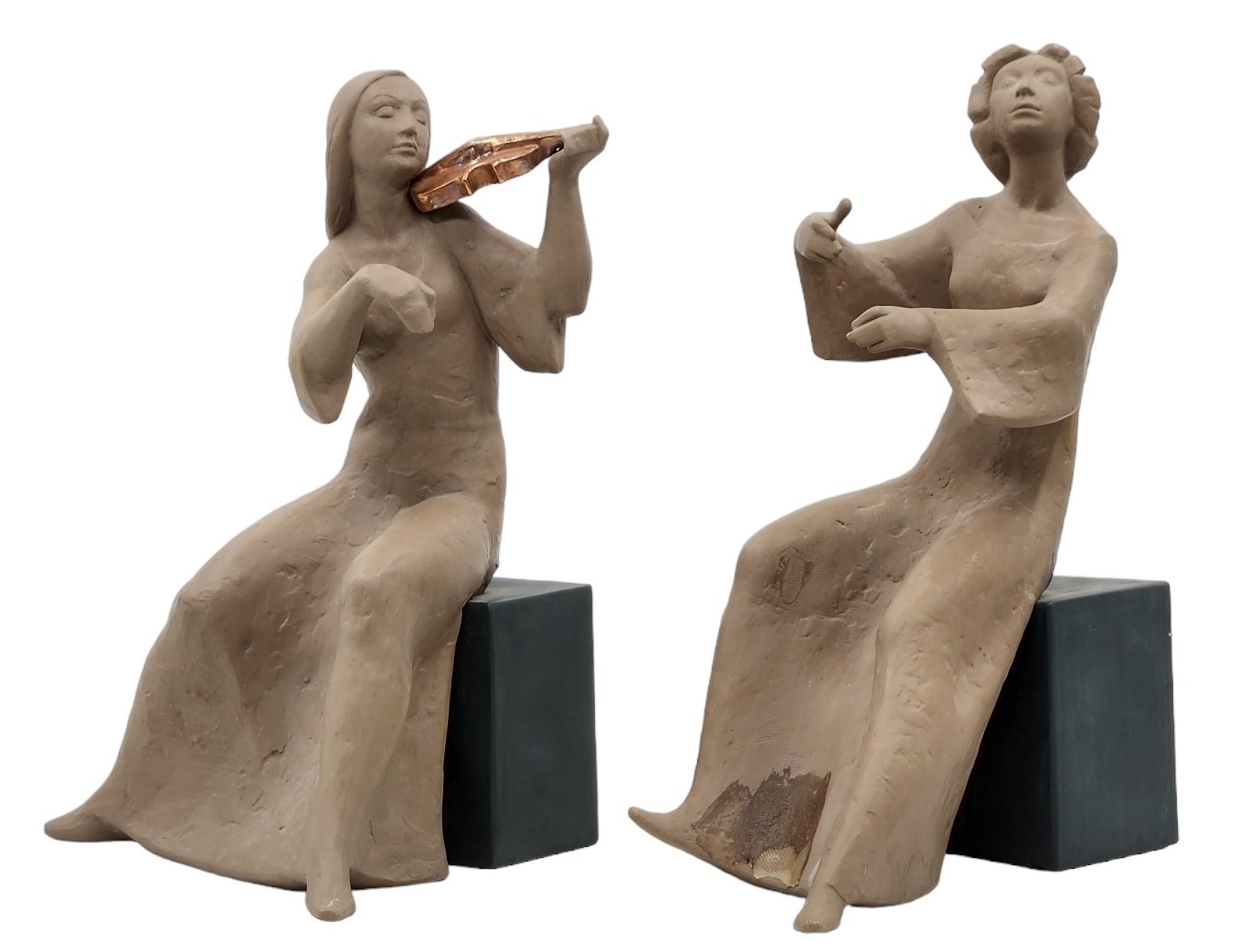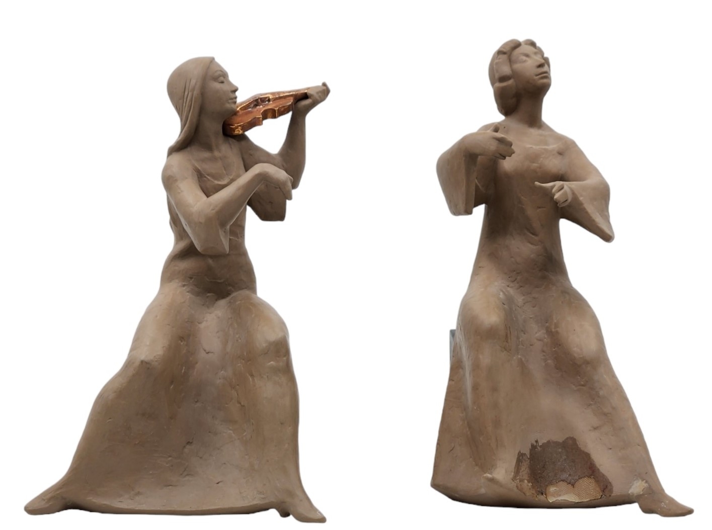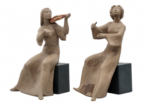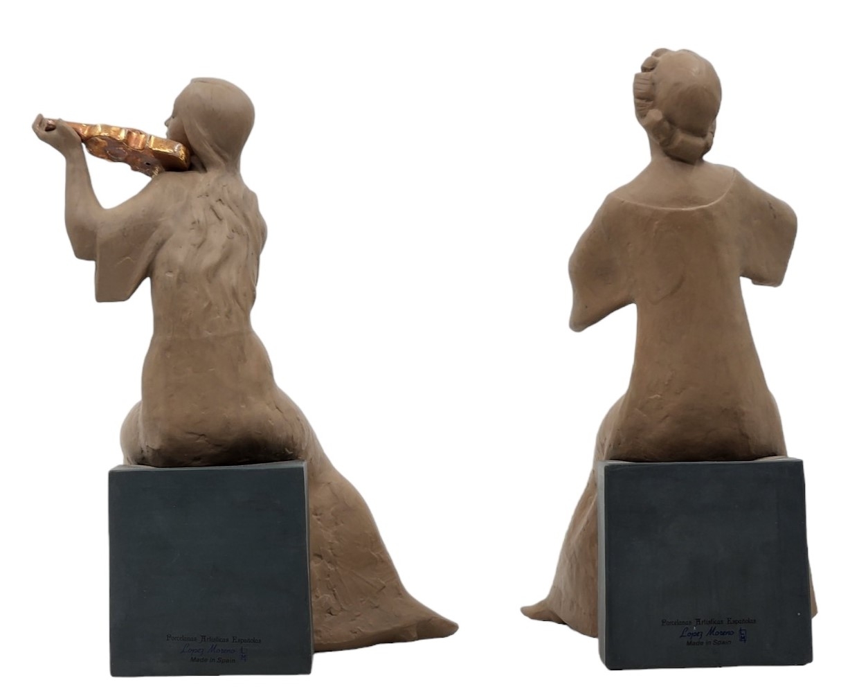 זוג פסלונים ספרדיים, בדמות נגניות, עשויים קרמיקה, מתוצרת: 'לופז מורנו' (Lopez Moreno), חתומים (חוסר בקשת ובכלי נגינה, ותיקון - מצולם), גובה: 26 ס"מ, רוחב הנגנית: 17 ס"מ.