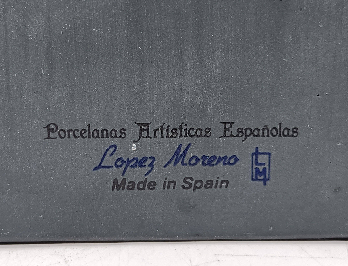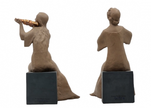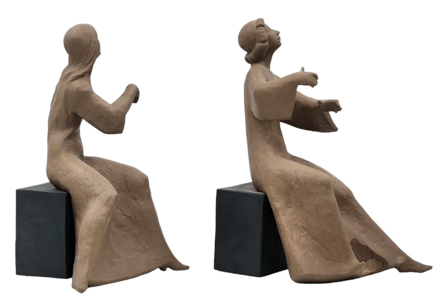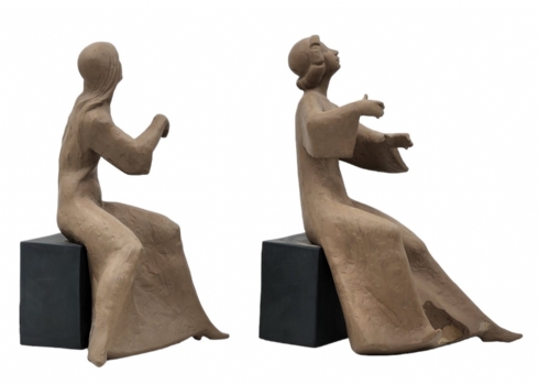 זוג פסלונים ספרדיים, בדמות נגניות, עשויים קרמיקה, מתוצרת: 'לופז מורנו' (Lopez Moreno), חתומים (חוסר בקשת ובכלי נגינה, ותיקון - מצולם), גובה: 26 ס"מ, רוחב הנגנית: 17 ס"מ.