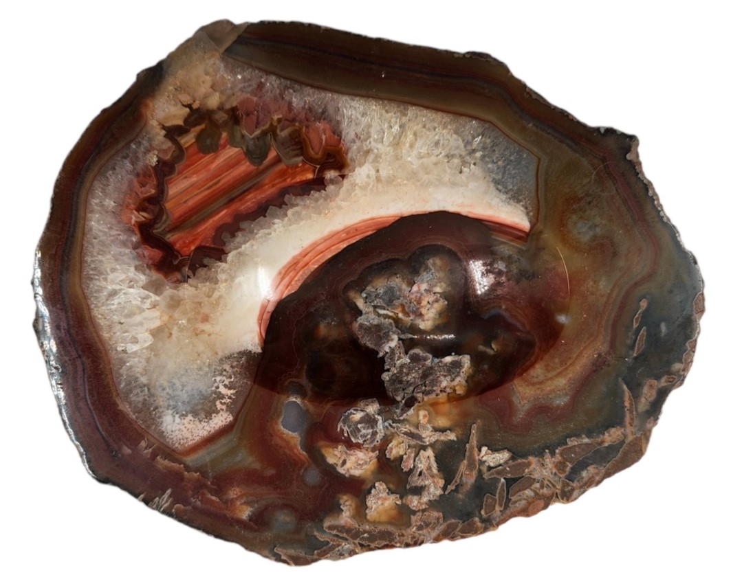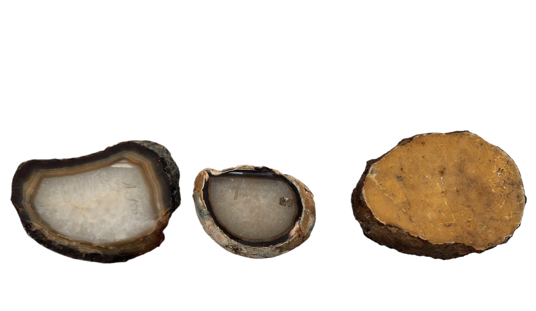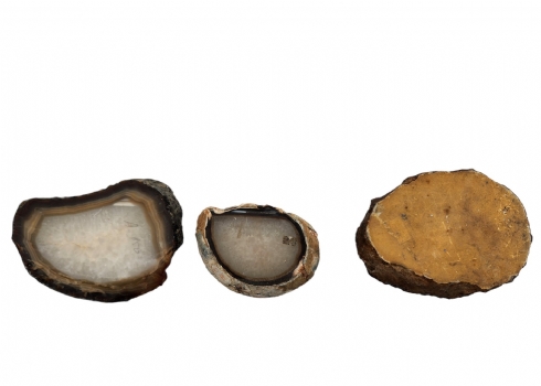 לוט של 3 פלחי אבן אגת טבעית, אורך בהתאמה: 16-13 ס"מ, רוחב בהתאמה: 12.5-9.5 ס"מ, עובי הפלח הגדול: 2.5 ס"מ.