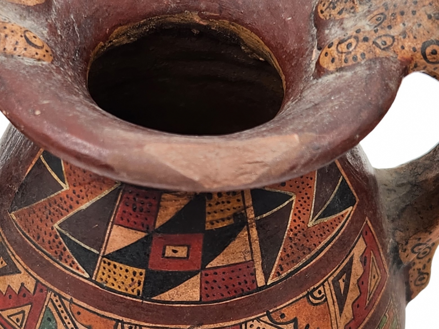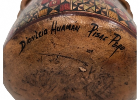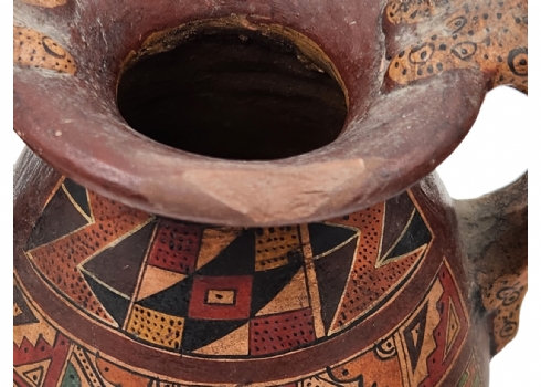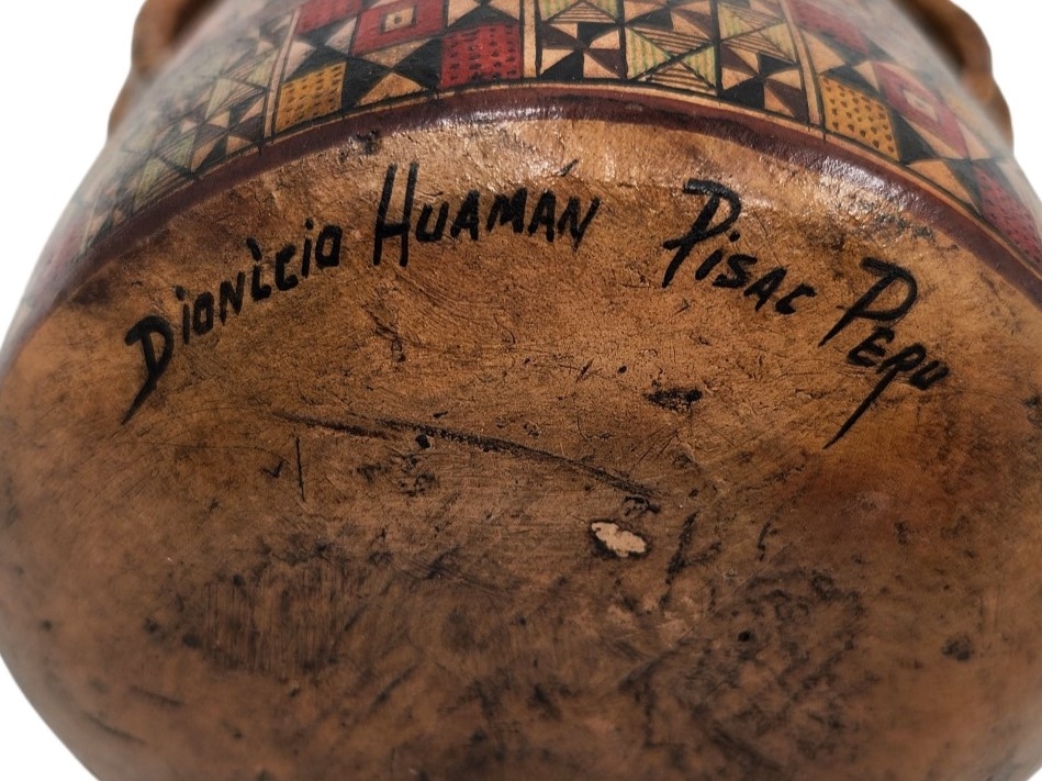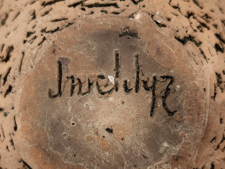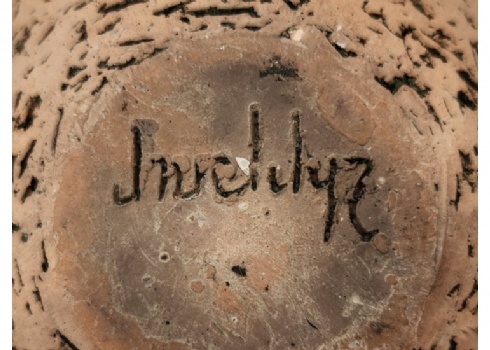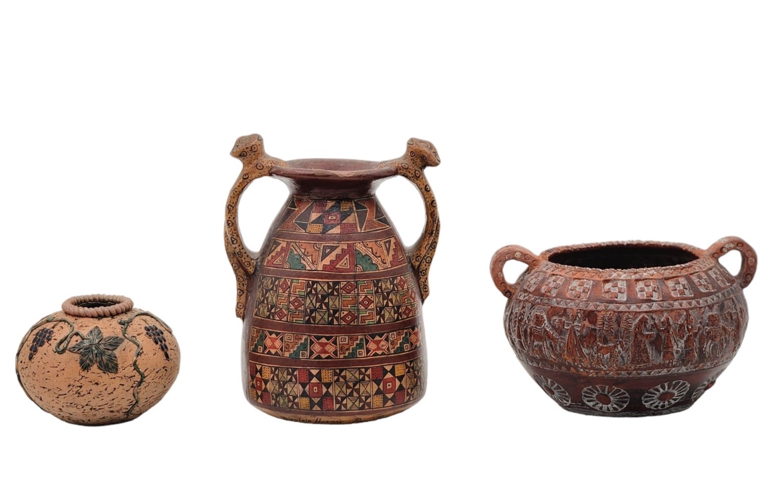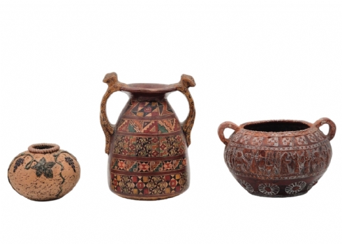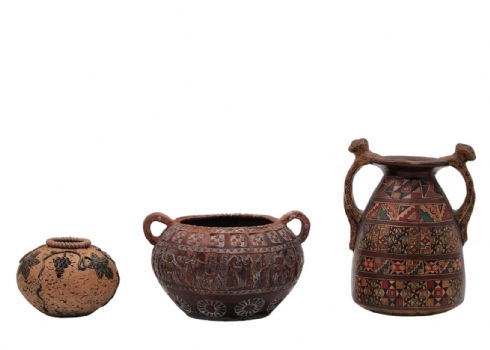 לוט של 3 כלי חרס ישנים שונים, מעוטרים בעיטורים שונים, שניים מהם חתומים, פגם לבסיס של אחד (מצולם), גובה הכד הגבוה: 16.5 ס"מ, רוחב הכד הרחב: 15.5 ס"מ.