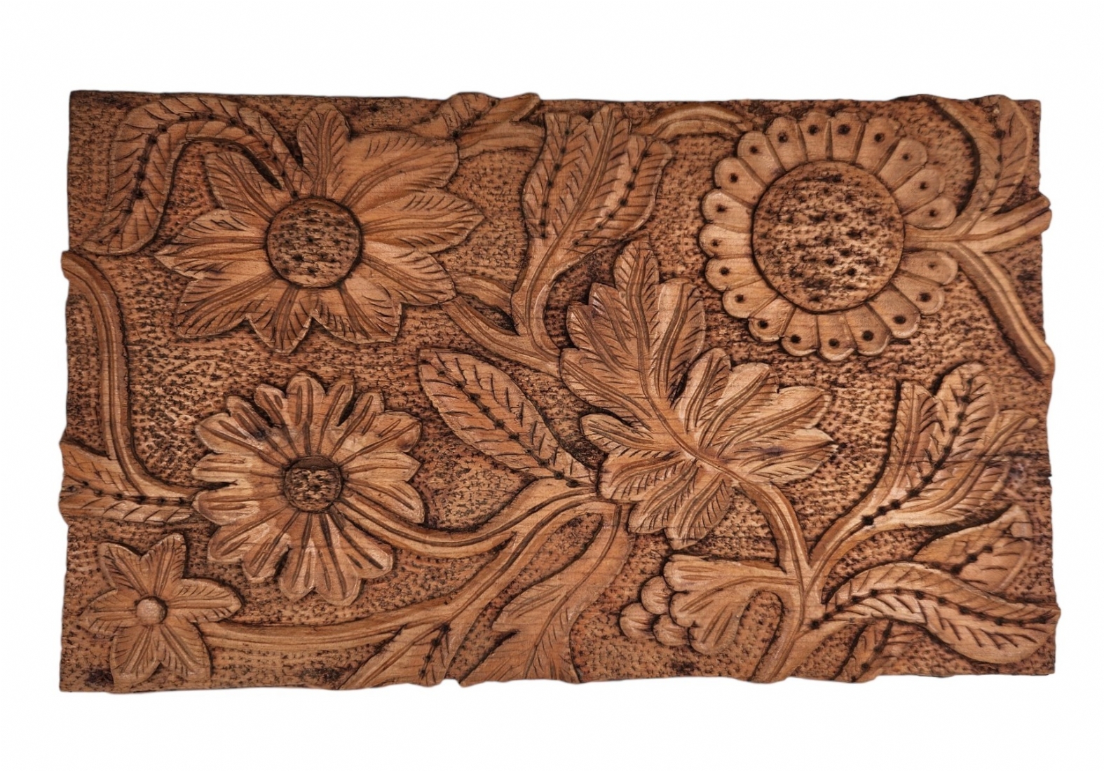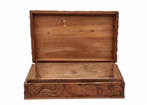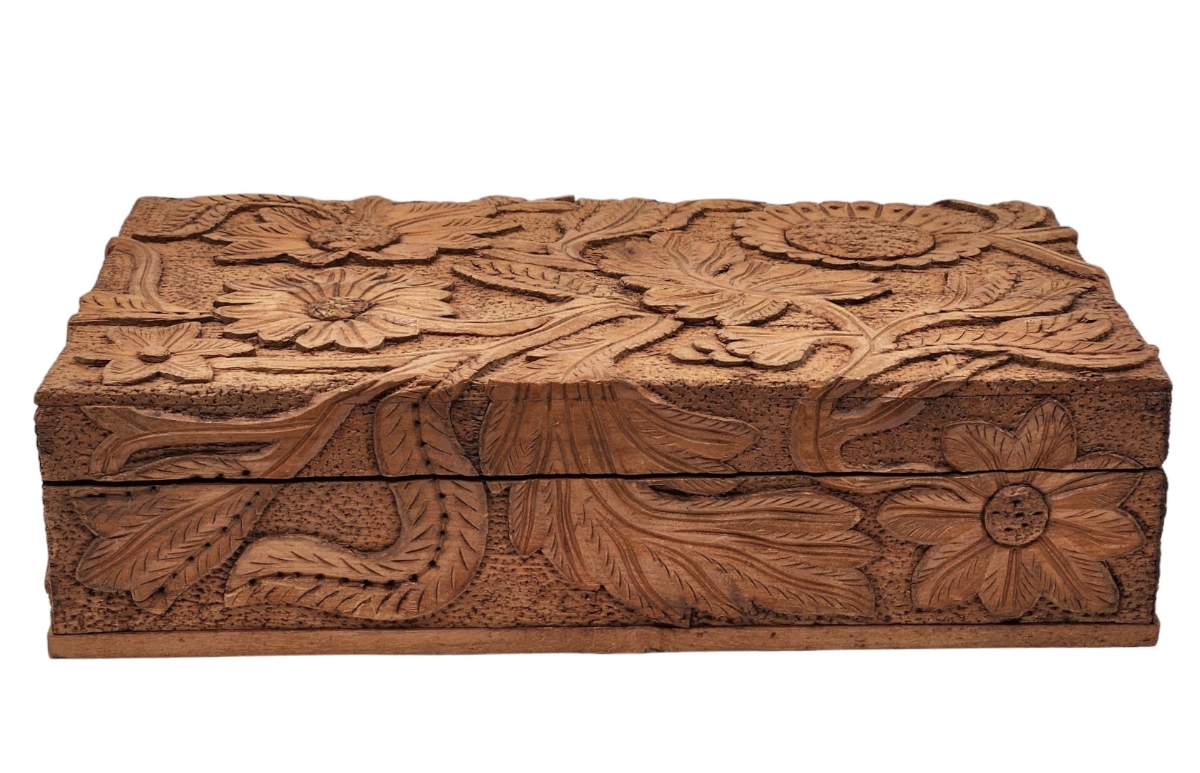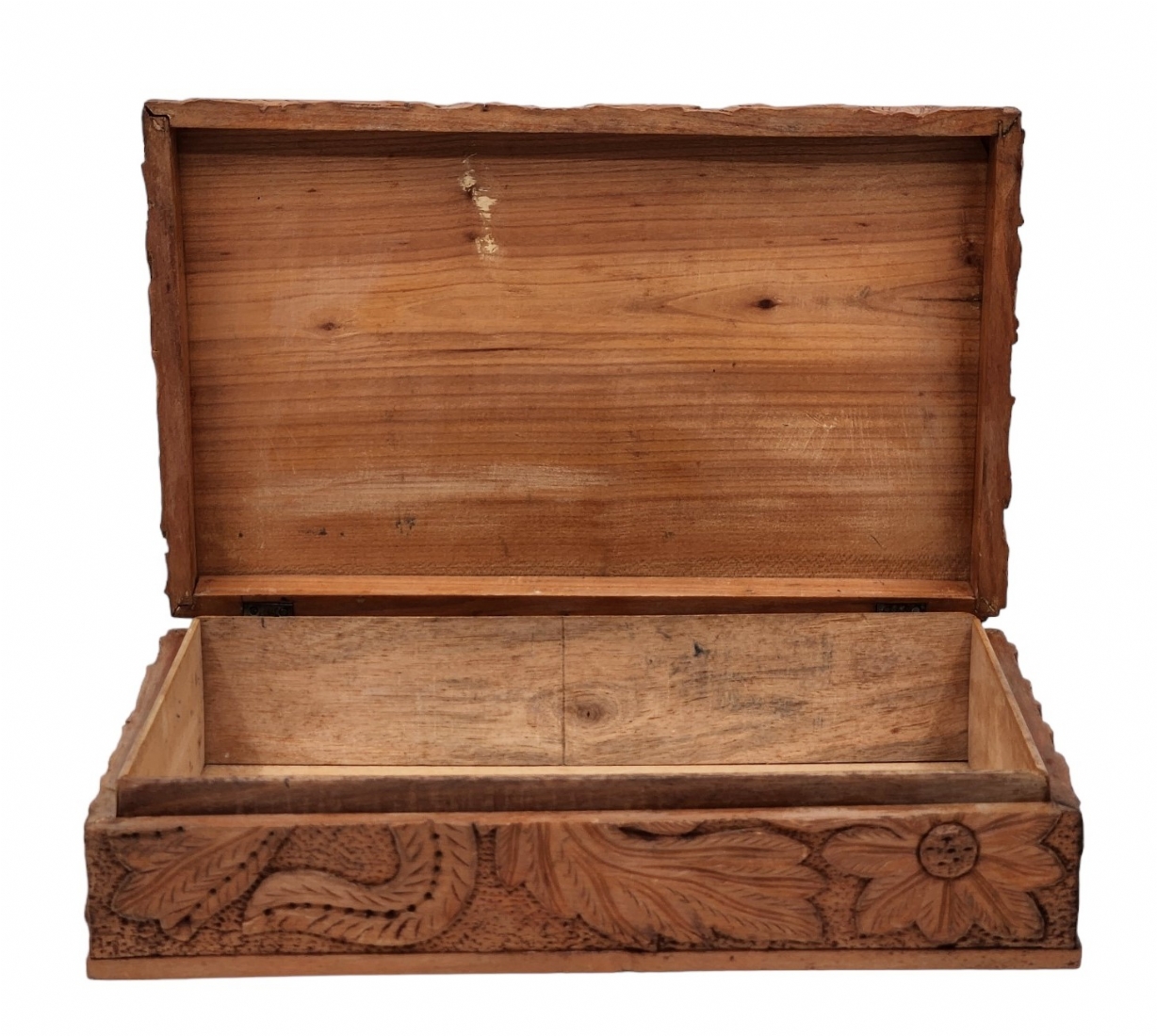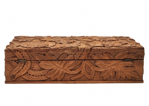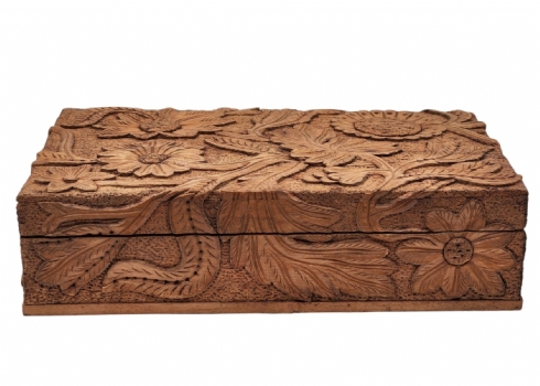 תיבת תכשיטים שולחנית גדולה ורחבה, עשויה עץ ומגולפת כולה בעבודת גילוף ידנית, גובה כולל: 8 ס"מ, מידות הבסיס: 18.5X31.5 ס"מ.