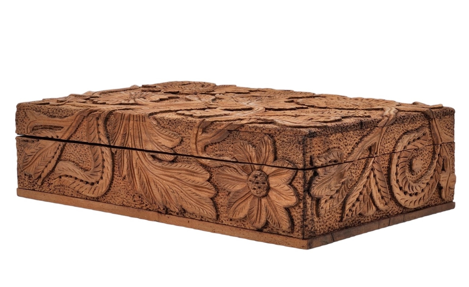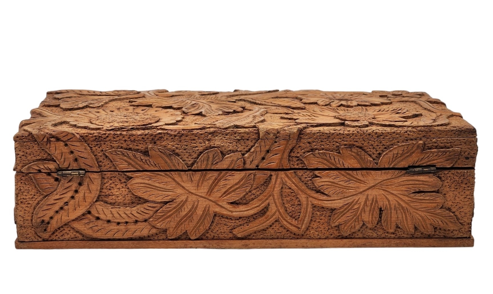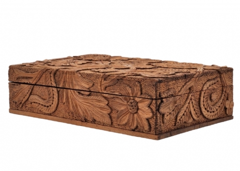 תיבת תכשיטים שולחנית גדולה ורחבה, עשויה עץ ומגולפת כולה בעבודת גילוף ידנית