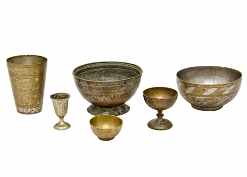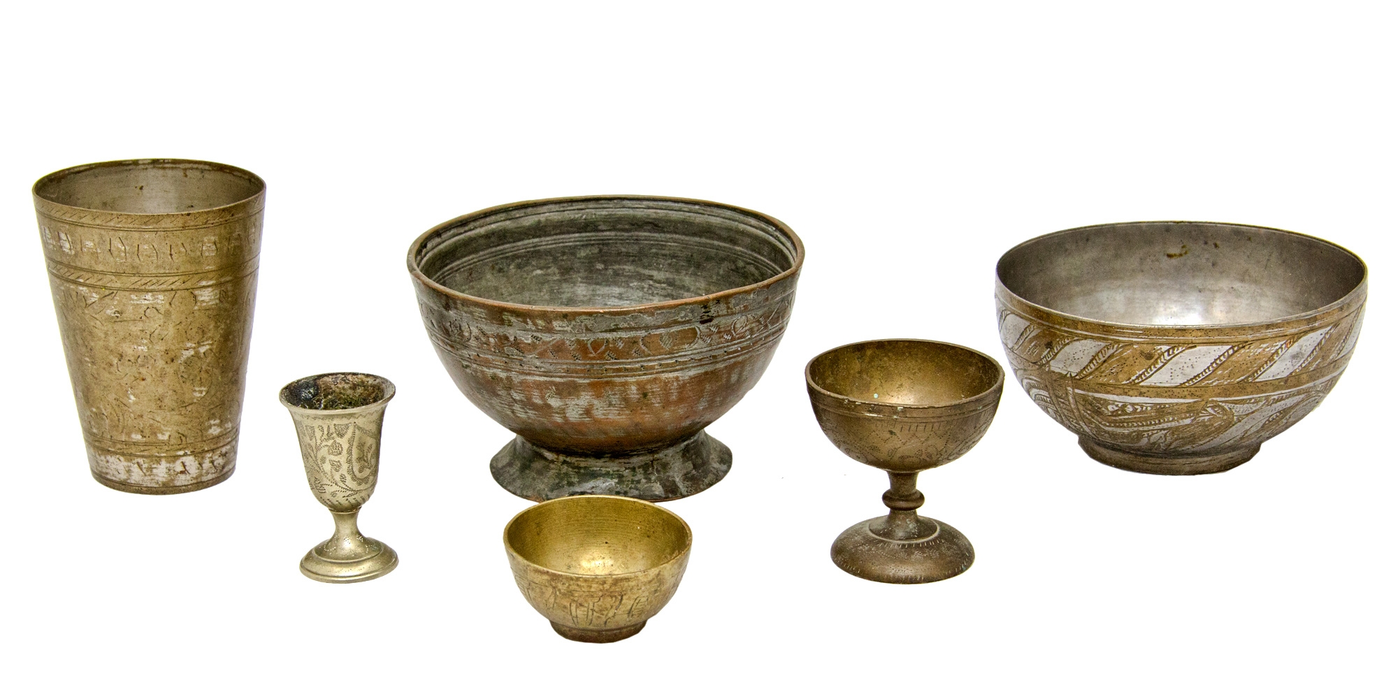לוט של 6 פריטים שונים עשוים פליז ונחושת, פגם, גובה הגביע: 11 ס"מ.