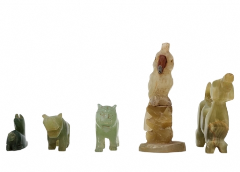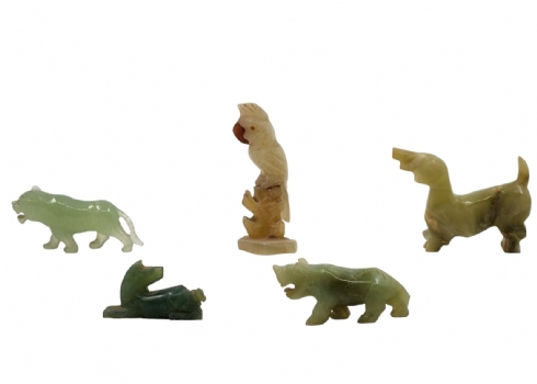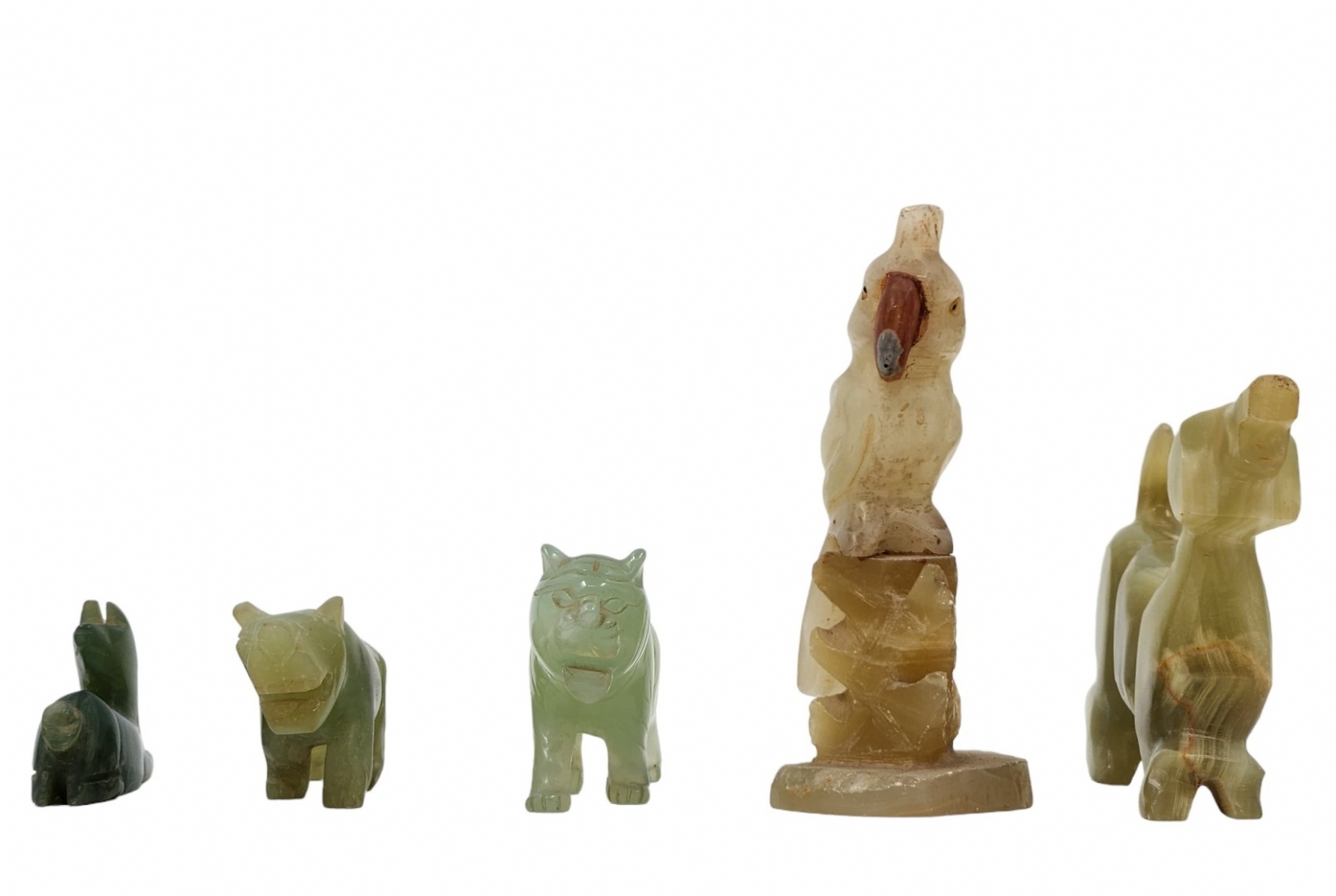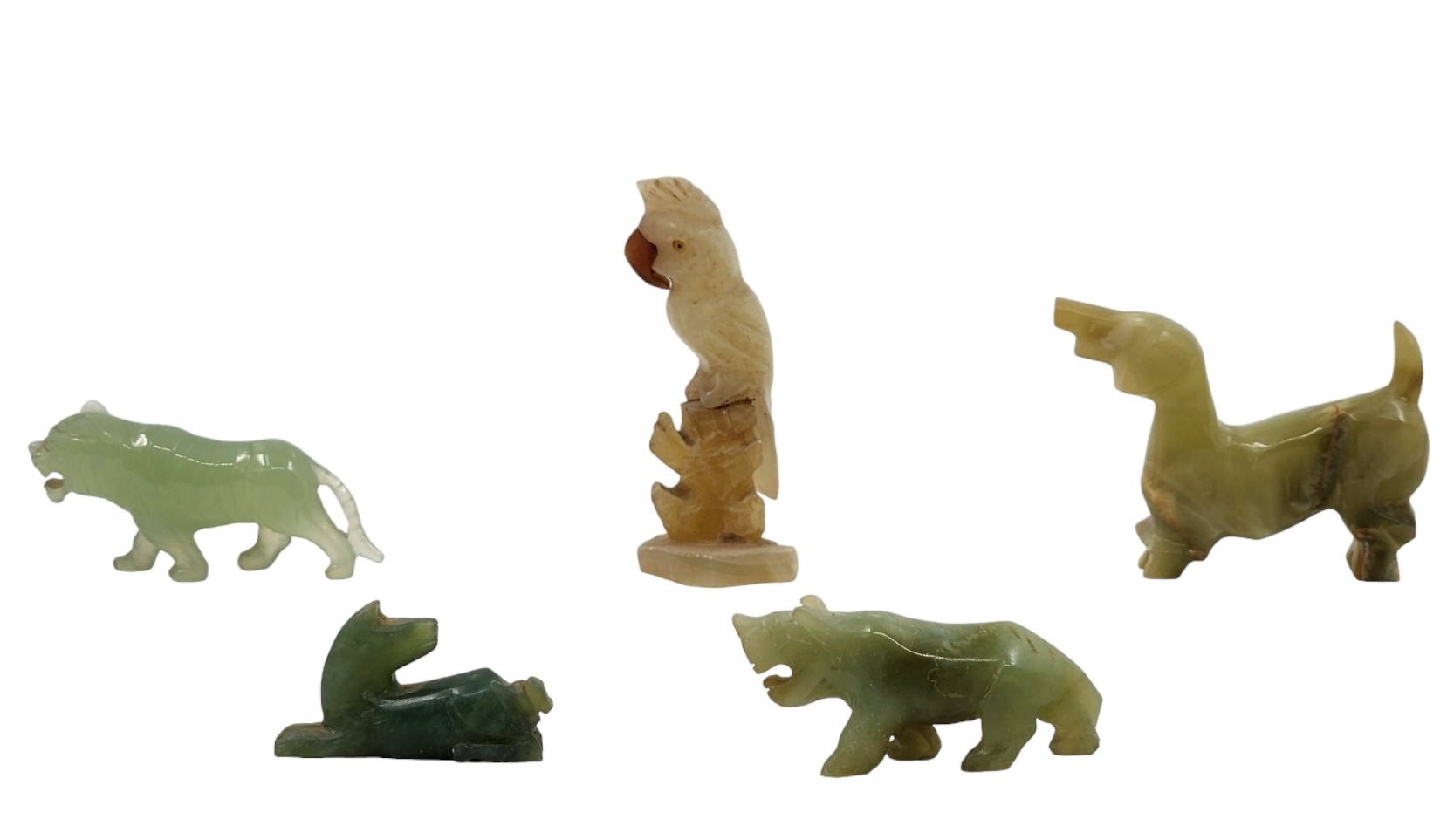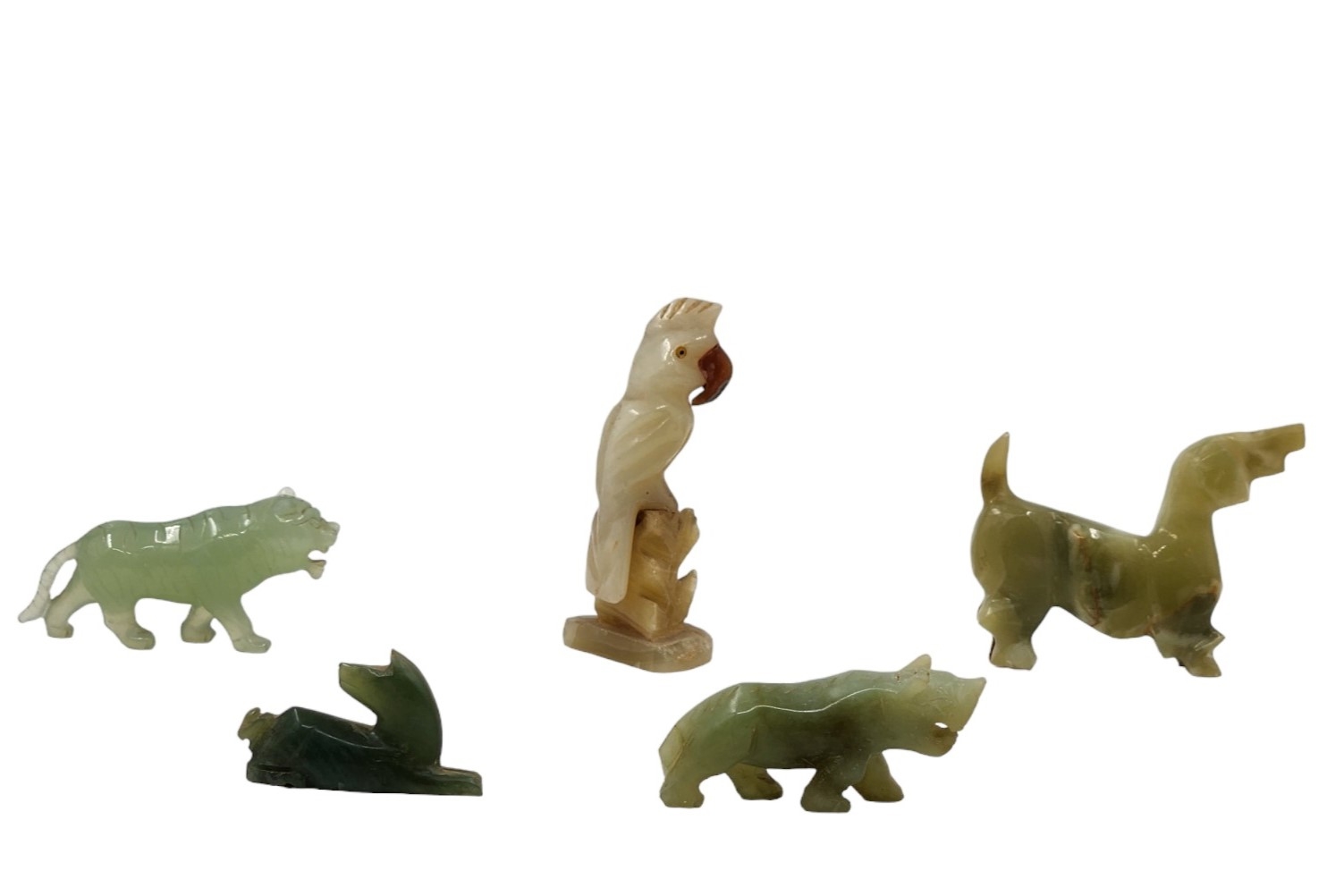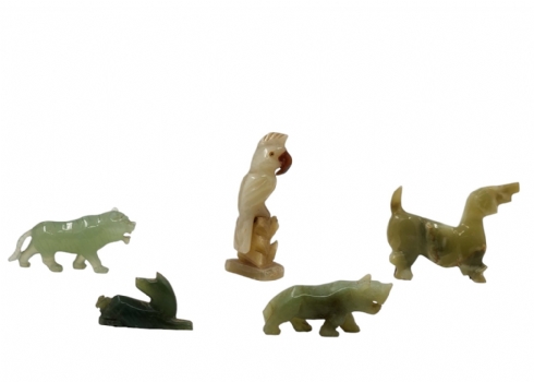 לוט של 5 מניאטורות ישנות, בדמות חיות שונות, עשויים ומגולפים בג'ייד, 'סרפנטיין' (Serpentine) ואבנים טבעיות אחרות, גובה הטוקן: 10.5 ס"מ, אורך הכלב: 10 ס"מ,