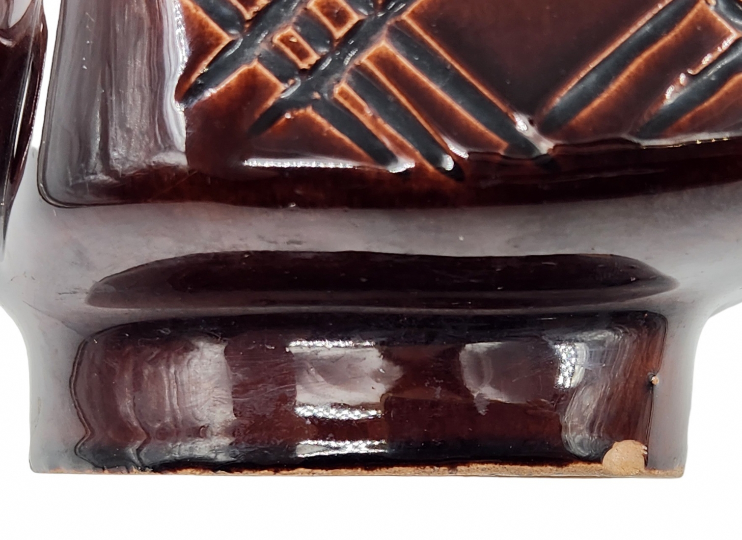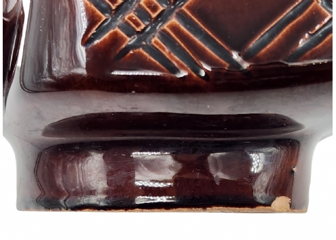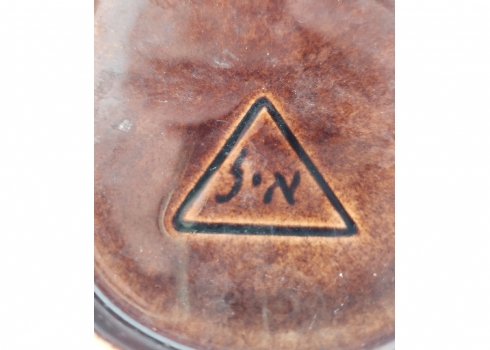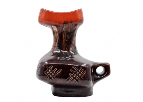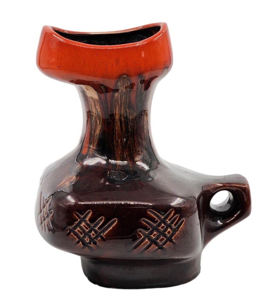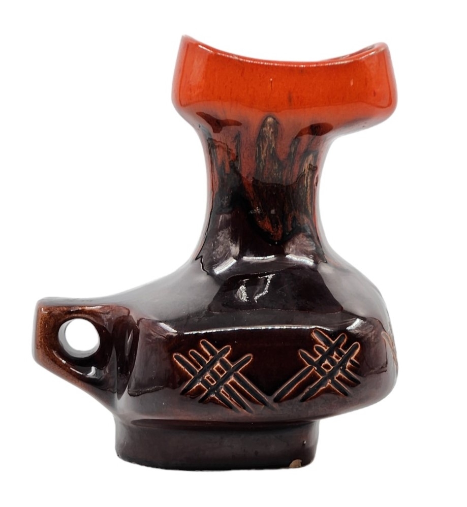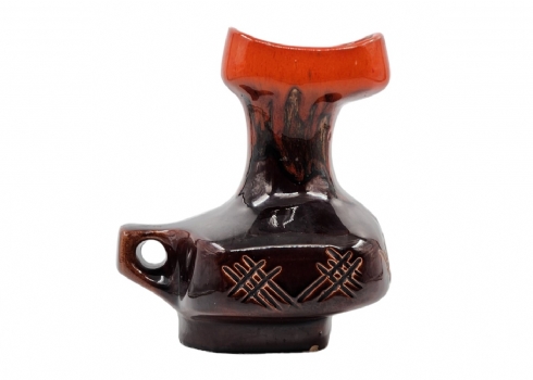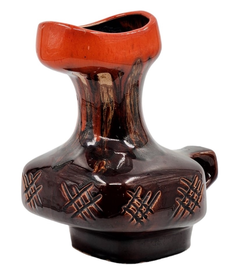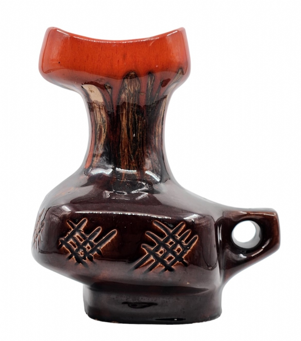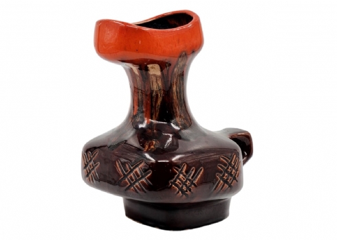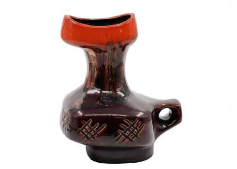 לאספני קרמיקה ישראלית (ישראליאנה) - כד קרמיקה ישראלי ישן ויפה מתוצרת קיבוץ איל, מעוטר בזיגוג חום וכתום, חתום, רוחב כולל ידית: 20 ס"מ, גובה: 24.5 ס"מ.