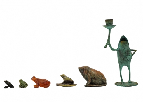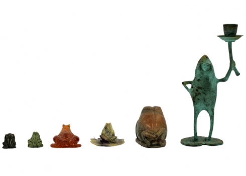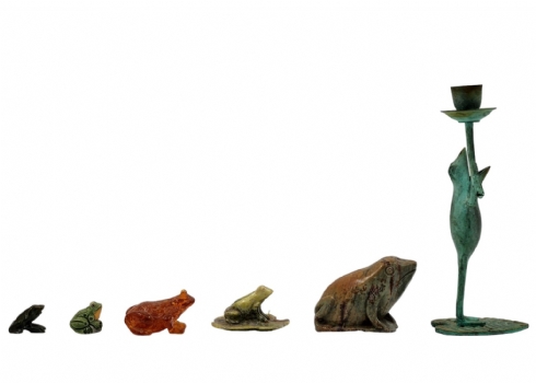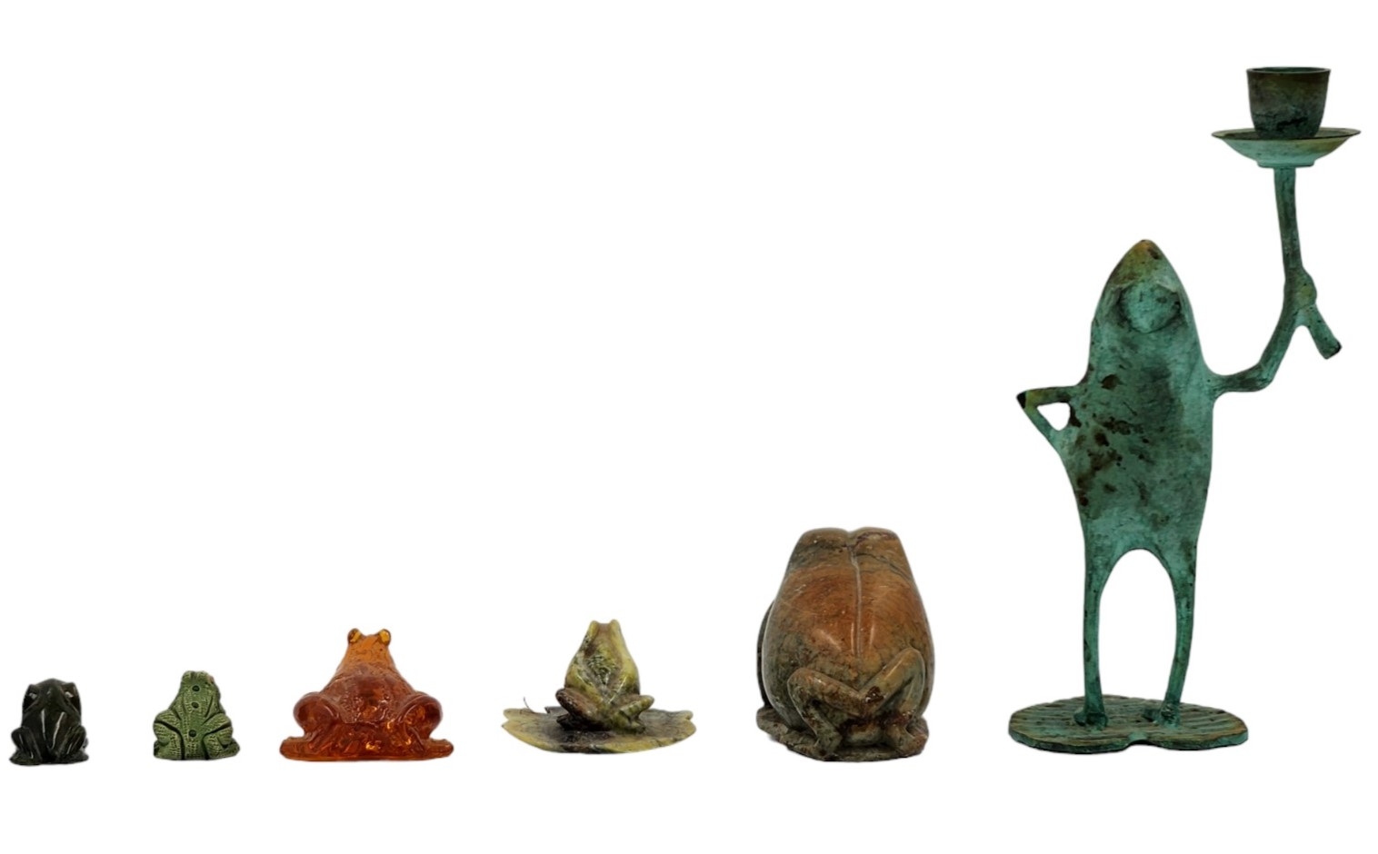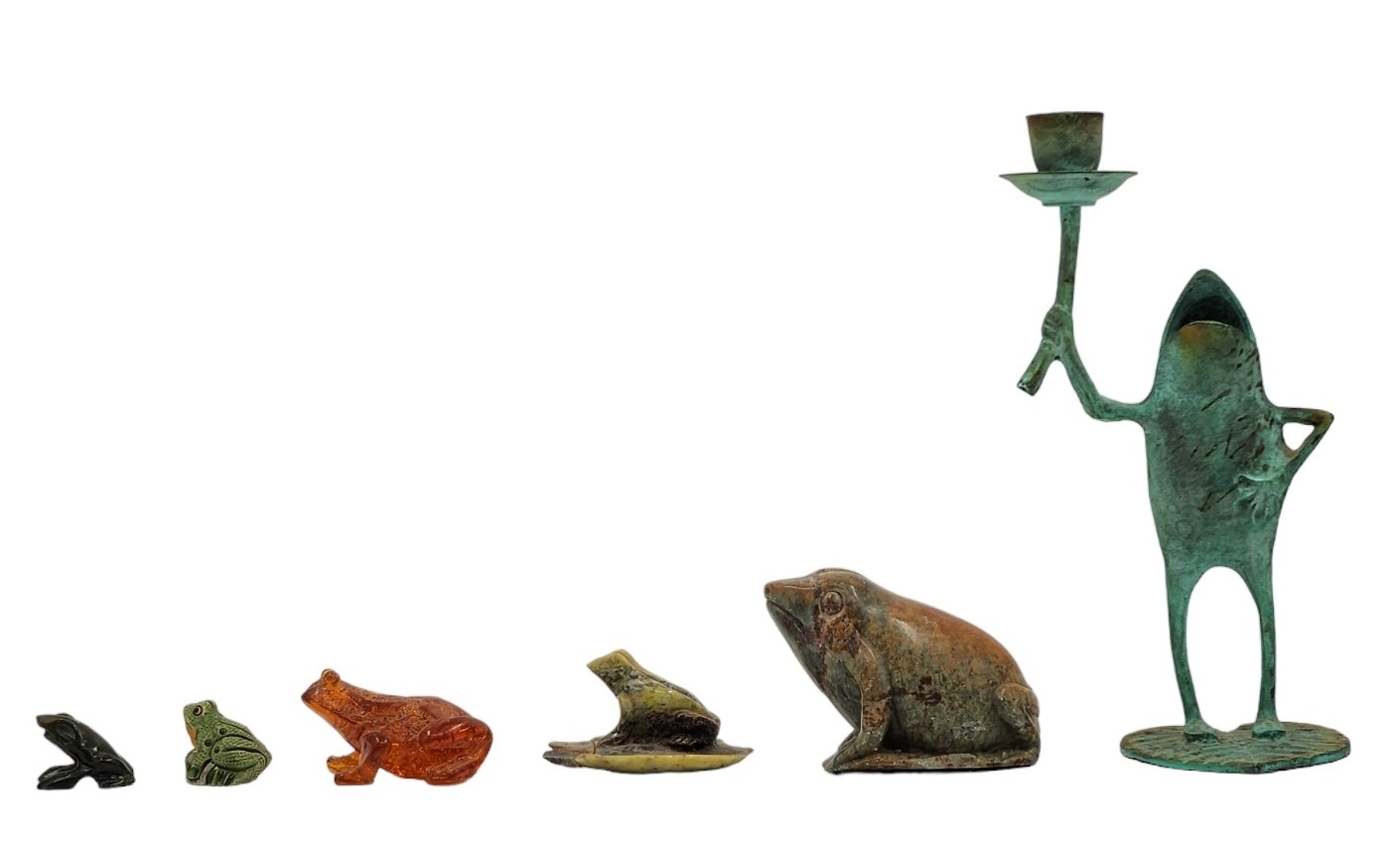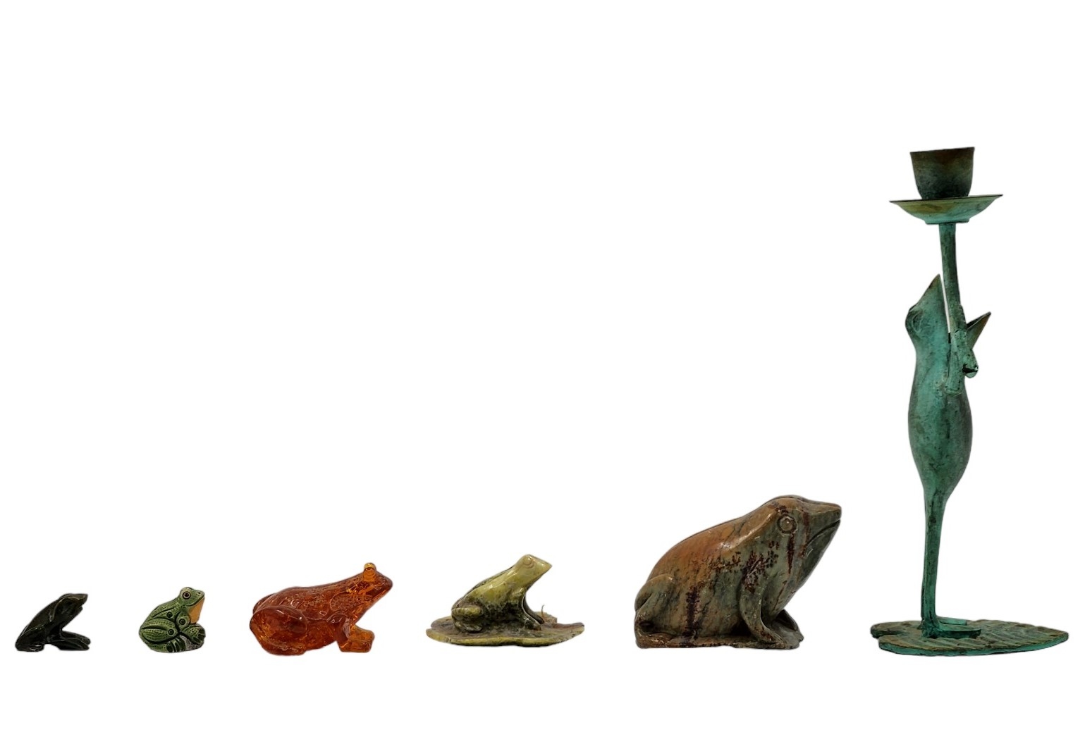 לאספני צפרדעים - לוט של 6 פסלונים בדמות צפרדעים, עשויים חומרים שונים, כגון, אבן טבעית, ברזל וחומר יצוק (פגם לבסיס אחת הצפרדעים), גובה הצפרדע עם הפמוט: 22 ס"מ, גובה הצפרדע הקטנה: 2.5 ס"מ.