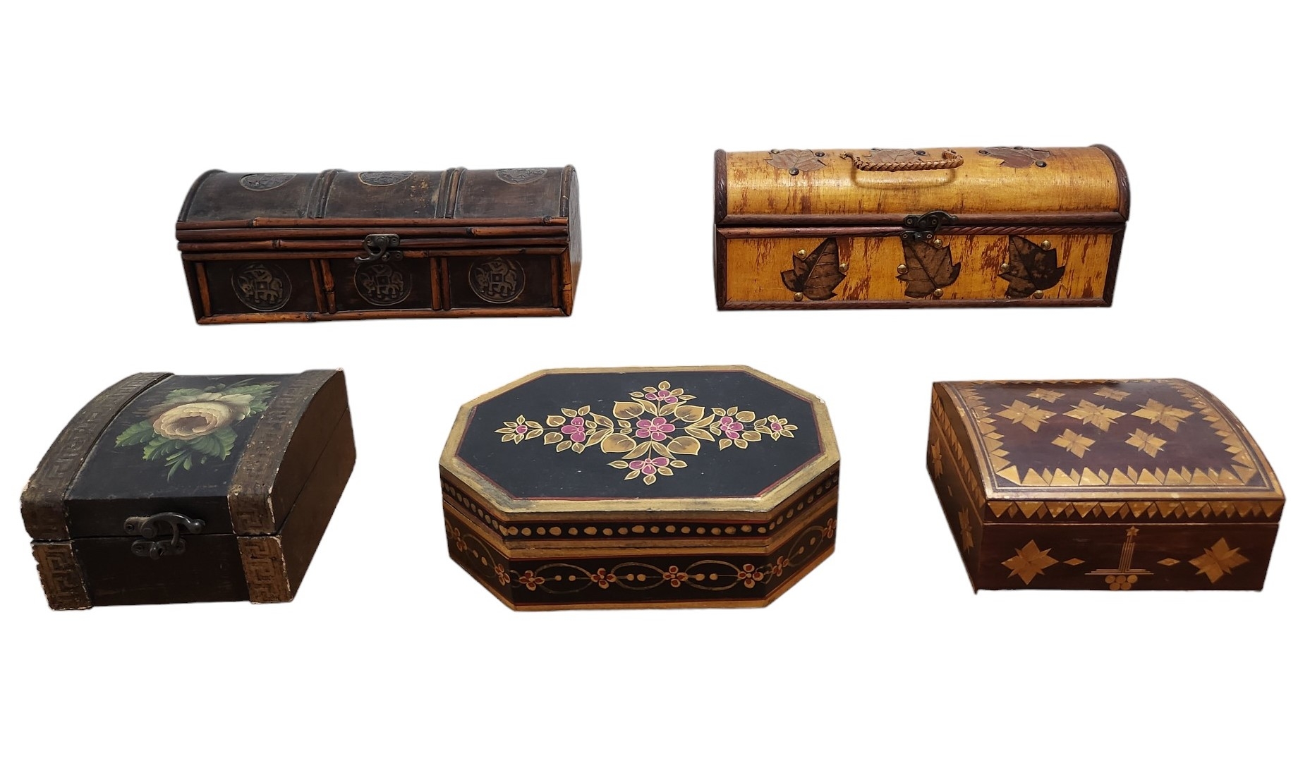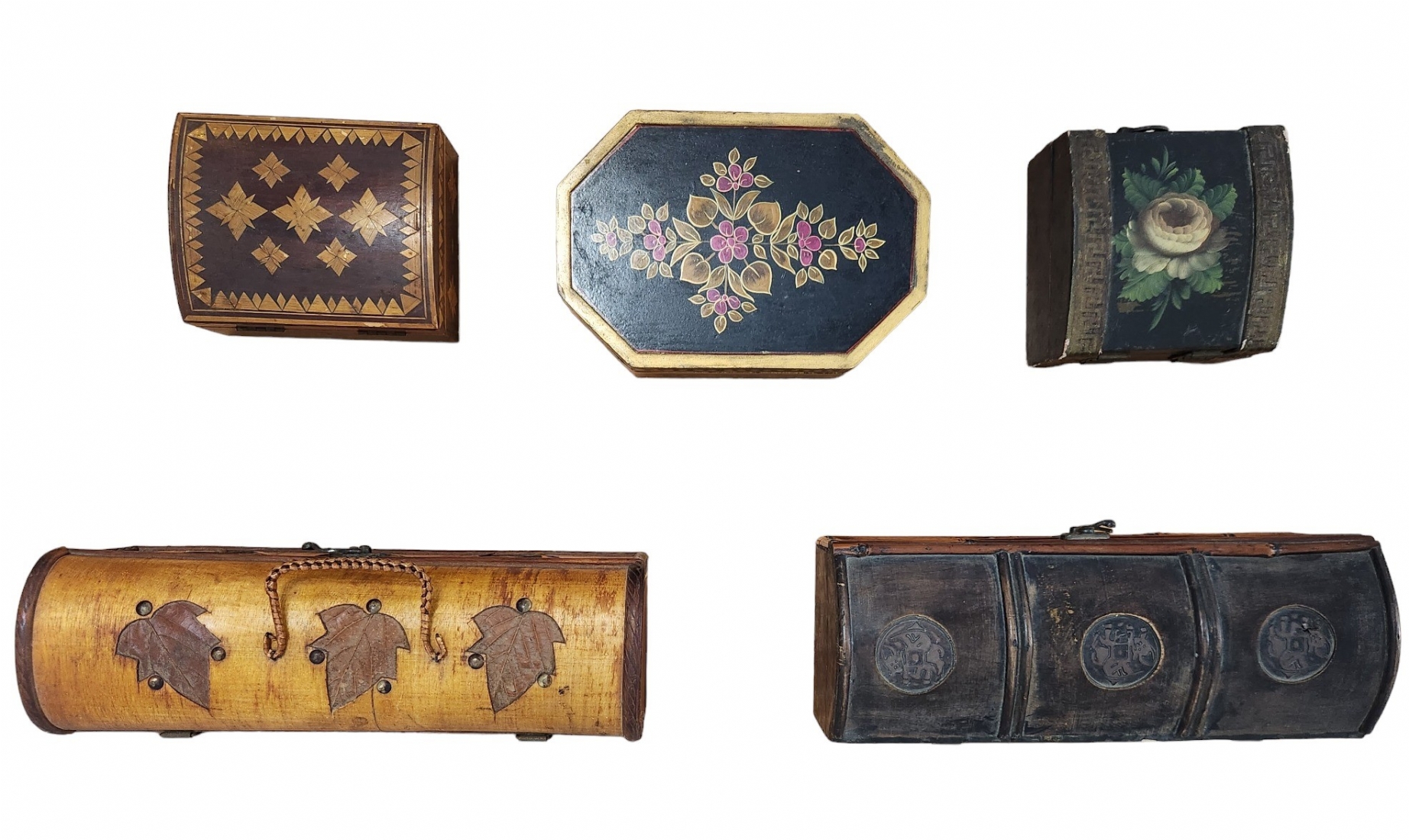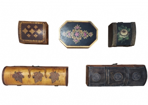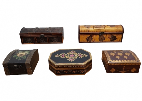 הקופסאות מעוטרות בעיטורים שונים, עשויות מעץ, במבוק, עלים, לבד ומתכת, מצב בהתאם לגיל (יתכנו פגמים קטנים).