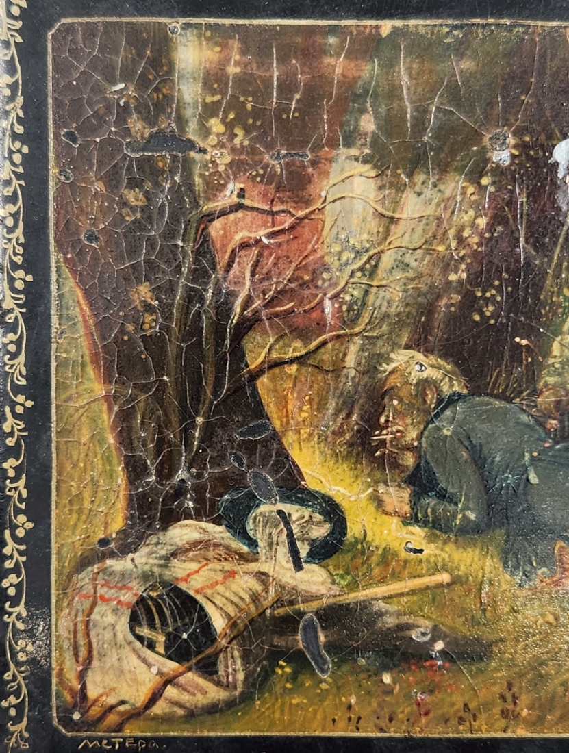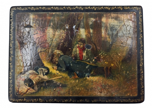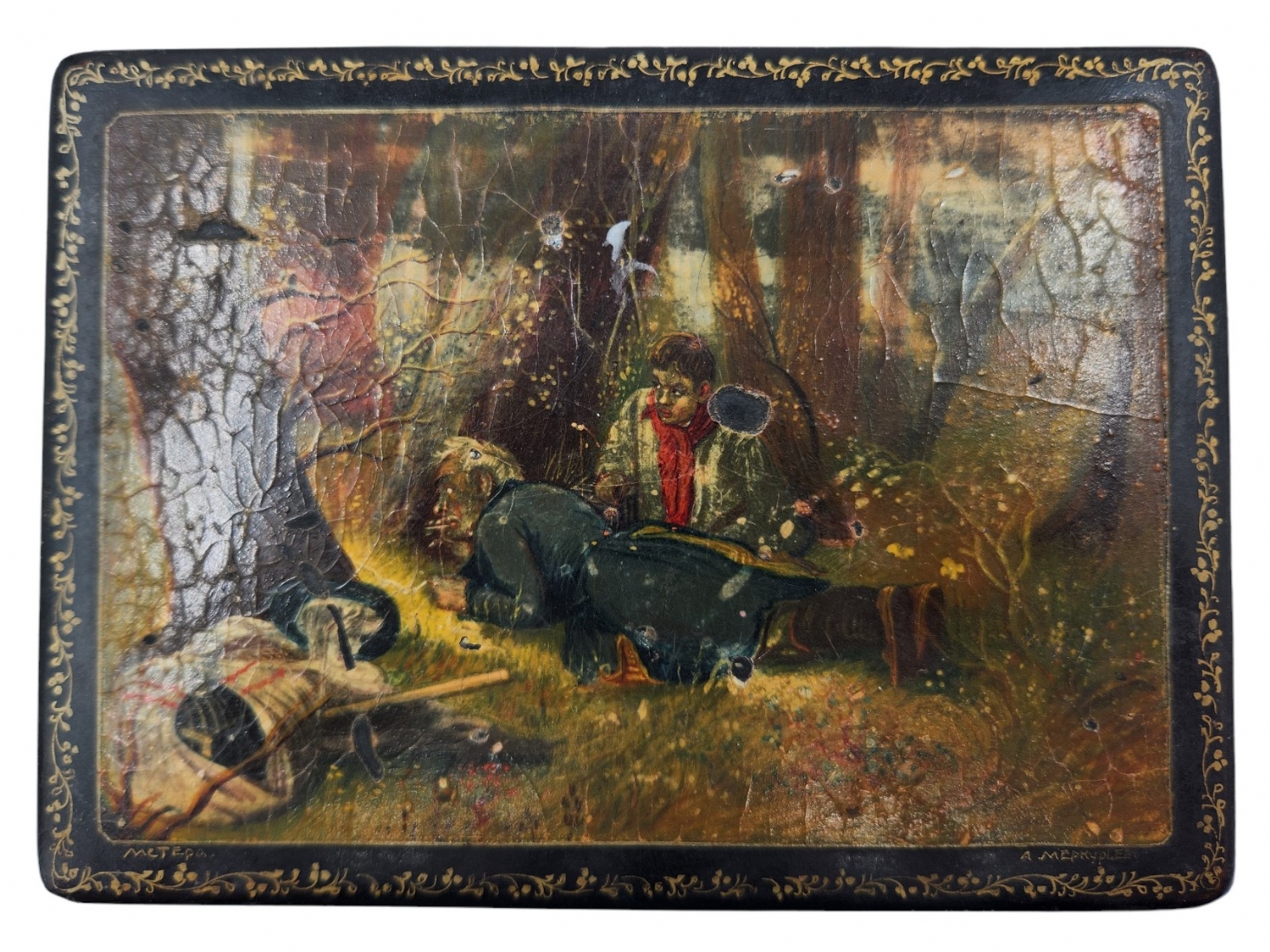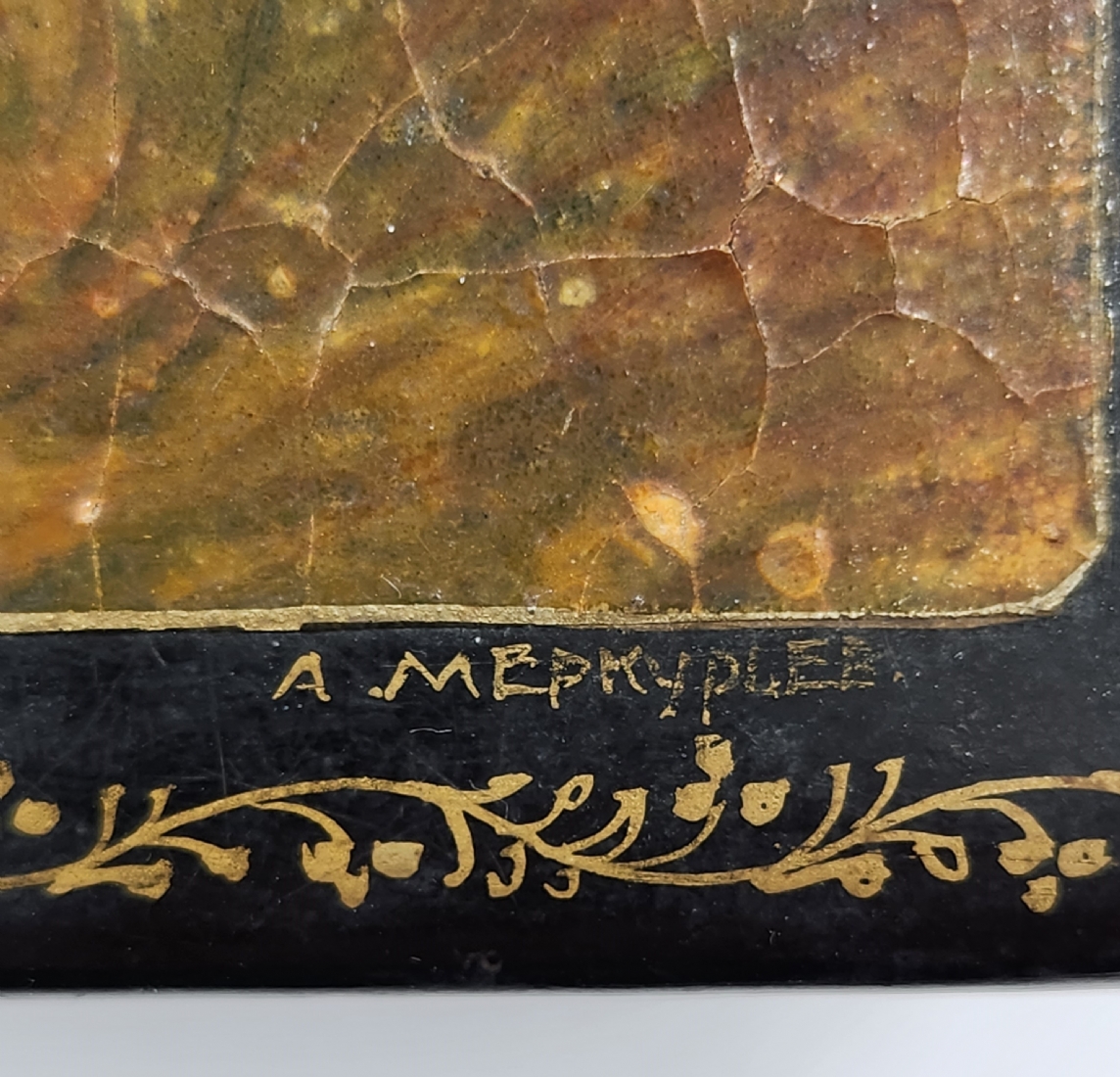 לאספני אמנות רוסית - קופסת פלח (פאלח) רוסית ישנה יפה ואיכותית מאד מתוצרת Mstera, מעוטרת ציורי יד חתומה על ידי הצייר A. Merkylev (או A.Merkur'ev, ברוסית: А.Меркурьев), מספר קילופי צבע למכסה (מצולם), גובה: 5.5 ס"מ, רוחב: 12.5 ס"מ, אורך: 17.5 ס"מ.