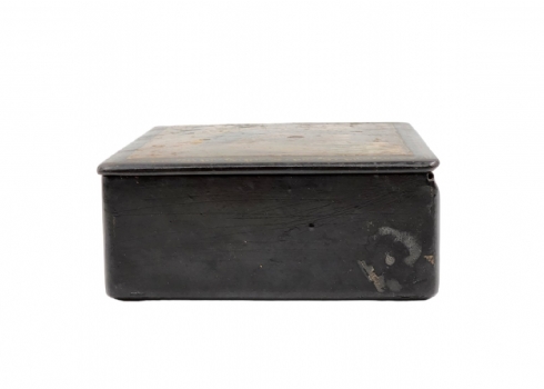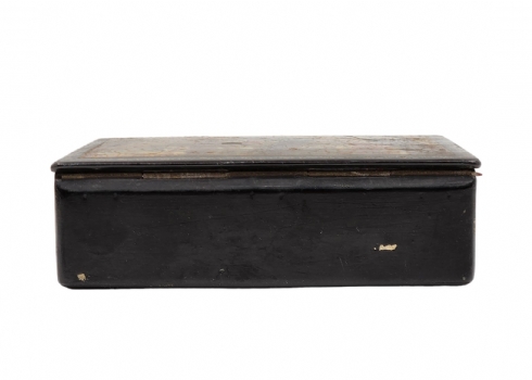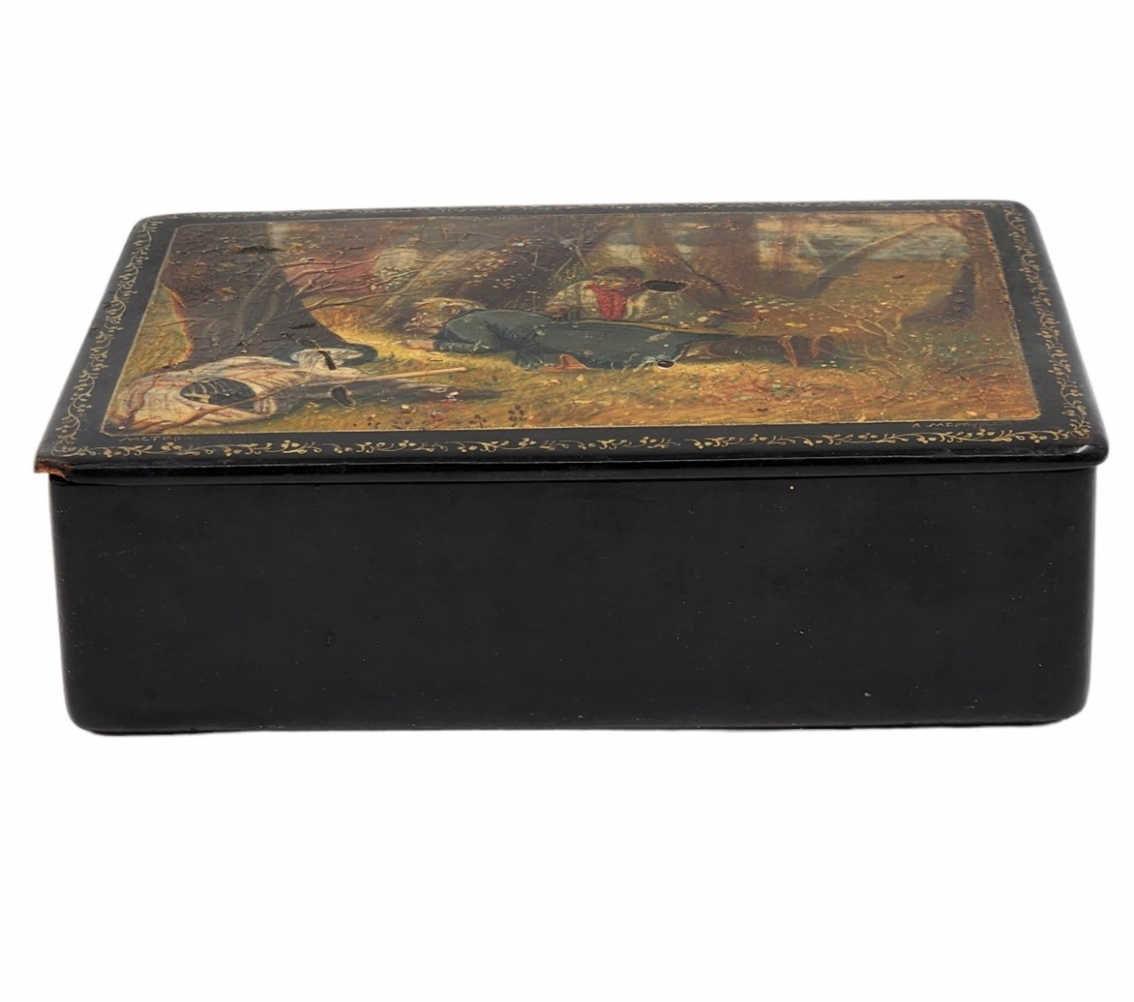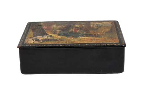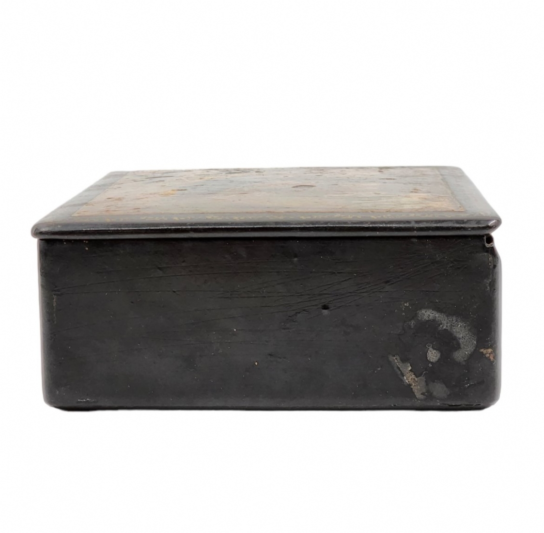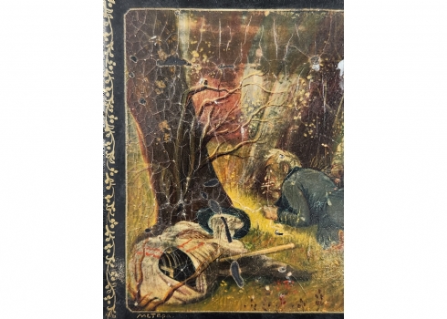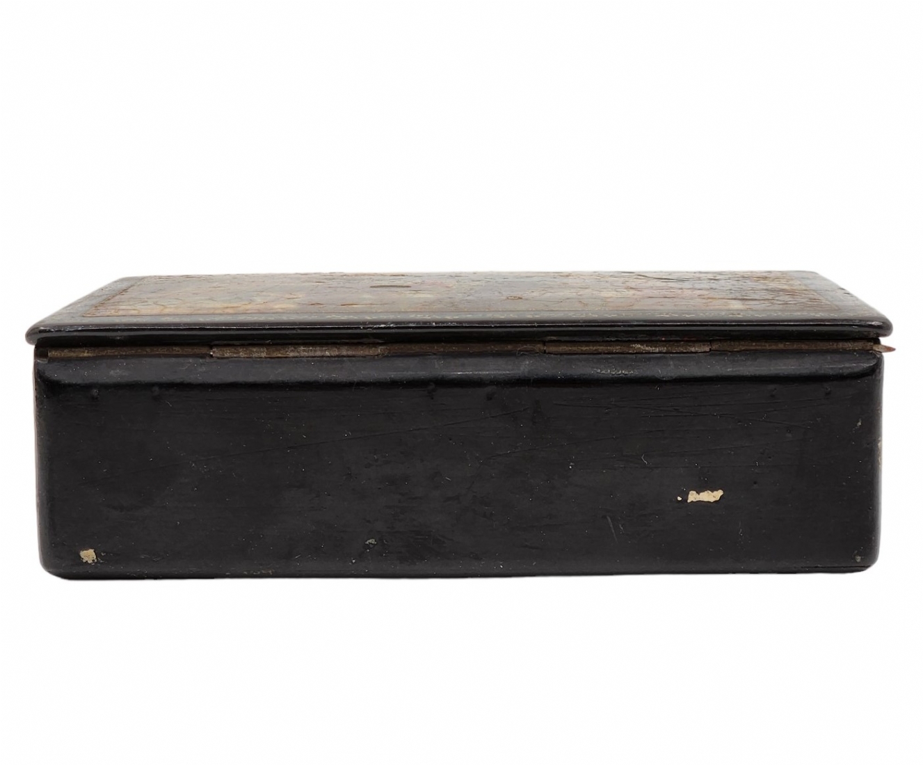 לאספני אמנות רוסית - קופסת פלח (פאלח) רוסית ישנה יפה ואיכותית מאד מתוצרת Mstera, מעוטרת ציורי יד חתומה על ידי הצייר A. Merkylev (או A.Merkur'ev, ברוסית: А.Меркурьев), מספר קילופי צבע למכסה (מצולם), גובה: 5.5 ס"מ, רוחב: 12.5 ס"מ, אורך: 17.5 ס"מ.