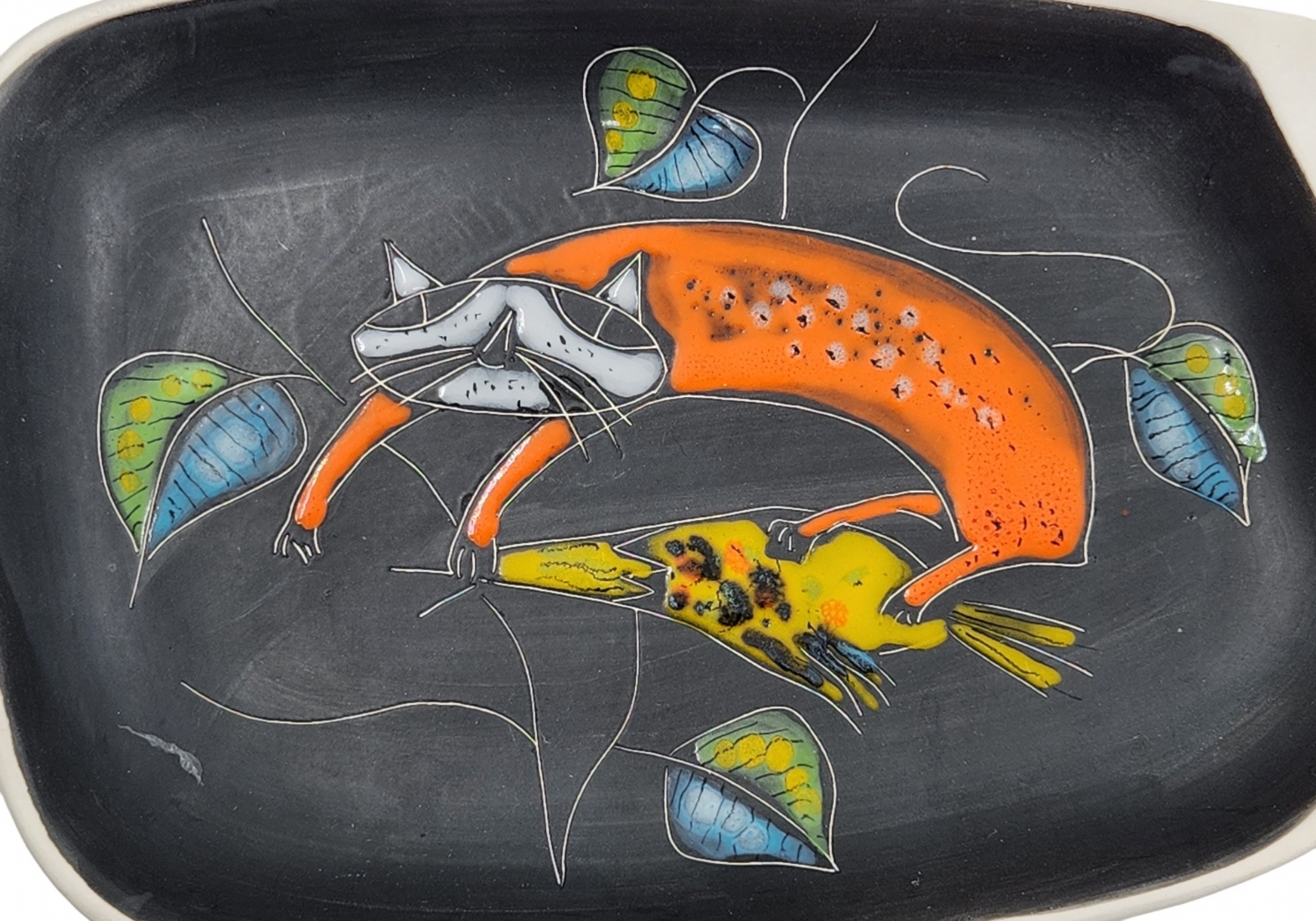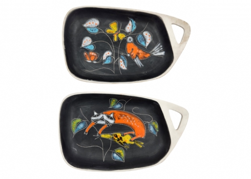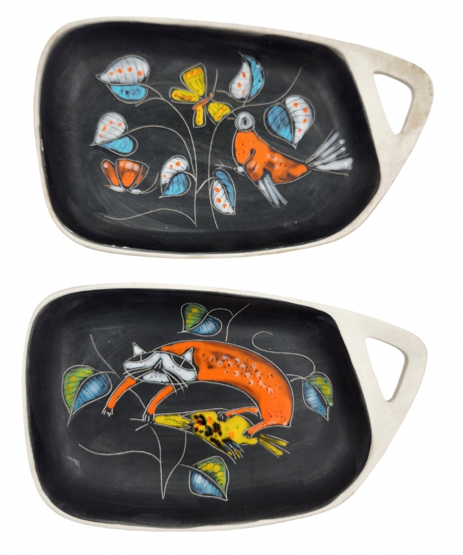 לחובבי וינטג' איטלקי של אמצע המאה העשרים - זוג כלי הגשה איטלקים עשויים קרמיקה מצויירת ביד באמייל, חתומים, 1960-1970 בקירוב, אורך: 23 ס"מ.