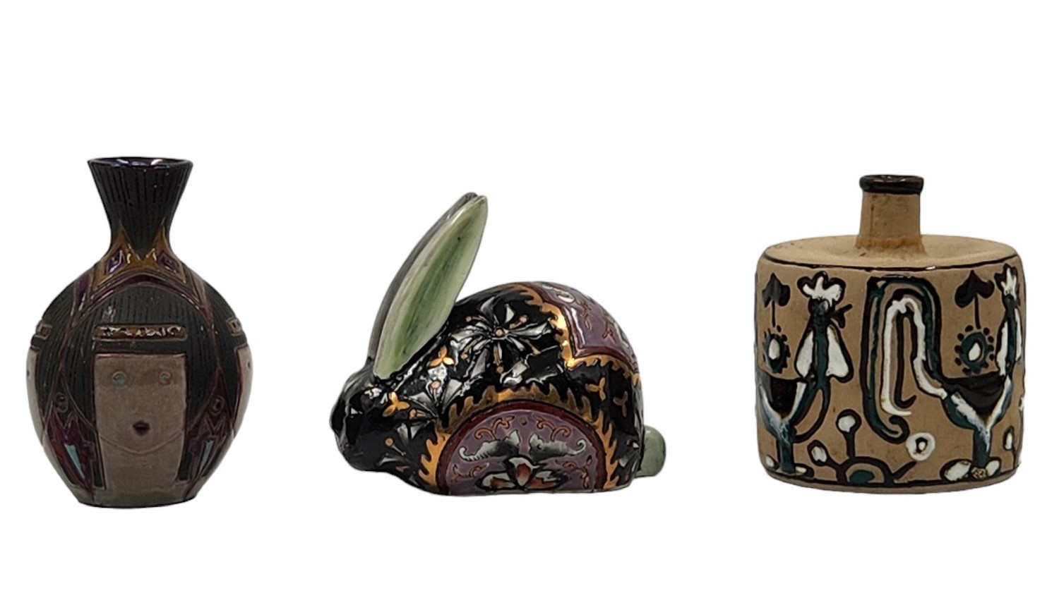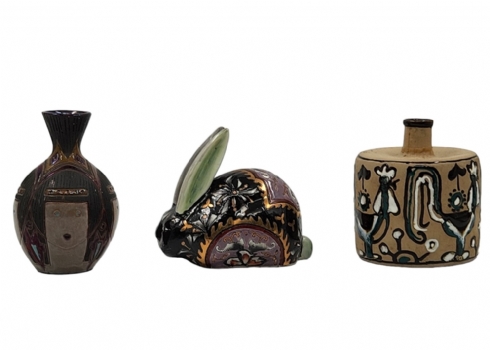 לוט של 3 חפצי נוי ישנים שונים עשויים קרמיקה, יצרנים ודגמים שונים, רק הארנב חתום, גובה הכד הגדול: 12 ס"מ, אורך הארנב: 11 ס"מ.