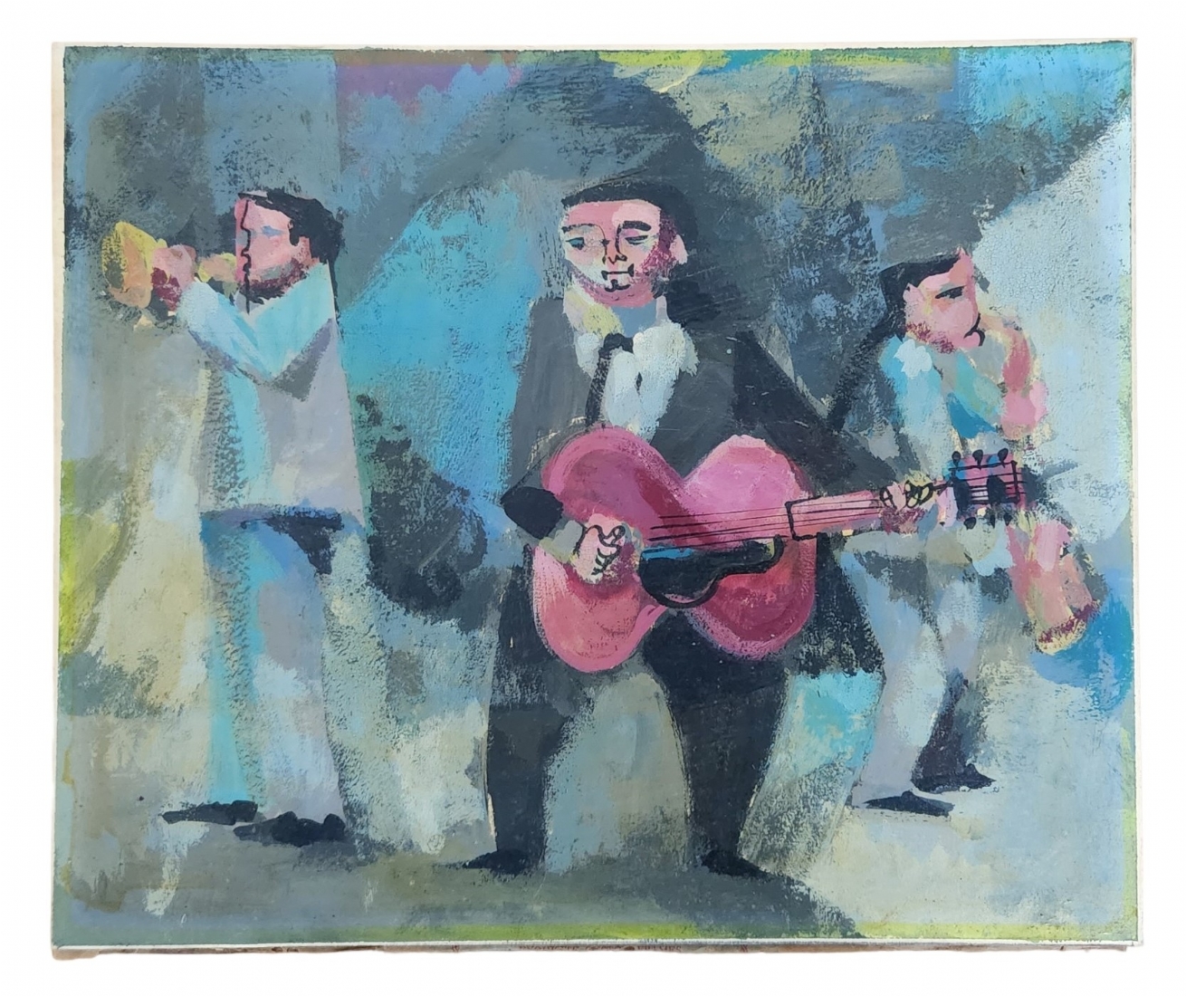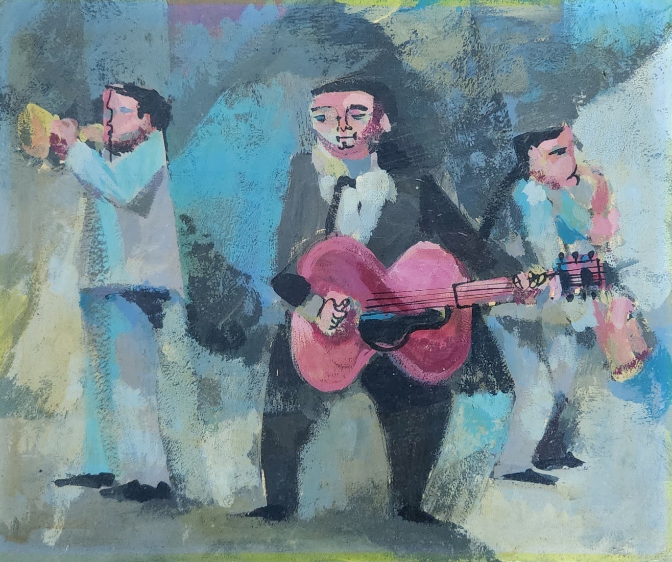 'שלושה נגנים' - ציור ישן, שמן על לוח, לא חתום, נשא בגבו לוחית Jankowski 1956
