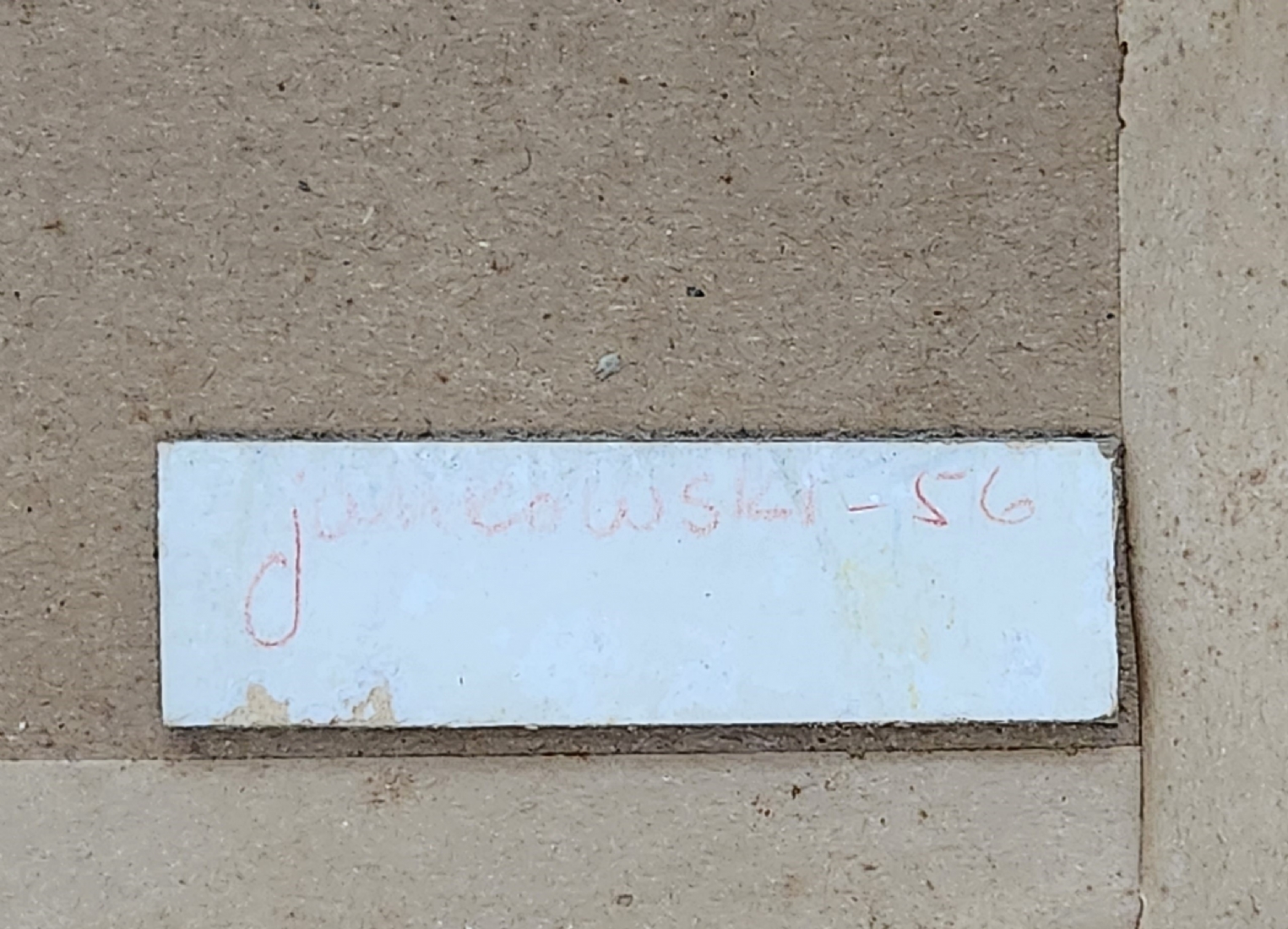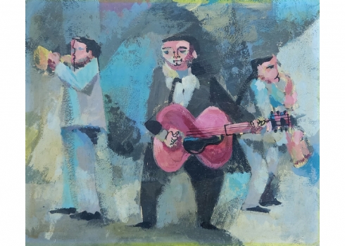 'שלושה נגנים' - ציור ישן, שמן על לוח, לא חתום, נשא בגבו לוחית ועליה השם: Jankowski והשנה 1956, מידות: 24X30 ס"מ.