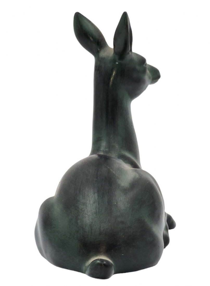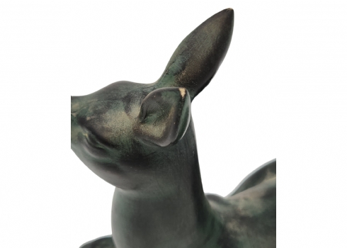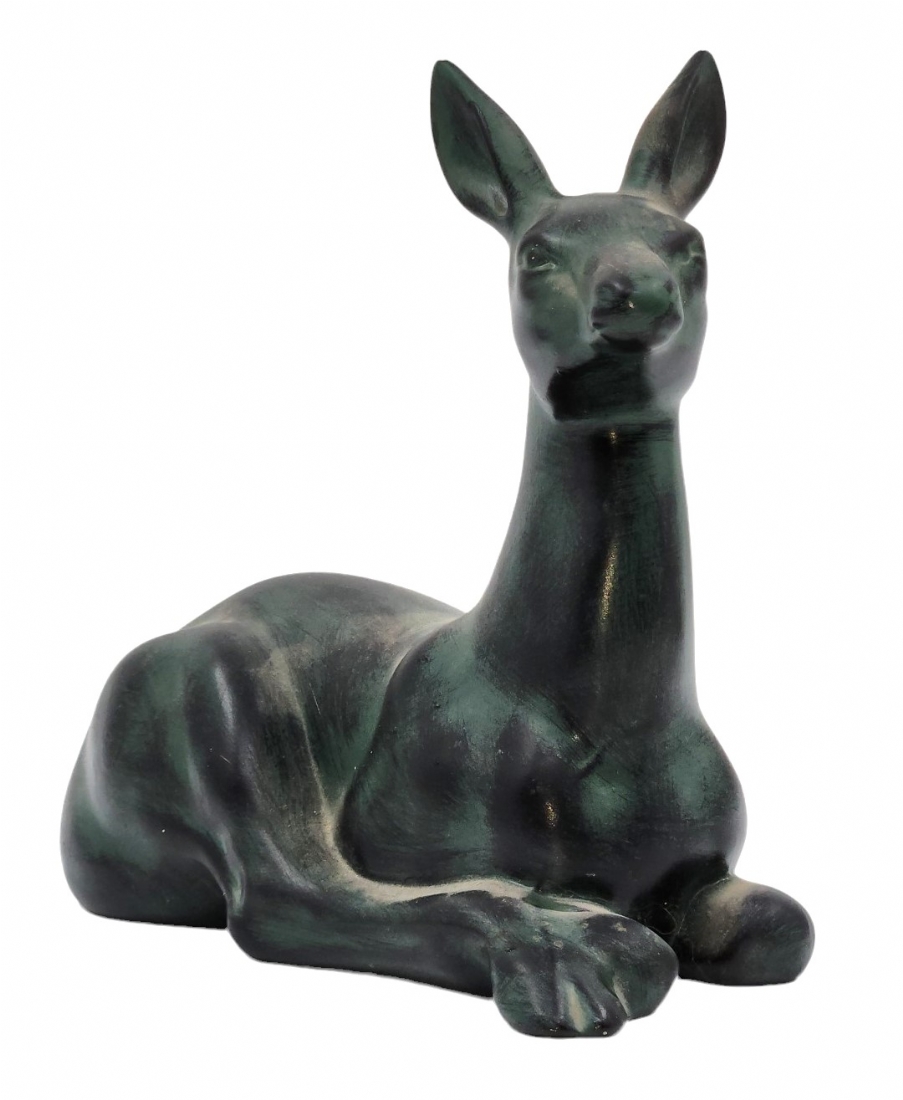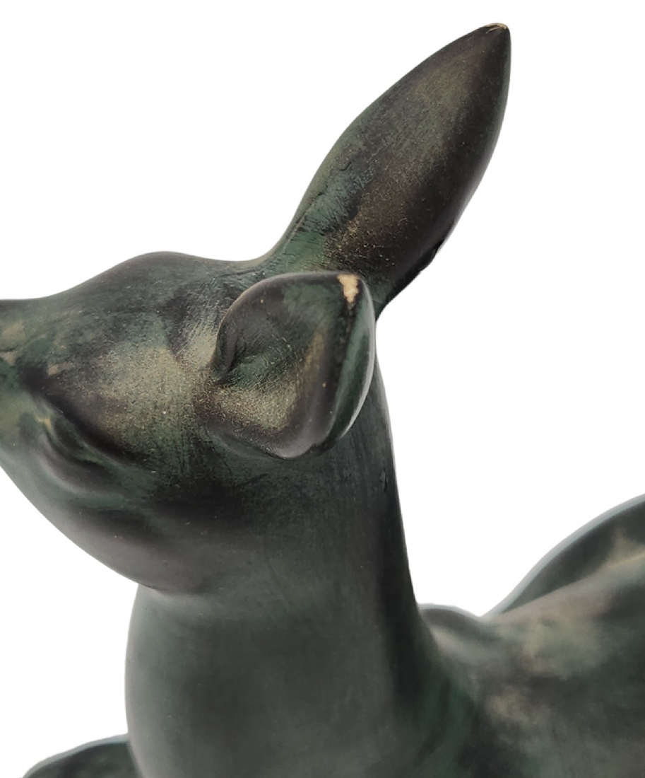 בדמות איילה יושבת, תוצרת הסטודיו לקדרות ואומנות 'D. Dinis', מעוטרת בצביעת יד בגוון ירוק, חתום.