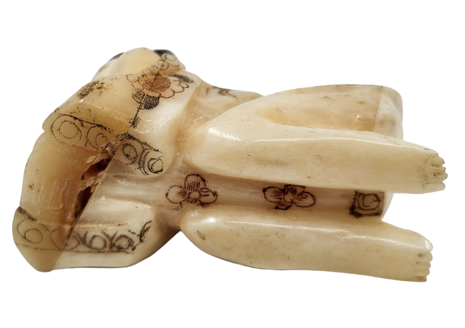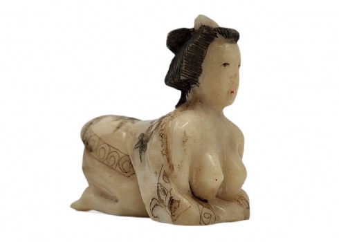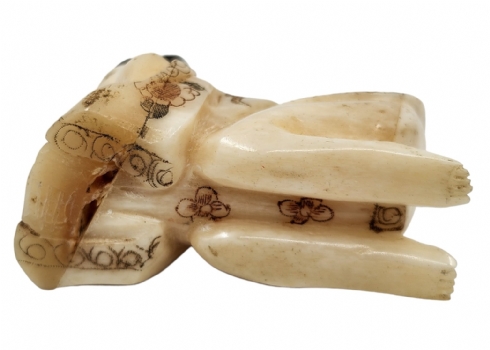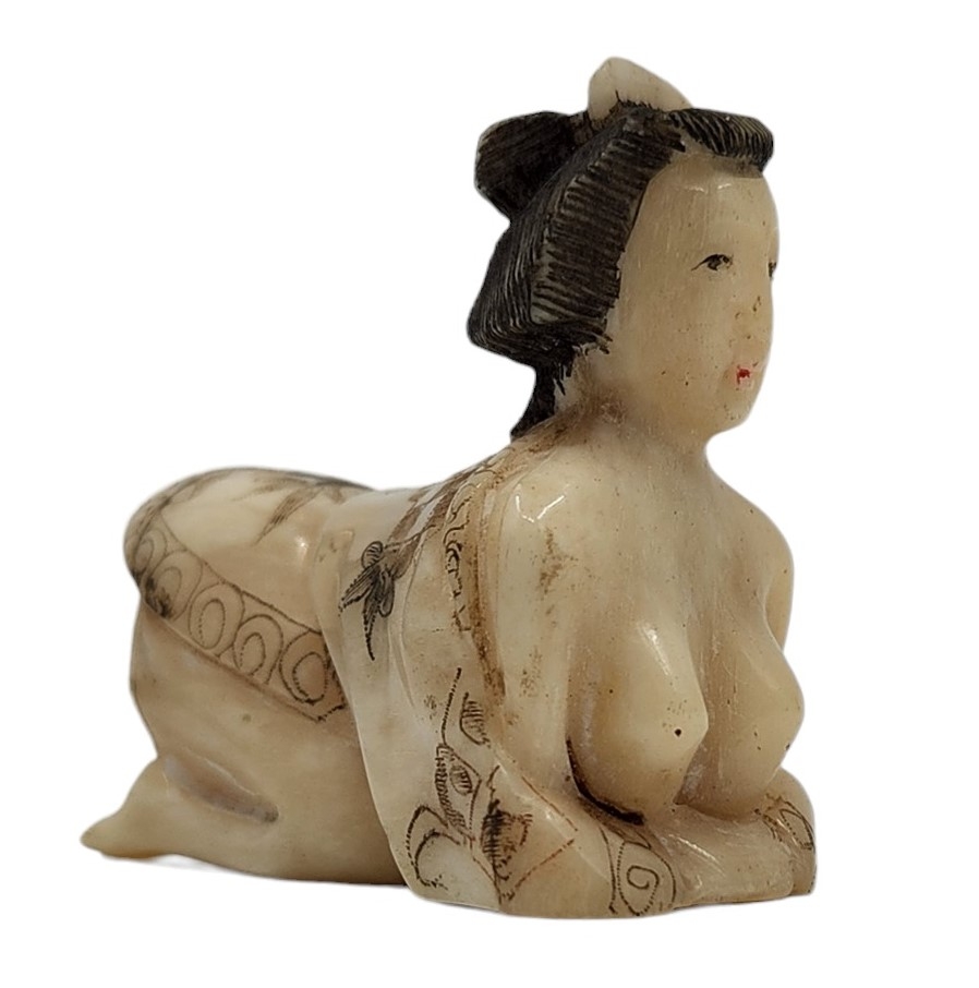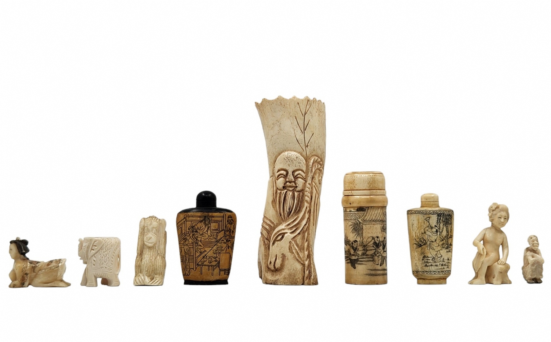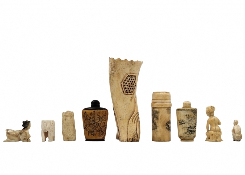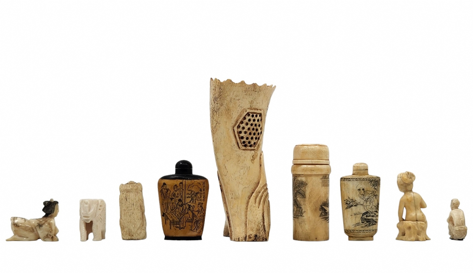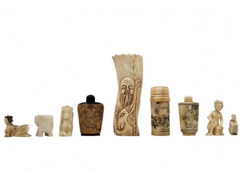לוט של 9 חפצי נוי דקורטיביים ישנים שונים עשויים כולם מעצם, מגולפים ומעוטרים, גובה בהתאמה מ: 5 עד 18 ס"מ.
