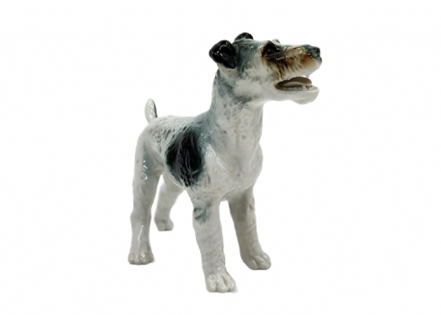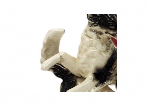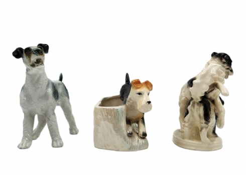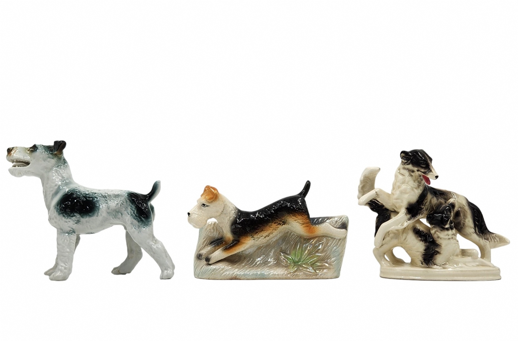 לוט של 3 פסלונים בדמות כלבים, עשויים קרמיקה ופורצלן, שניים חתומים (תיקון לרגל אחת), גובה הכלב הירקרק: 16 ס"מ, אורך בסיס הכלב הרץ: 18 ס"מ.