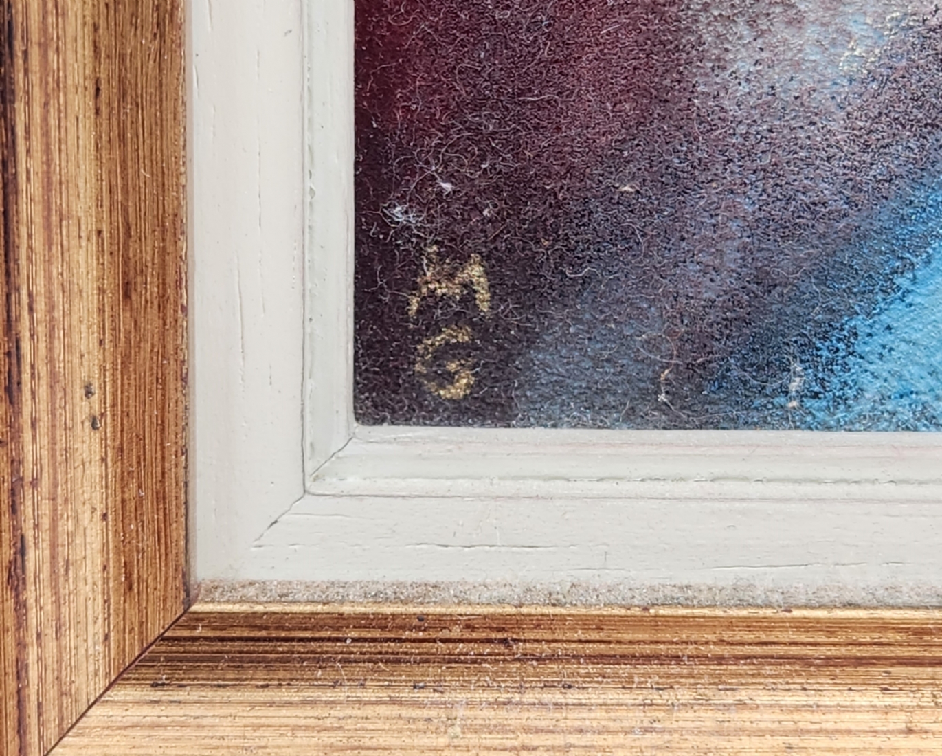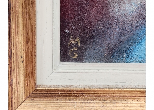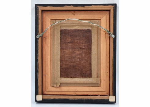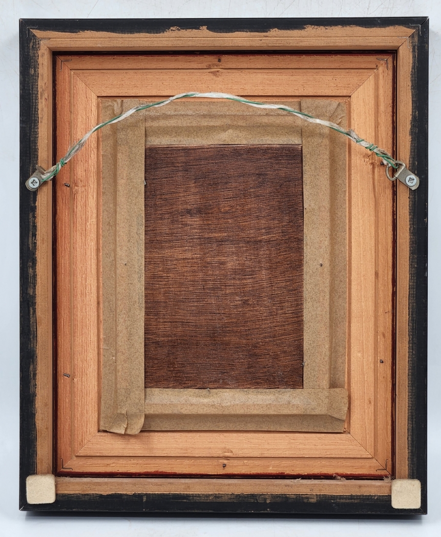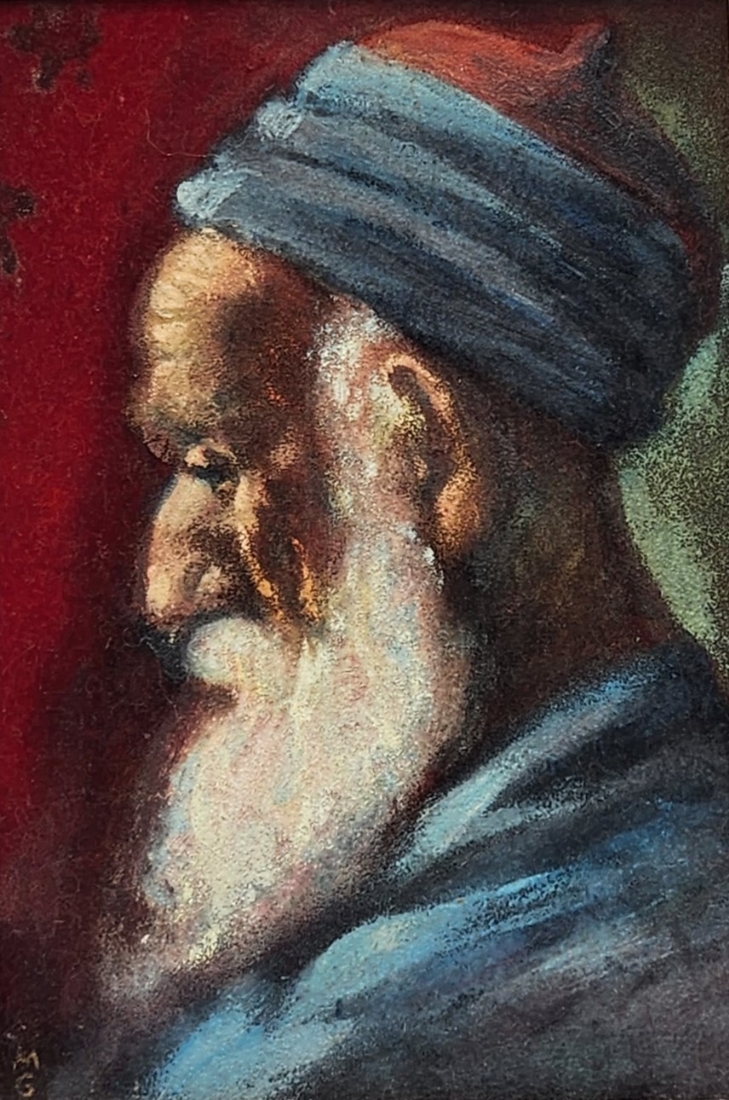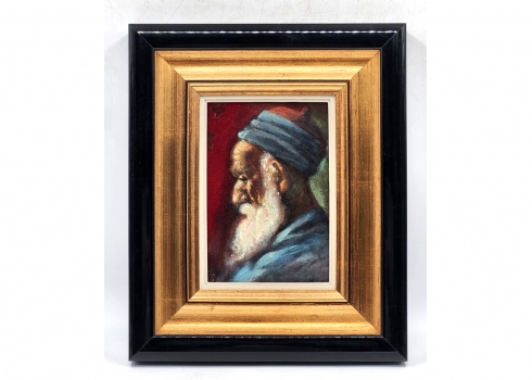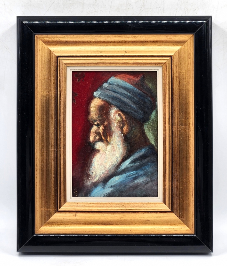 מאיר גור אריה (אמן בצלאל, Meir Gur Arieh) - 'פורטרט תימני זקן' - ציור שמן על בד קטיפה אדום, חתום בראשי תיבות: 'M.G', מידות: 19X13 ס"מ, מידות המסגרת: 30.5X25 ס"מ.