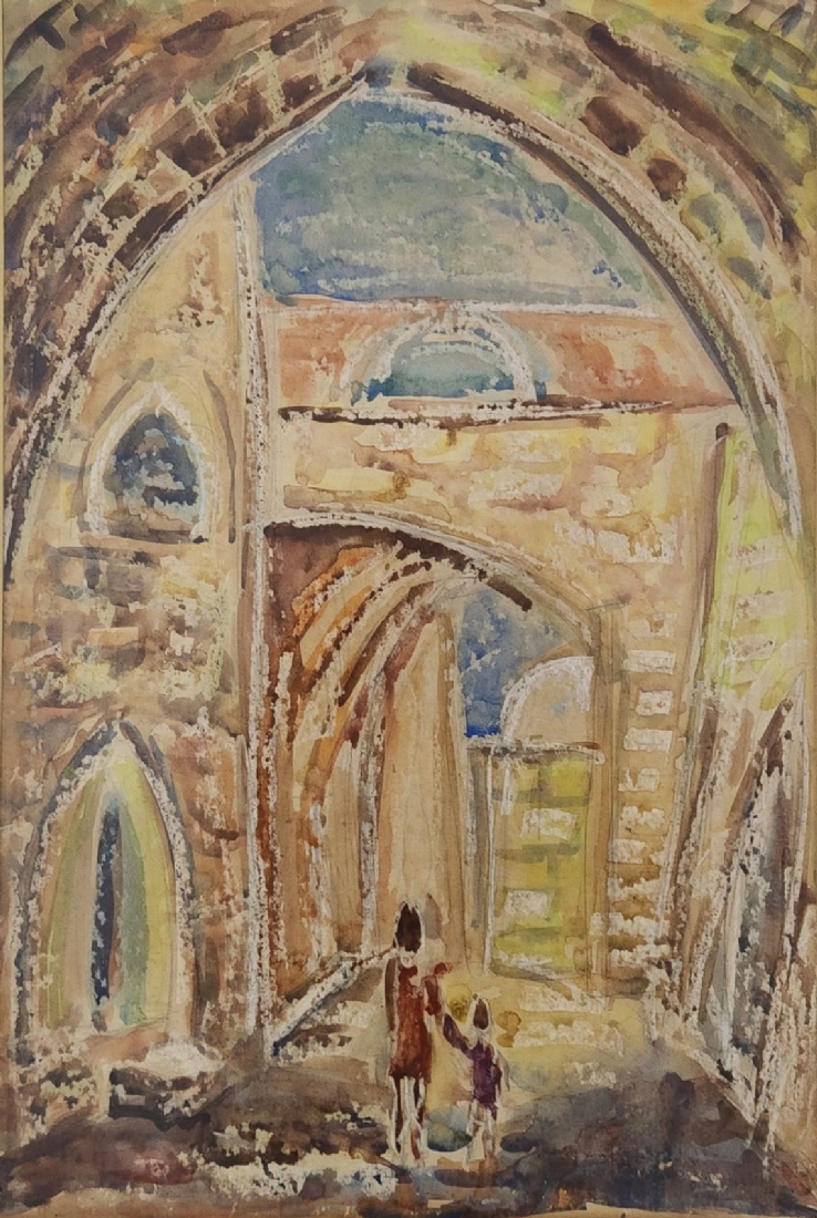 'אם וילד תחת קשתות ירושלים' - רישום ואקוורל על נייר