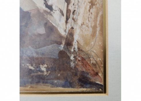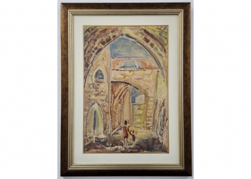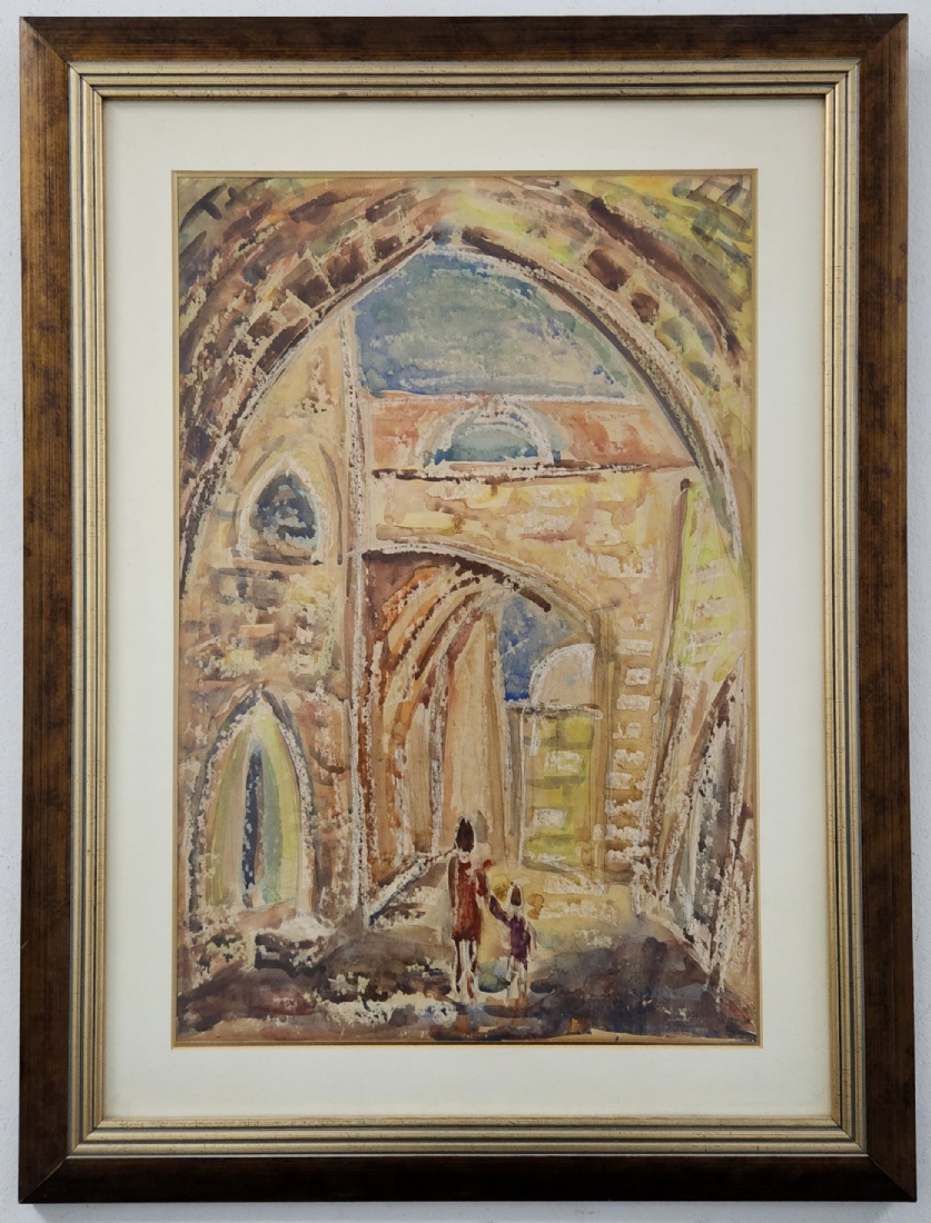 'אם וילד תחת קשתות ירושלים' - רישום ואקוורל על נייר, חתום (חתימה לא ברורה, מימין למטה, נשמח לעזרה בזיהוי האמן), מידות: 57X38 ס"מ, מידות המסגרת: 77X57.5 ס"מ.