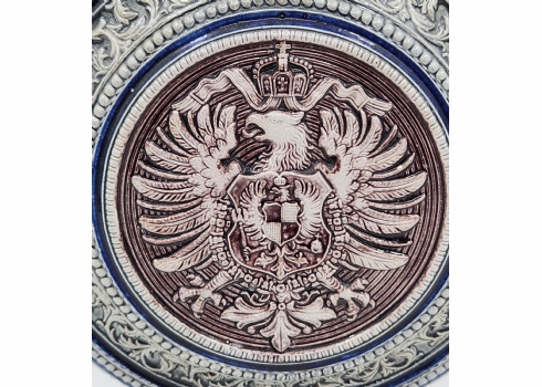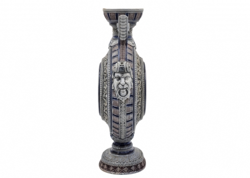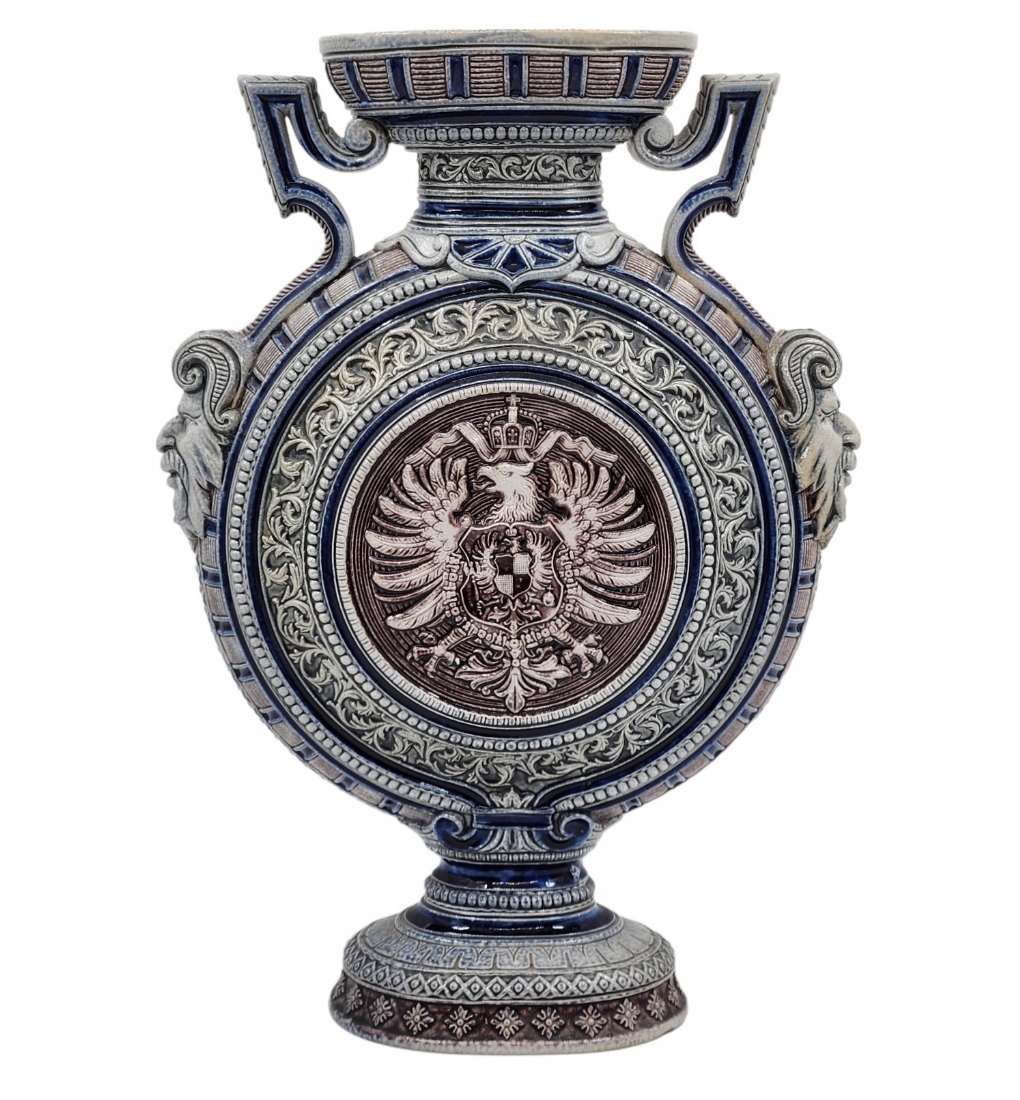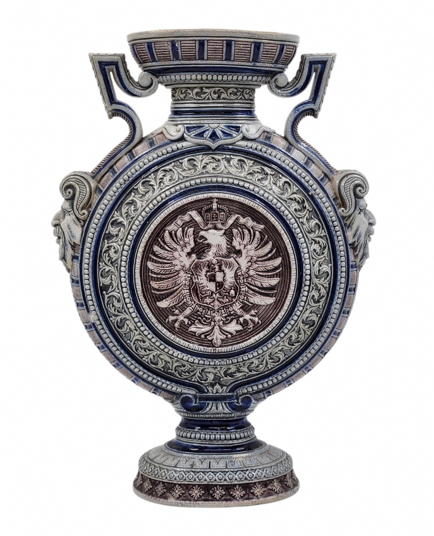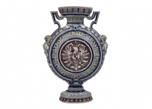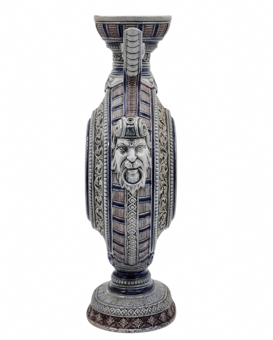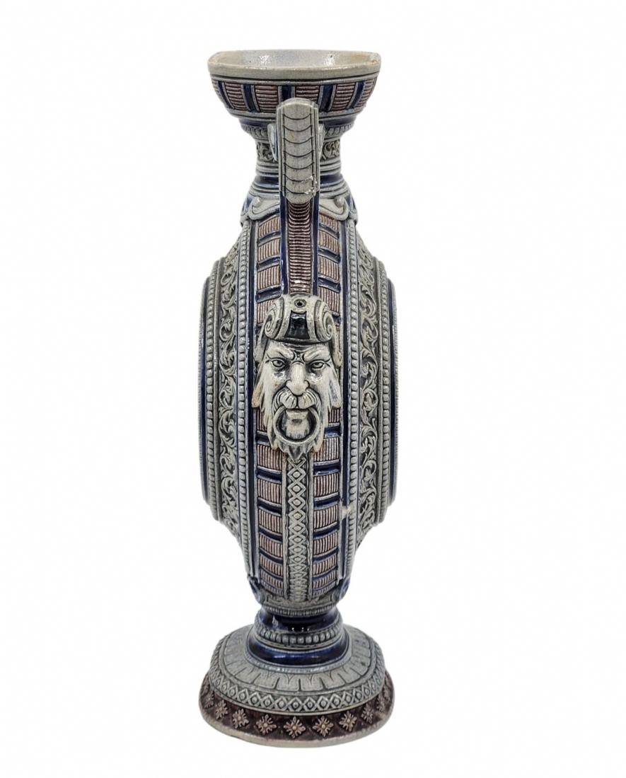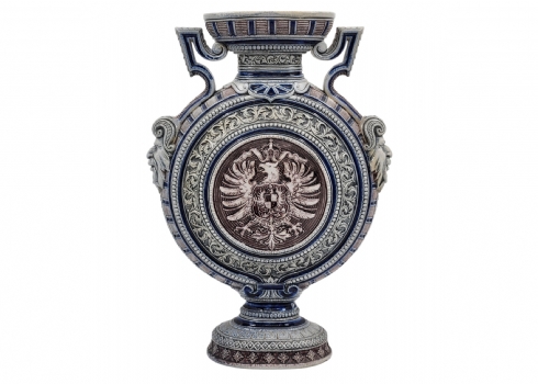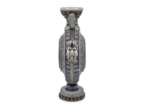 אגרטל גרמני מתוצרת: 'Merkelbach & Wick', עשוי חרס מעוטר בזיגוג מלח (Salt-glaze), ועיטורי בלט מודגשים בכחול קובלט בסגנון הניאו רנסנס, ידיות מעוצבות בצורת מסכות גרוטסקיות, חתום בחותמת שבה השתמש היצרן בין השנים 1880-1921, רוחב כולל הידית: 21 ס"מ, גובה: 30 ס"מ.