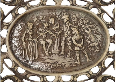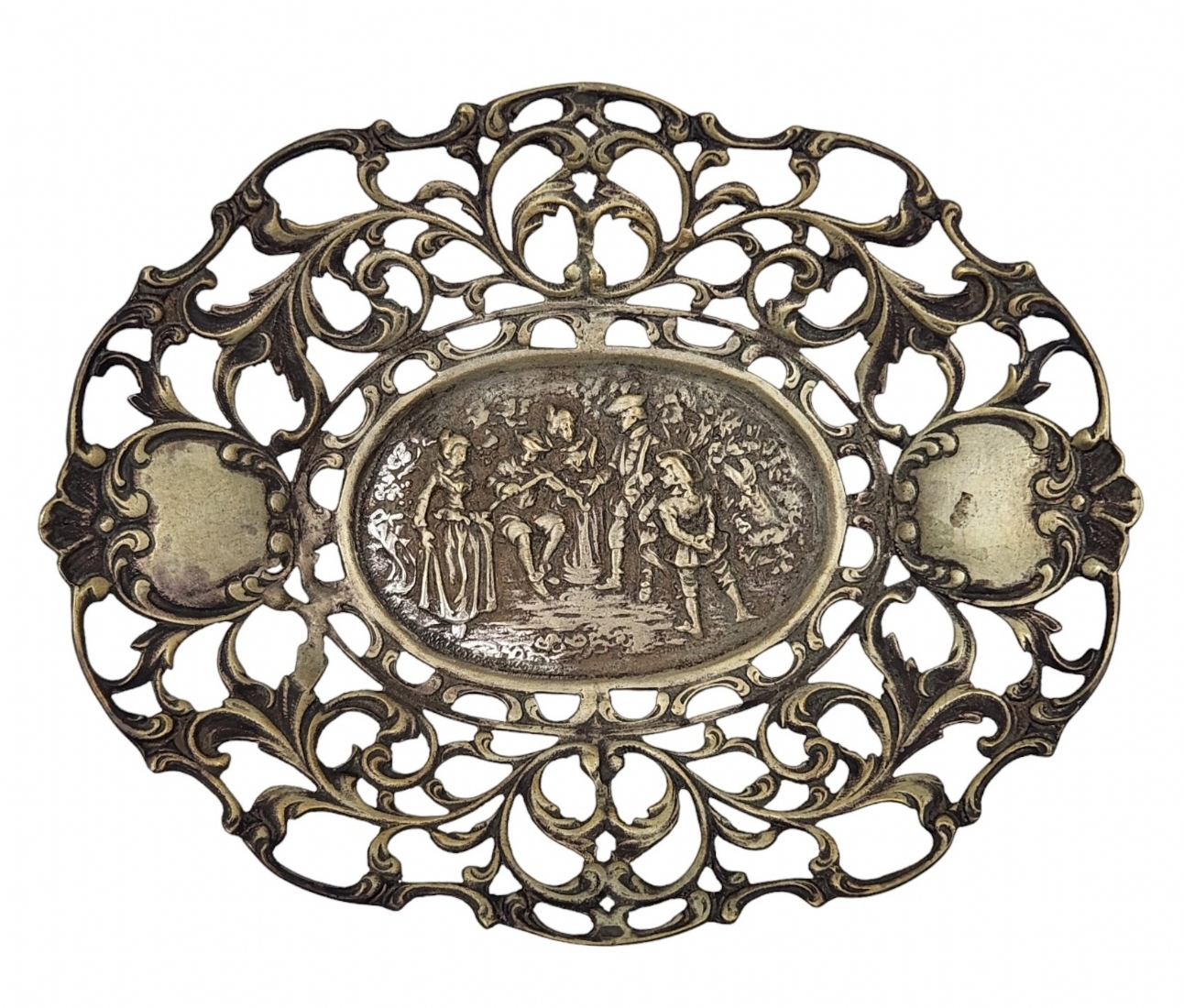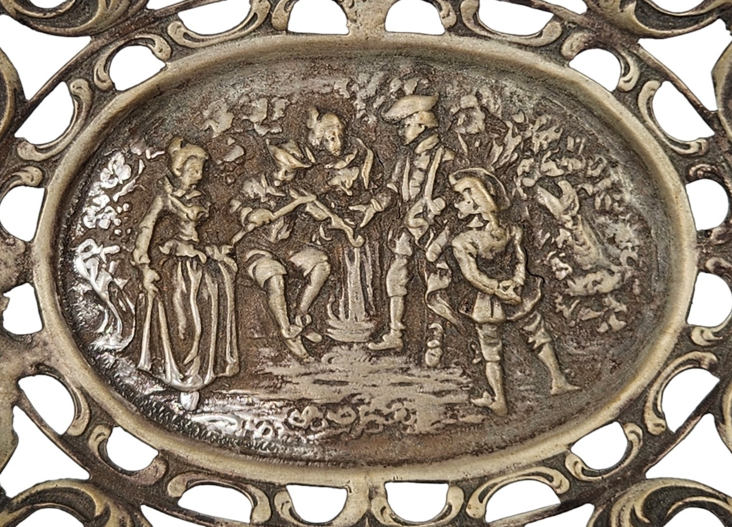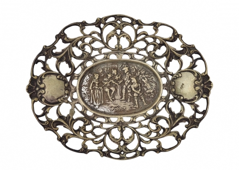 סלסלת כסף עשויה כסף '800', לא חתומה אך טוהר הכסף נבדק, שני סדקים קטנים לגב, משקל: 87 גרם, רוחב: 12.5 ס"מ, אורך: 16 ס"מ.