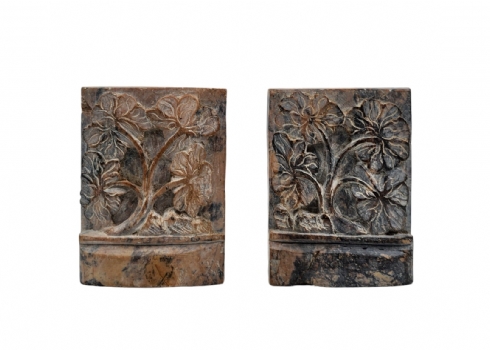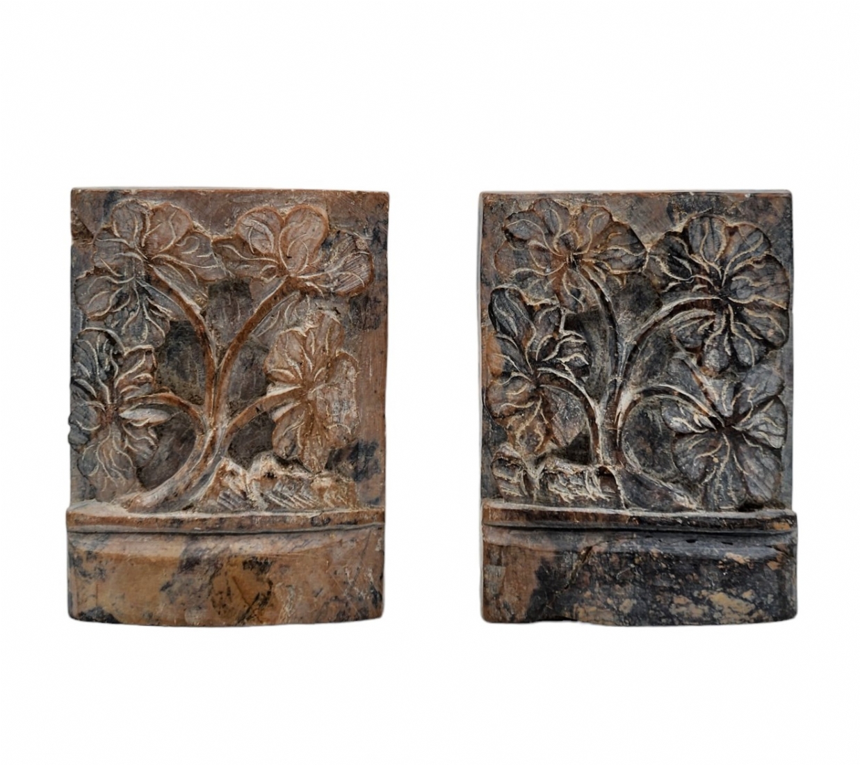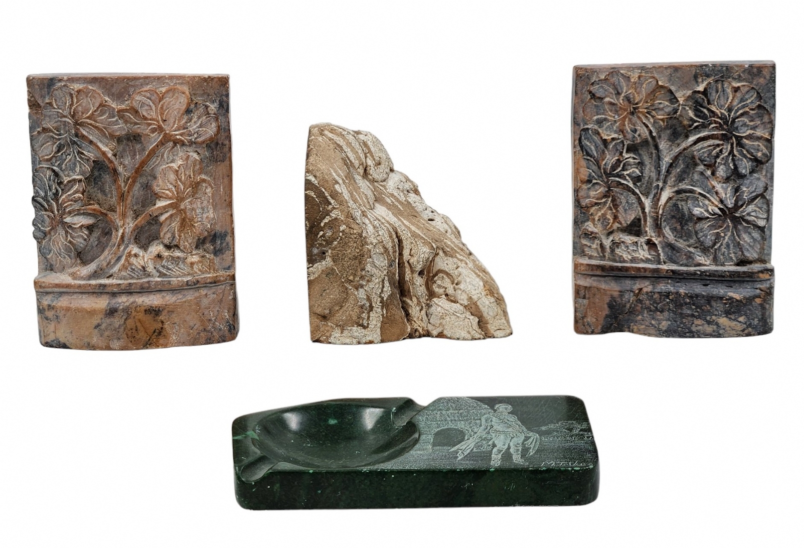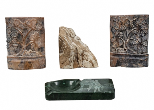 לוט של 4 קישוטי אבן טבעית שונים, אחד חתום, אורך המאפרה: 14.5 ס"מ, גובה זוג הקישוטים הסגולים: 13.5 ס"מ.