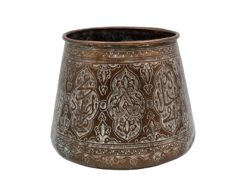 עשוי פליז מעוטר בחריטת יד אמן,סוריה, 1870-1890 בקירוב,גובה: 16 ס"מ,קוטר: 20 ס"מ.