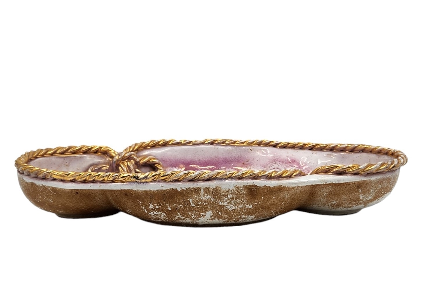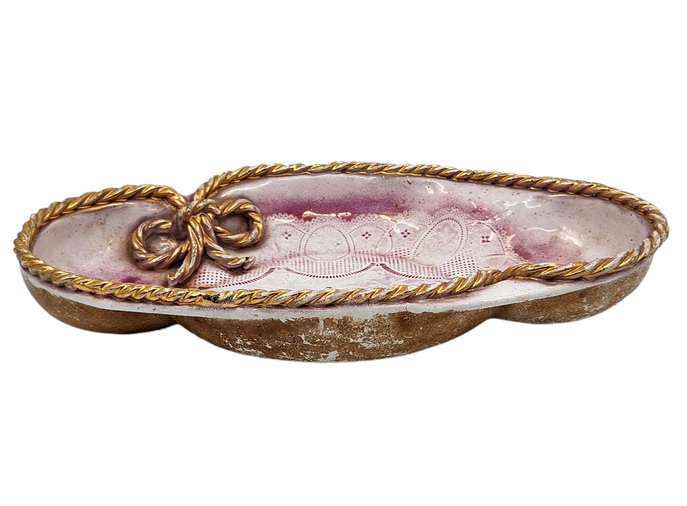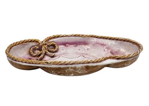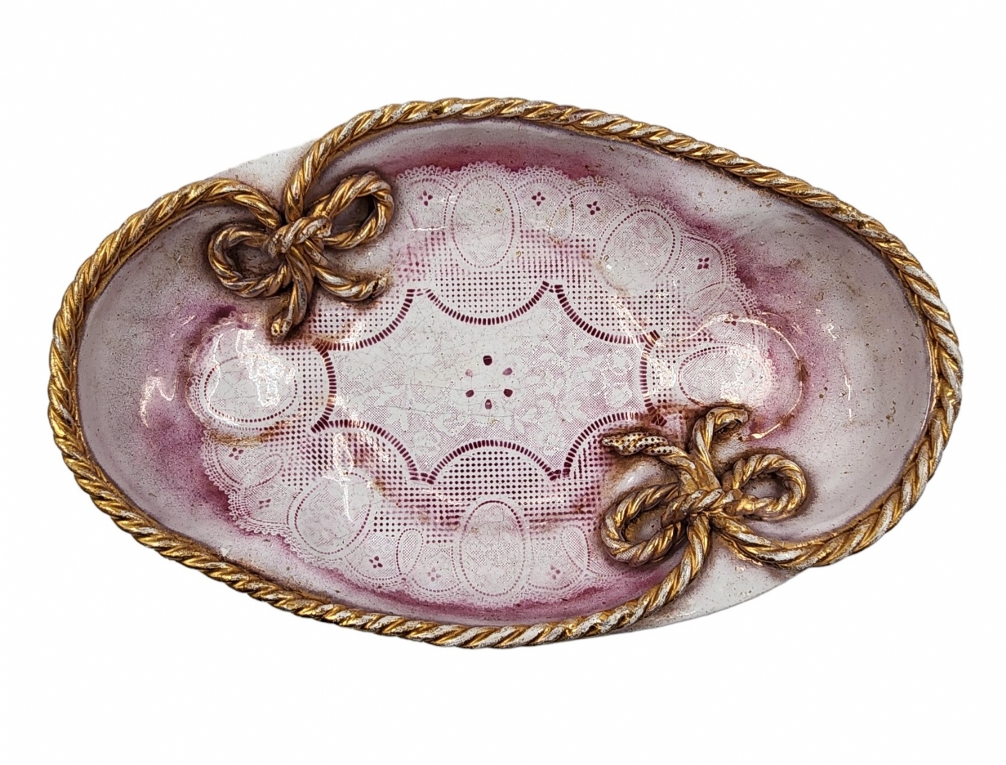 קערה אובלית, מעוטרת בהדפס תחרה ורוד וצמה קלועה לאימרה עם שאריות זהב.לא חתומה.גובה: 5 ס"מ.קוטר: 33 ס"מ.