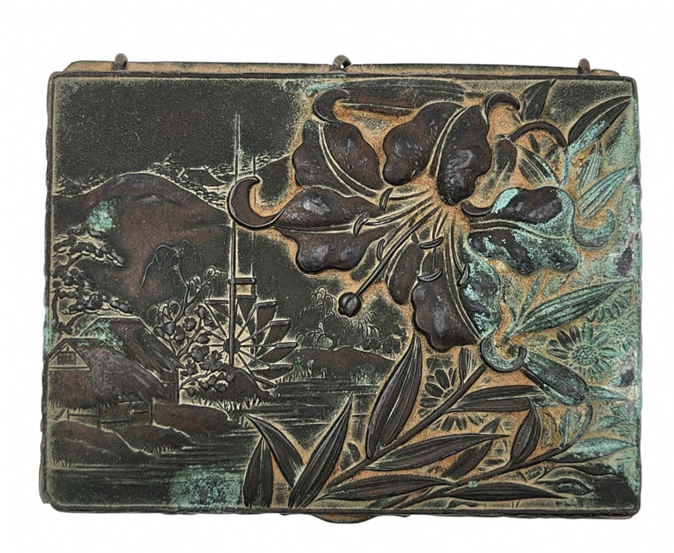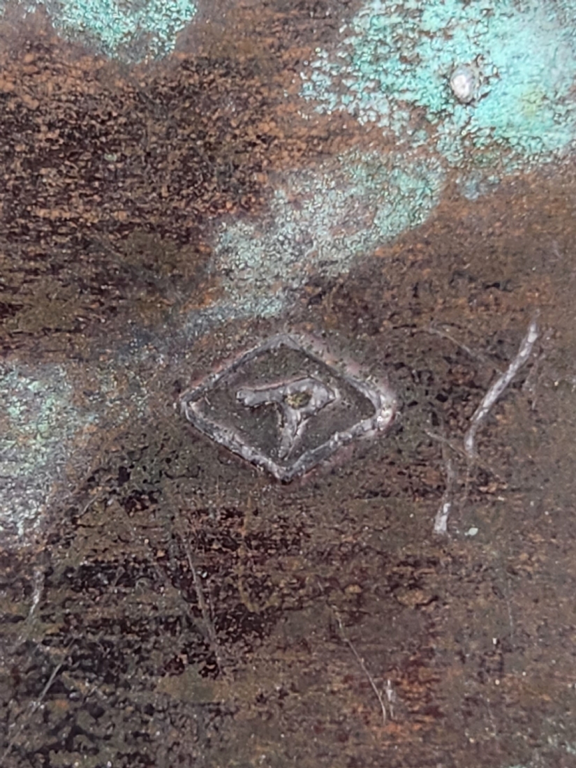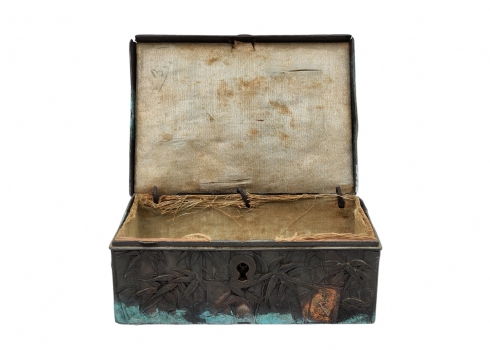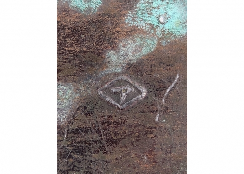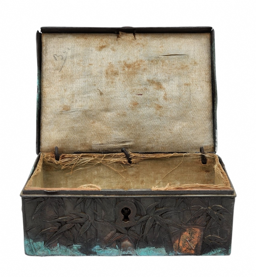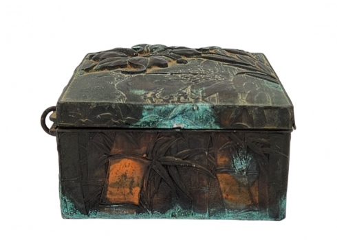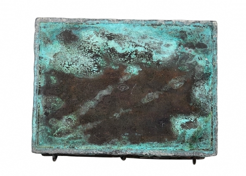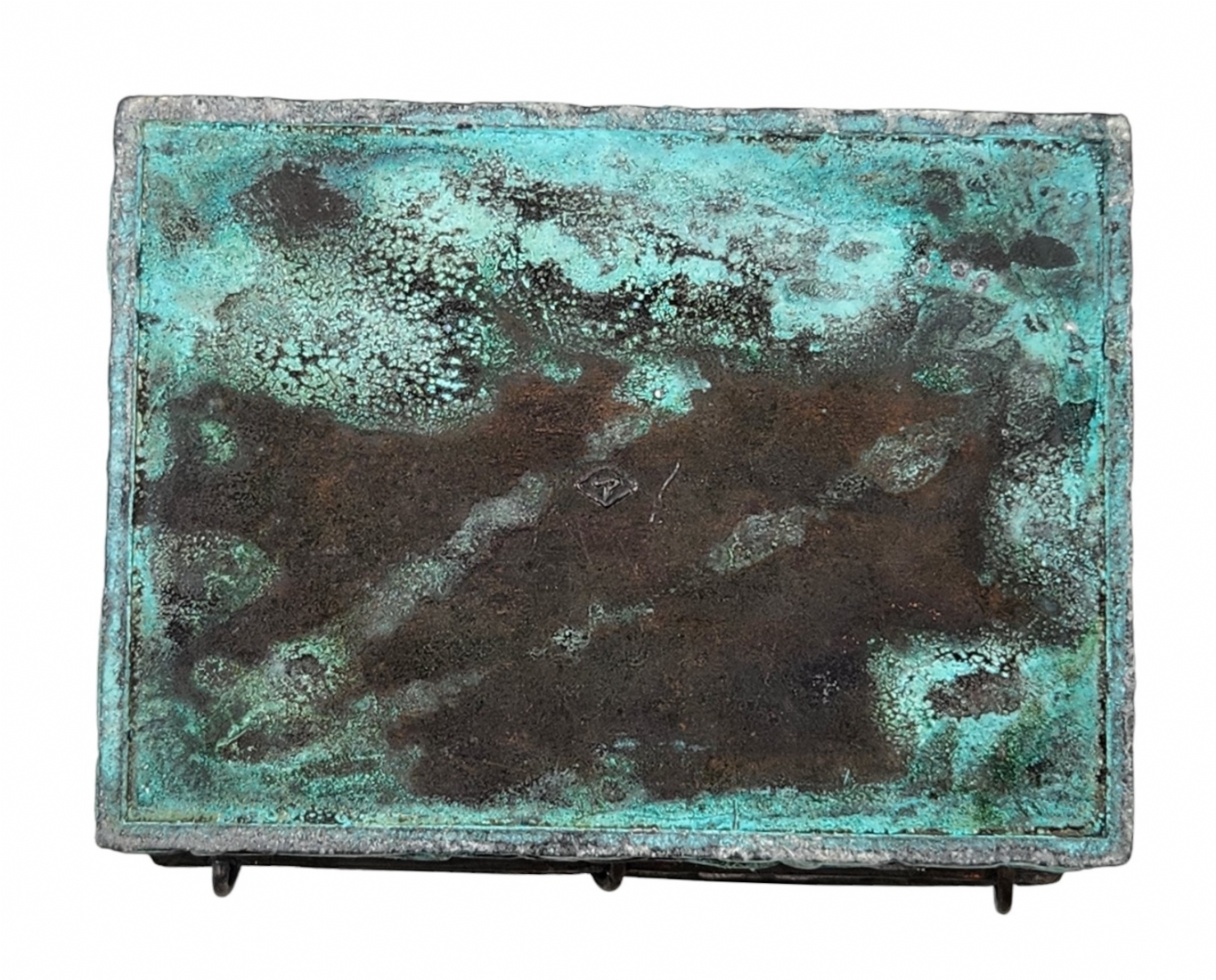 עשויה פיוטר מצופה בנחושת, חיפוי פנימי עשוי בד, חתומה1900-1910 בקירובגובה: 6 ס"מ, מידות הבסיס: 9.5X12.5 ס"מפגמים וסימני קורוזיה