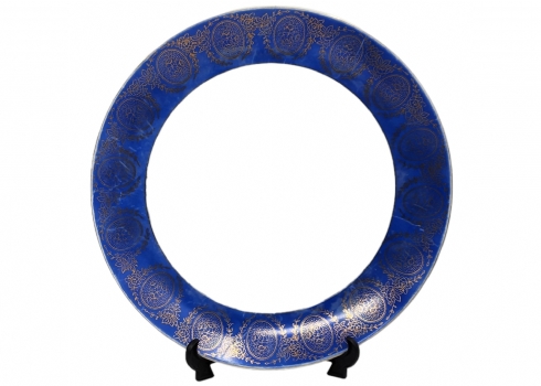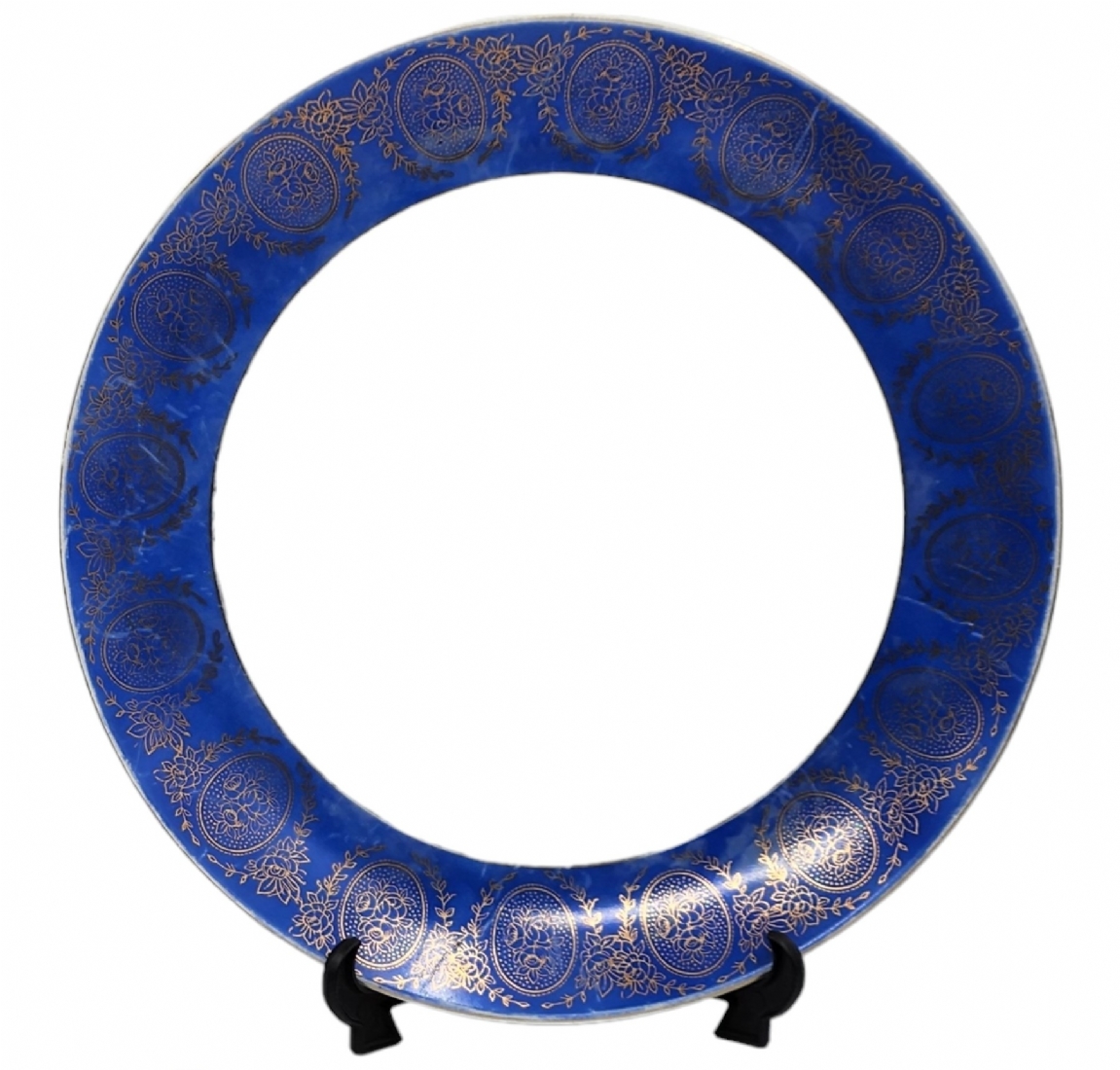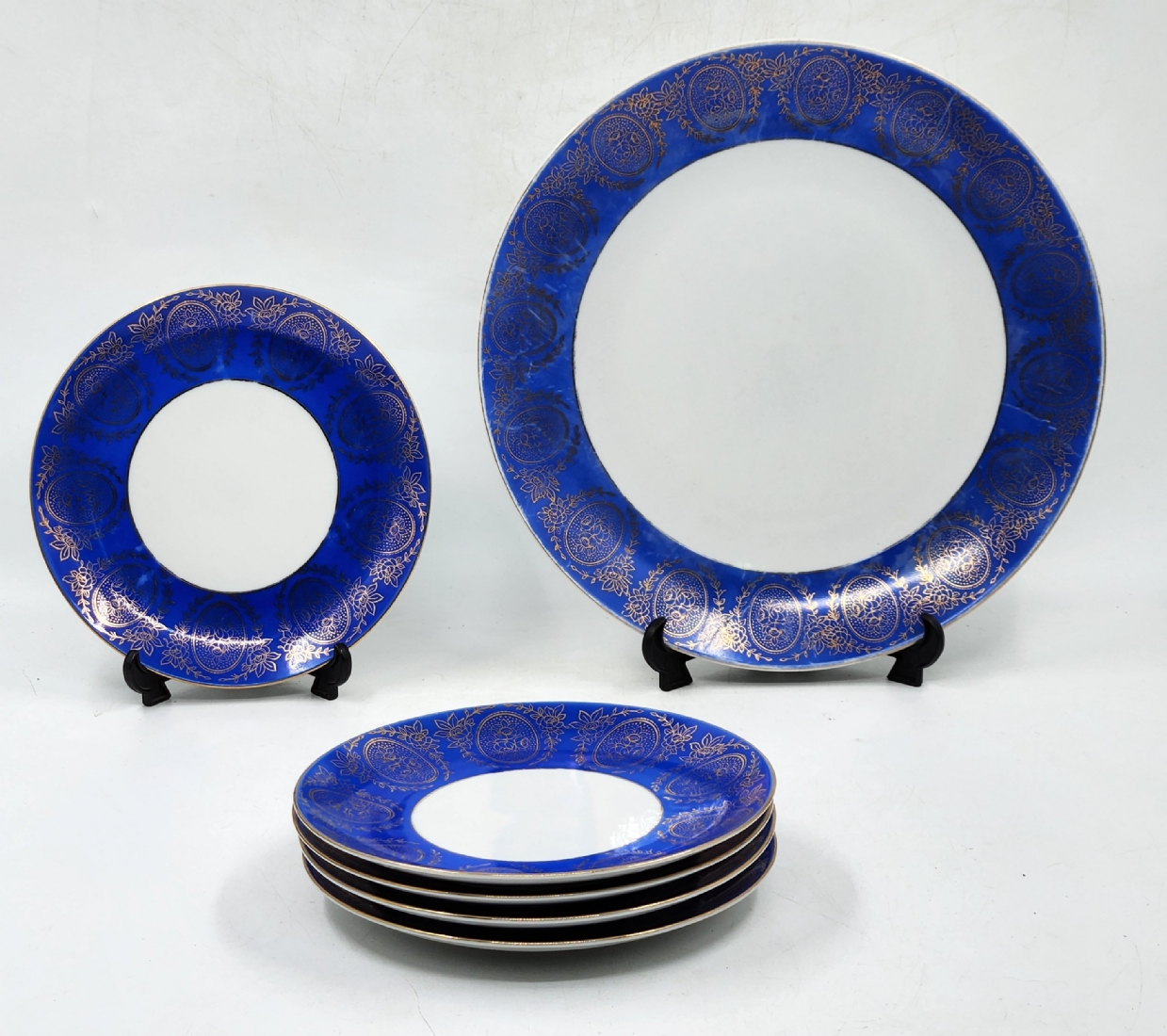 כולל:צלחת גדולה מרכזית ועוד 5 צלחות עוגה אישיותמעוטר בזהב על רקע אימרה בגוון כחול, חתוםקוטר בהתאמה: 19.5 ס"מ, 30.5 ס"מ