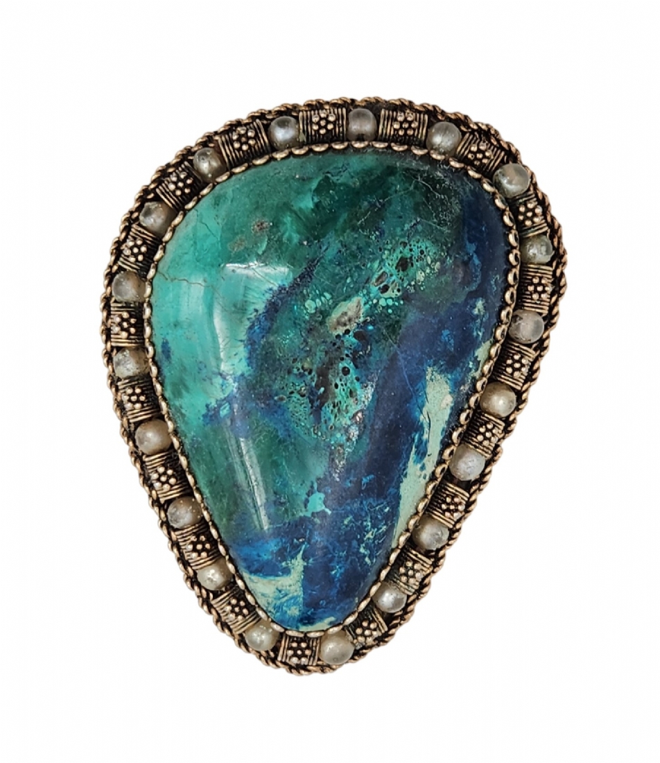 סיכה ישראלית גדולה עשויה כסף 'סטרלינג' (925) מוזהב, חתום, משובץ אבן אילת טבעית גדולה וסביבה פניני דמי, אורך: 6.5 ס"מ, משקל כולל: 41.43 גרם.