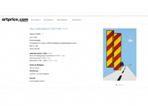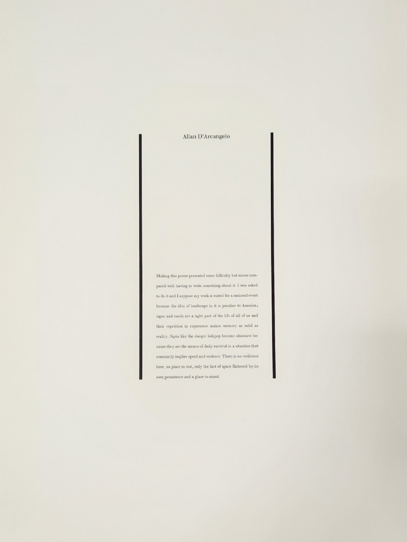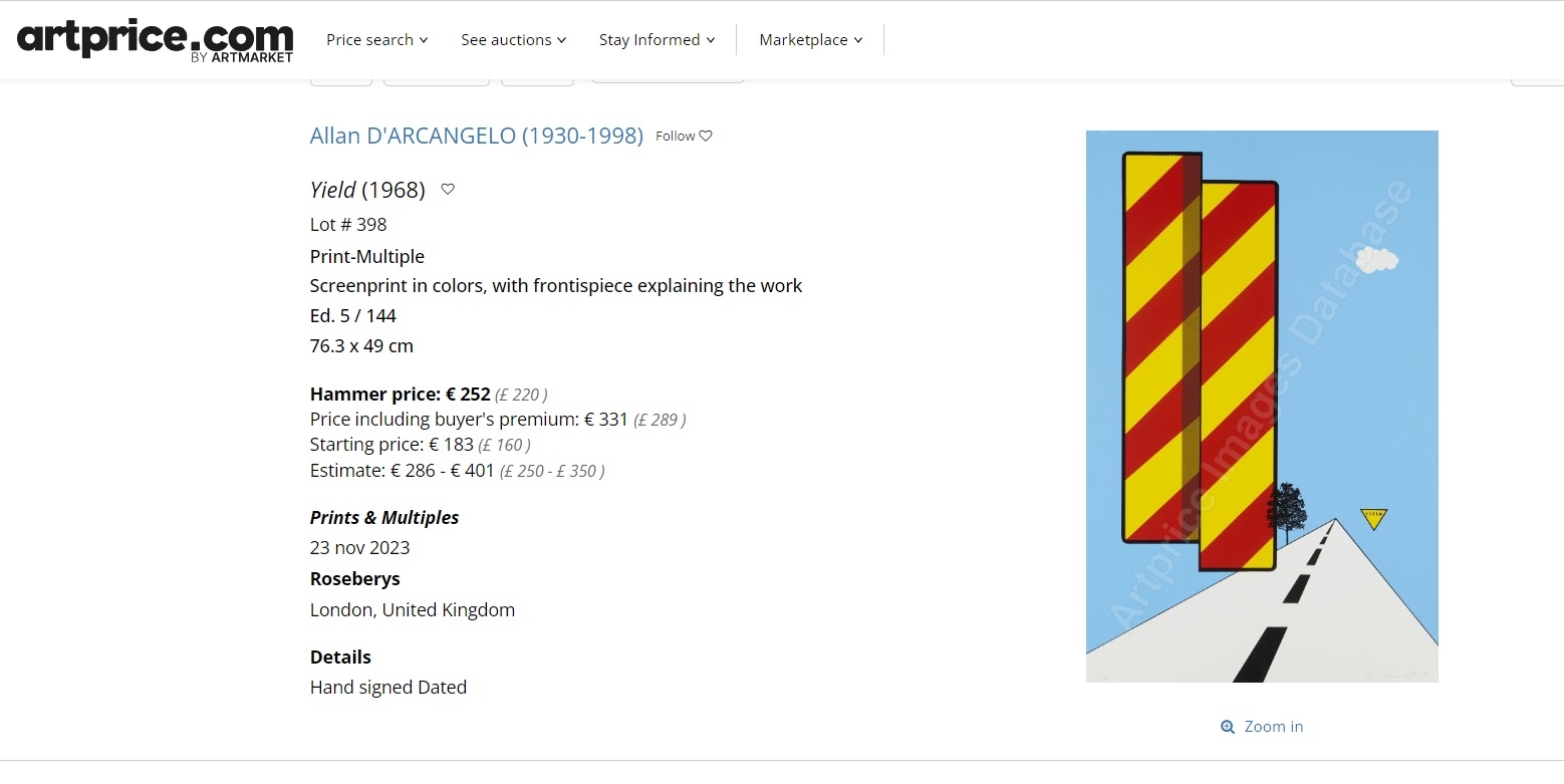 אלן ד'ארקנג'לו (Allan D'Arcangelo) - 'מתן זכות קדימה' (Yield) - ליטוגרפיה, הדפס מסך על נייר, איכותי מאוד, מתוך האוסף הלאומי לאמנויות יפות 1967, חתום בעיפרון, מתוארך 1968 וממוספר 78/144, ללא מסגרת, מידות: 76X49 ס"מ. (* מצורף להמחשה בלבד, צילום מסך מבית מכירות בחו"ל בו נמכרה ליטוגרפיה זהה).