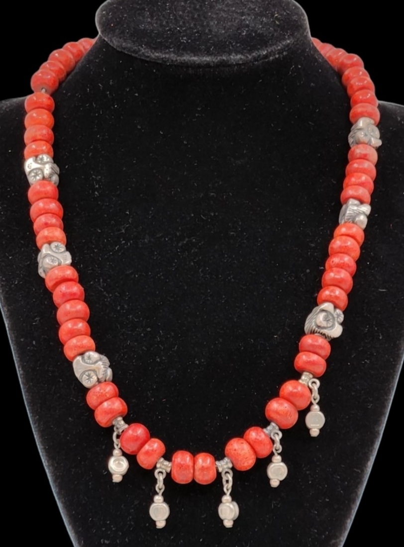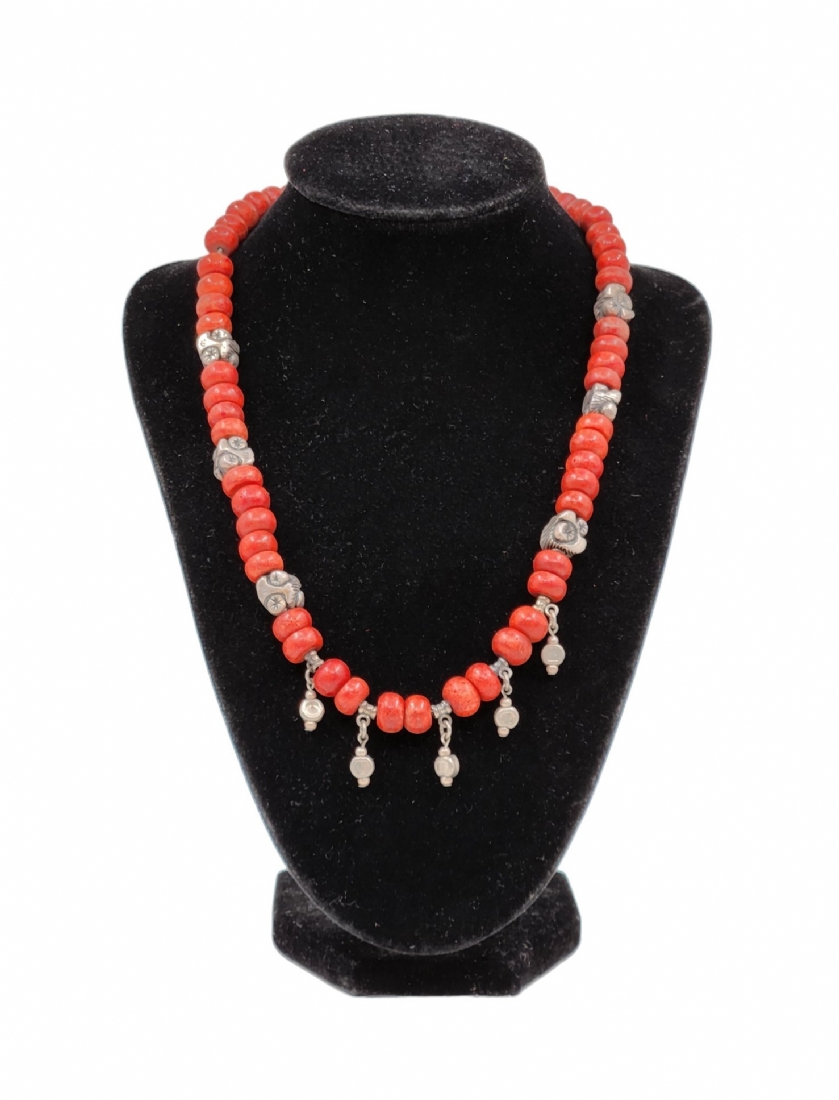 מחרוזת עשויה חרוזי קורל וספייסרים עשויים כסף 'סטרלינג' (925) חתום, רוחב ממוצע של חרוז: 1 ס"מ, אורך המחרוזת: 45 ס"מ.