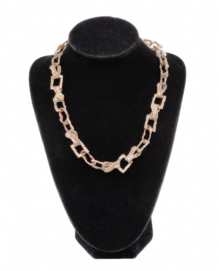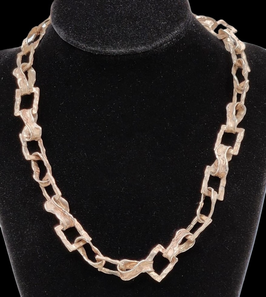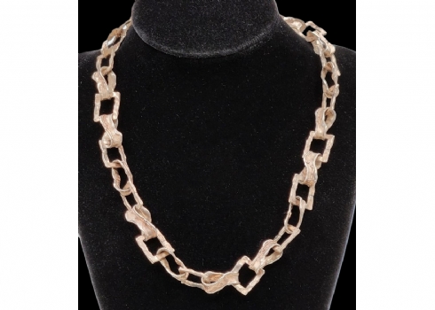 שרשרת עשויה כסף, 'סטרלינג' (925), לא חתומה אך טוהר הכסף נבדק, משקל: 37 גרם, רוחב החוליות: 10.5 ס"מ, אורך: 45 ס"מ.