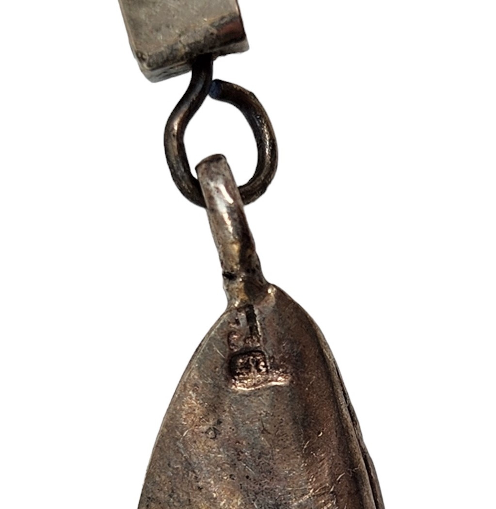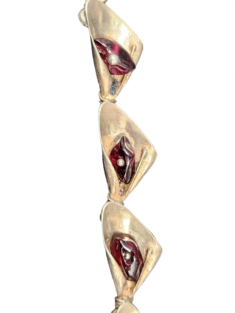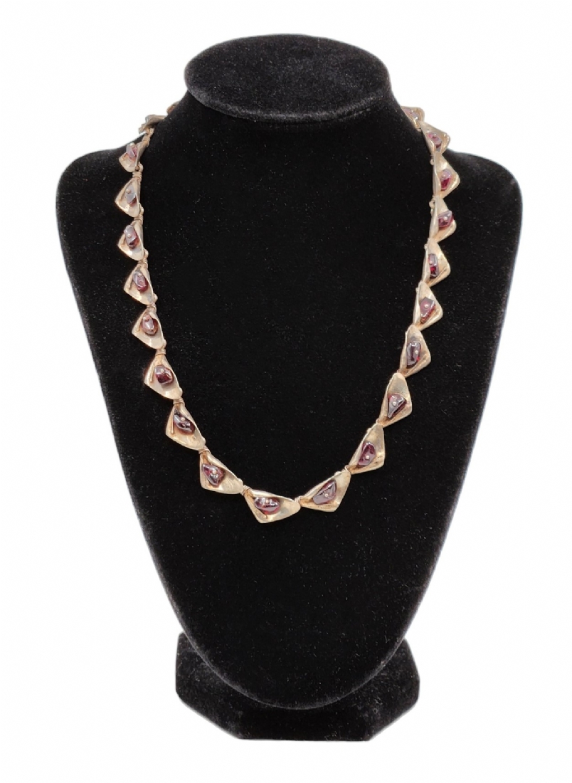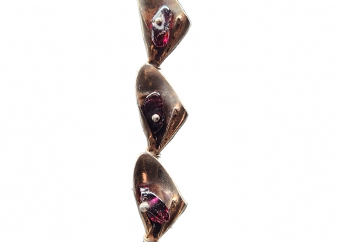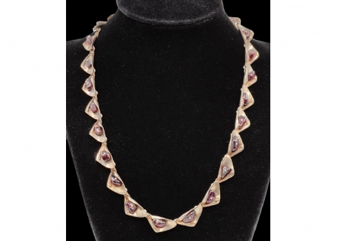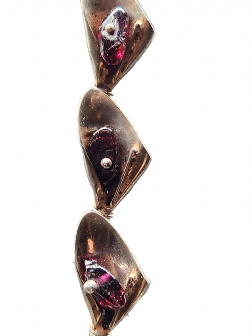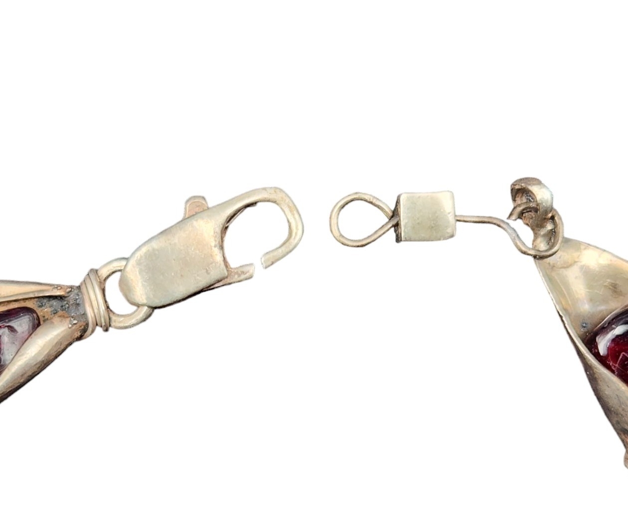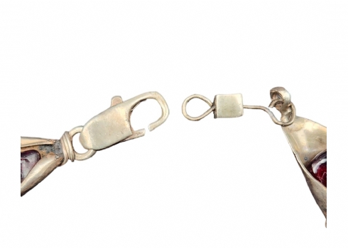 מחרוזת כסף, עשויה כסף 'סטרלינג' (925), חתומה, משובצת ענברים מסוג (Cherry Amber), אורך כל חוליה: 2.5 ס"מ, אורך: 45 ס"מ, משקל כולל: 41 גרם סה"כ.