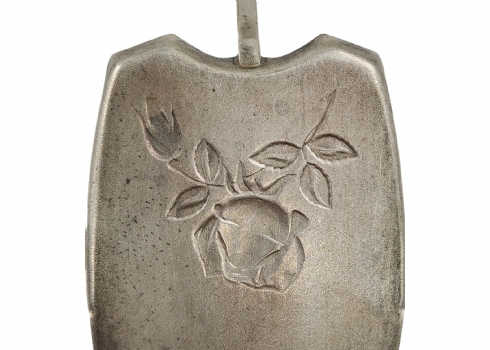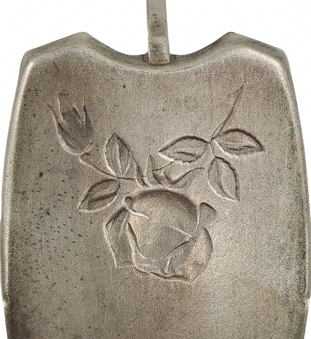 כף כסף רוסית (סוביטית) לעוגה, עשויה כסף 916', חתום, מעוטרת עיטורי בלט של שושנה פורחת, שאריות הזהבה על הידית, משקל: 77.84 גר', רוחב: 5 ס"מ, אורך: 24.5 ס"מ.
