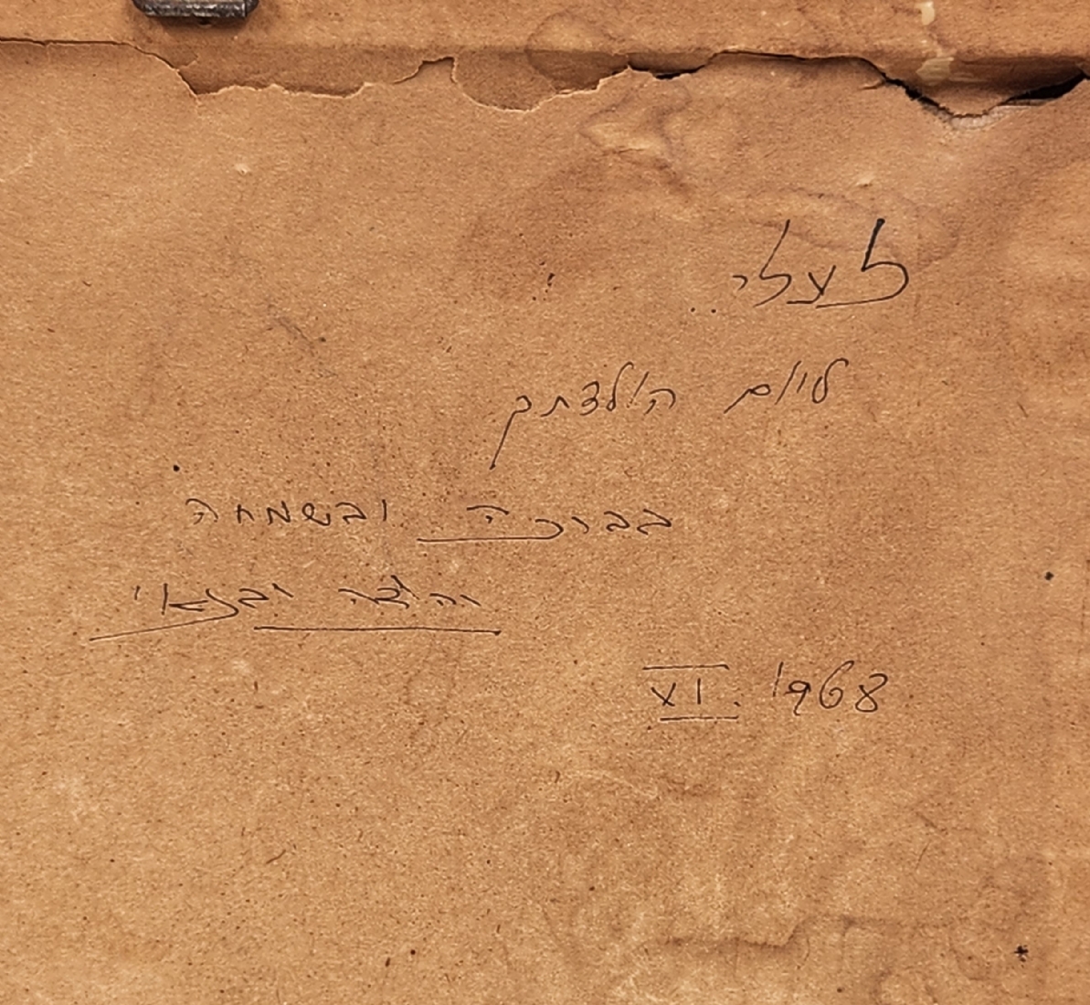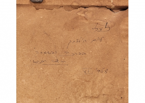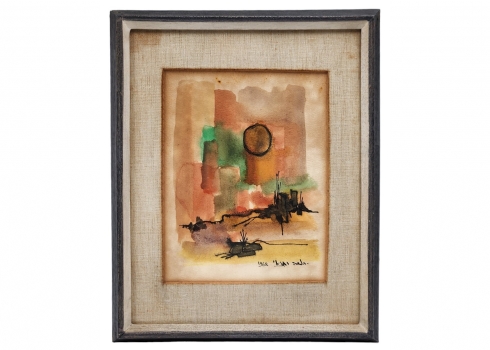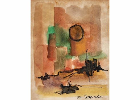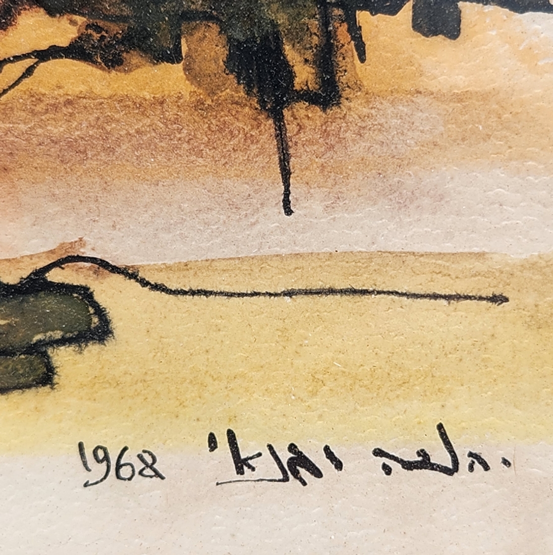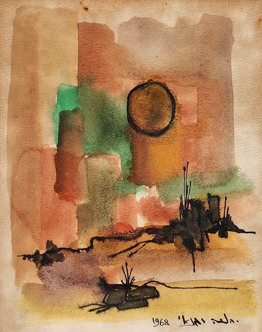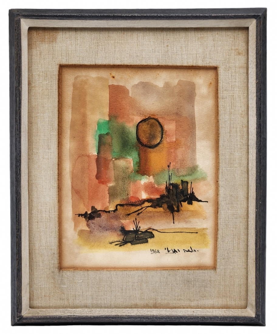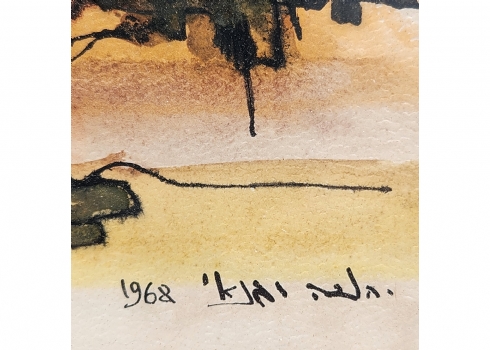 אקוורל על נייר, חתום ומתוארך 1968,כולל הקדשה בגב העבודה.מידות: 17.5X13.5 ס"מ.מידות המסגרת: 28X22.5 ס"מ.