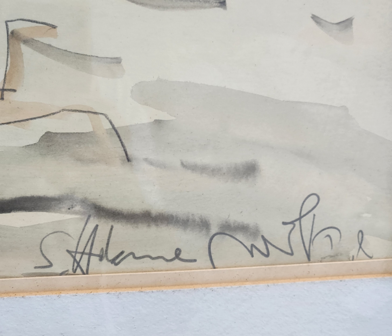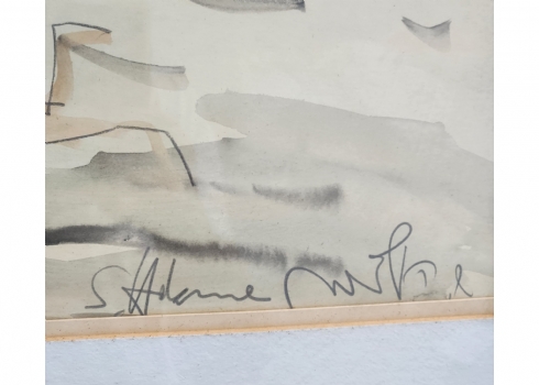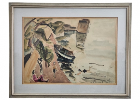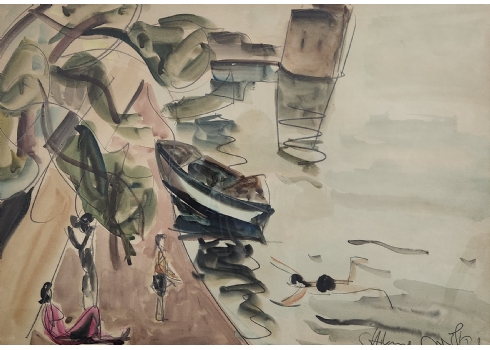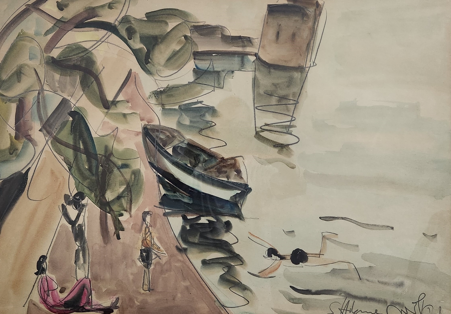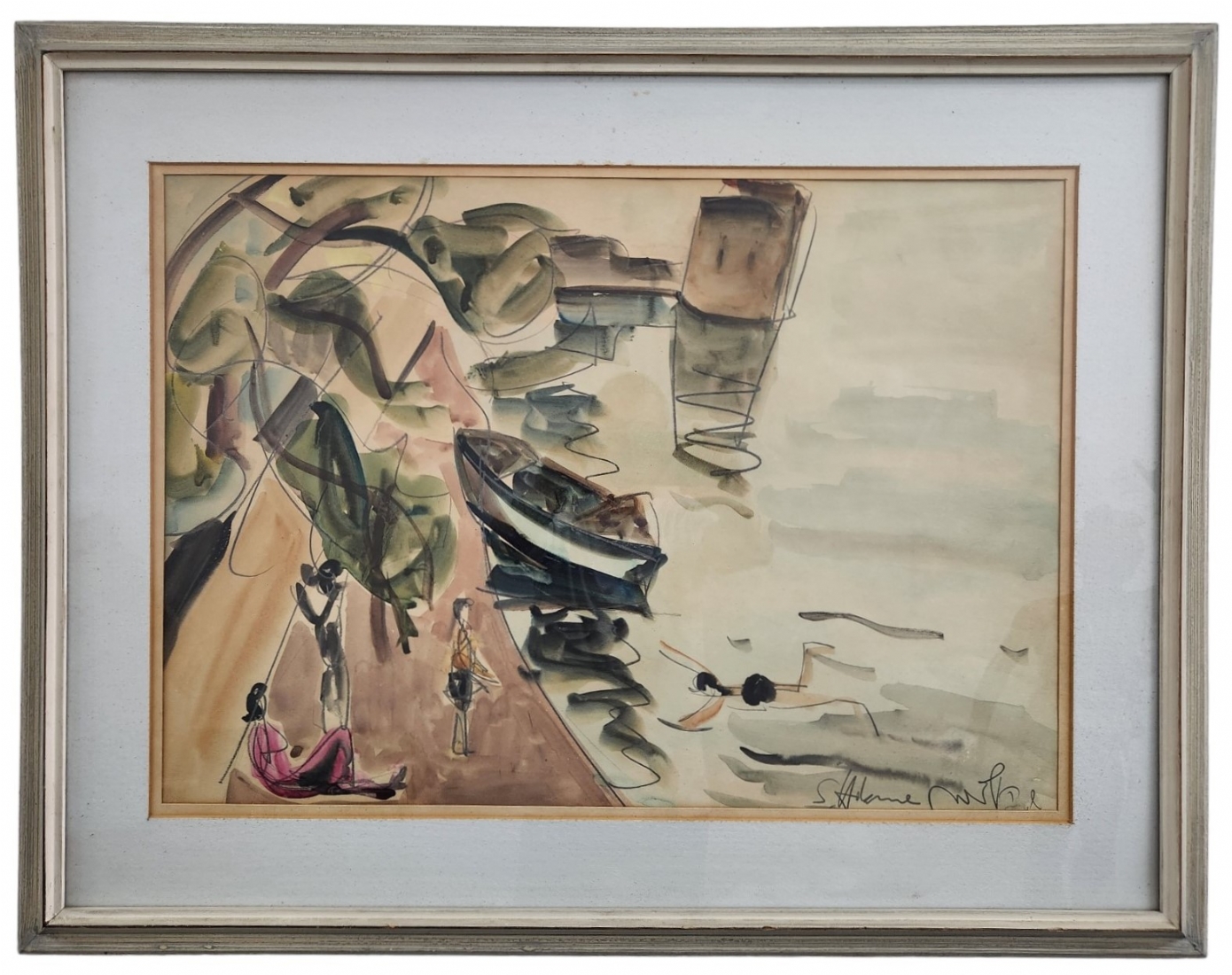 שמשון הולצמן (Shimshon Holzman) - 'סירה ונופשים בכנרת' - ציור גדול, רישום עיפרון ואקוורל על נייר, חתום, מידות: 48X68 ס"מ, מידות המסגרת: 69X89 ס"מ.